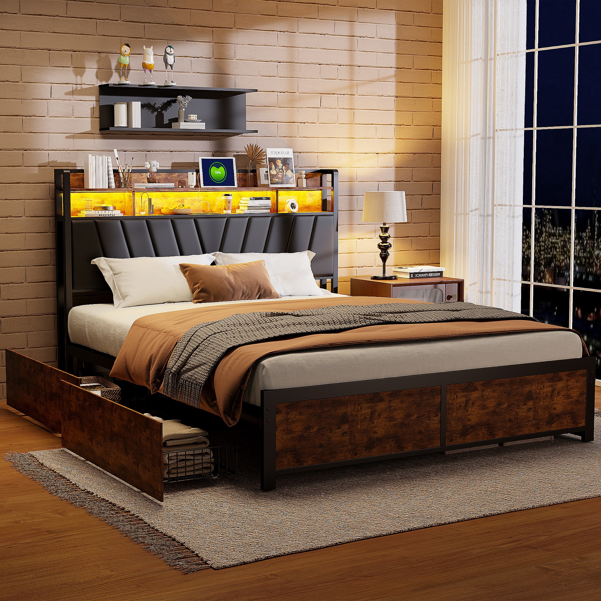 Cama de casal metálica 180x200 cm, com LED e USB, 4 gavetas, com estrado de ripas, preta