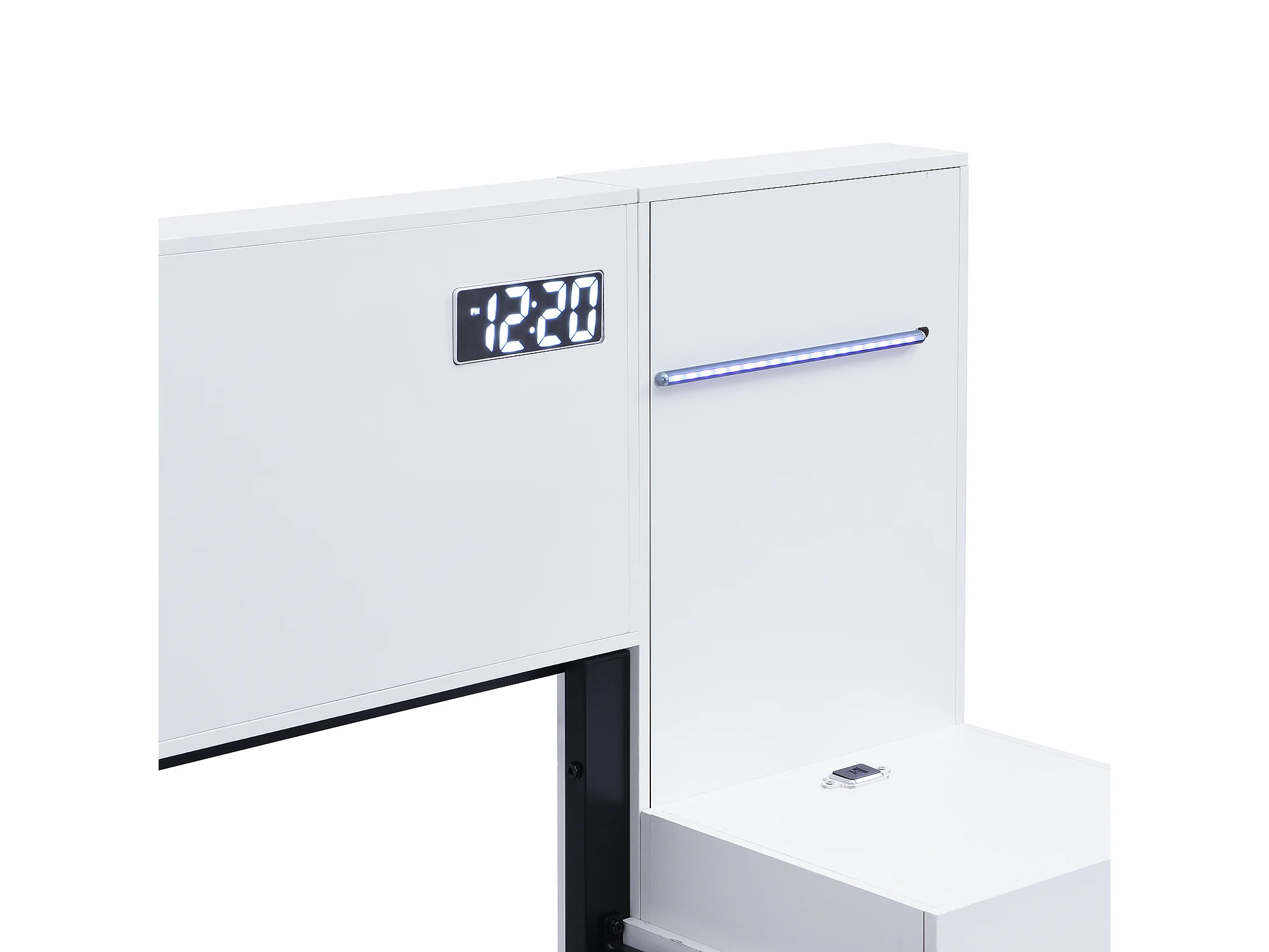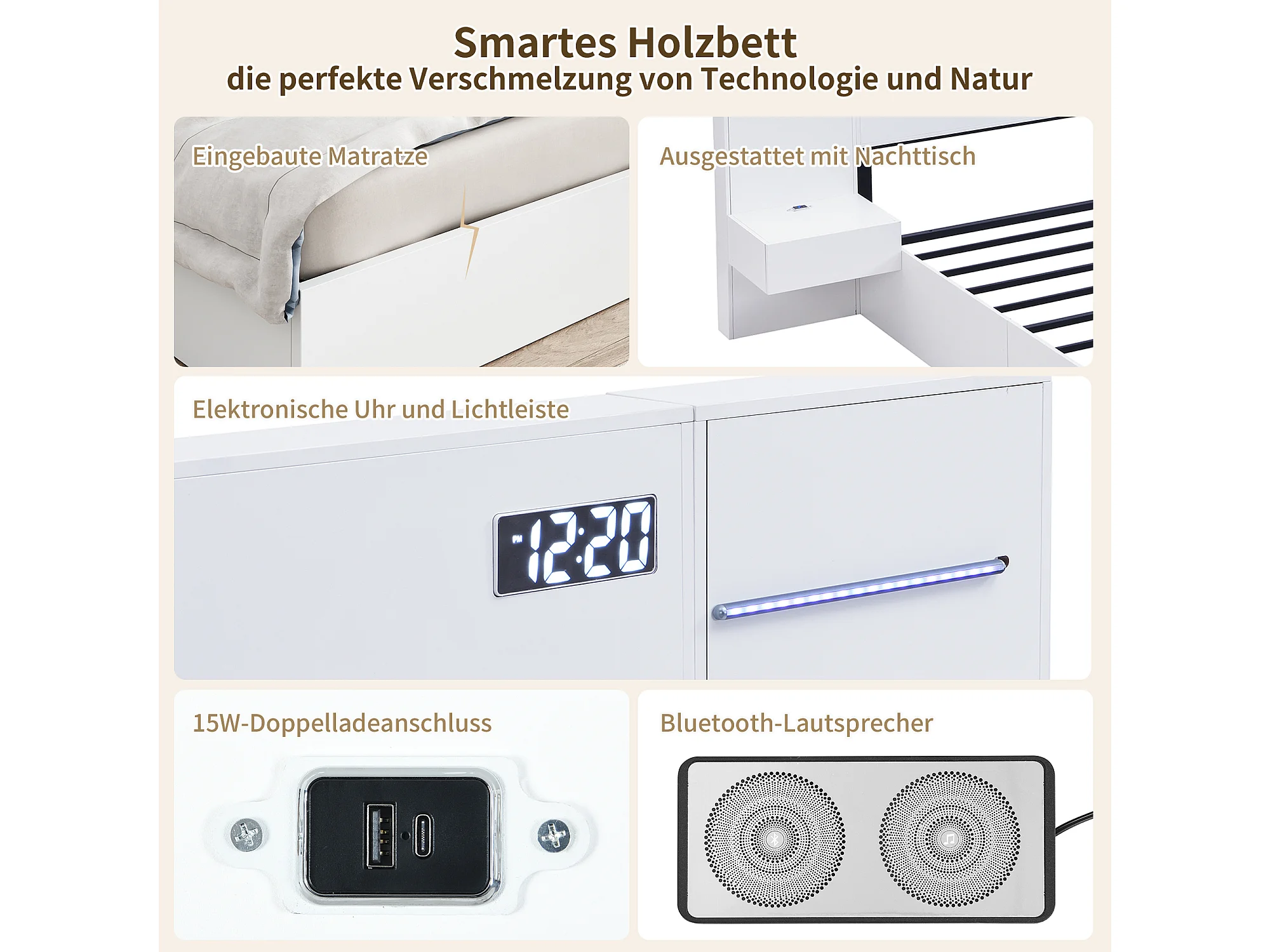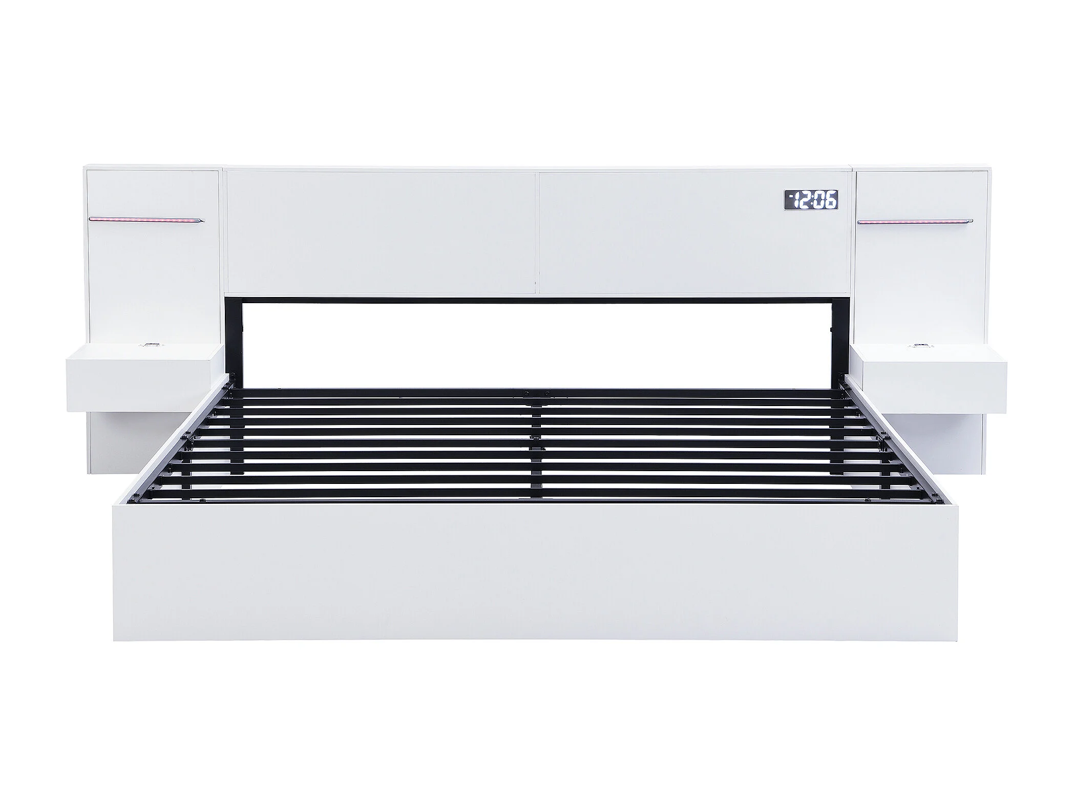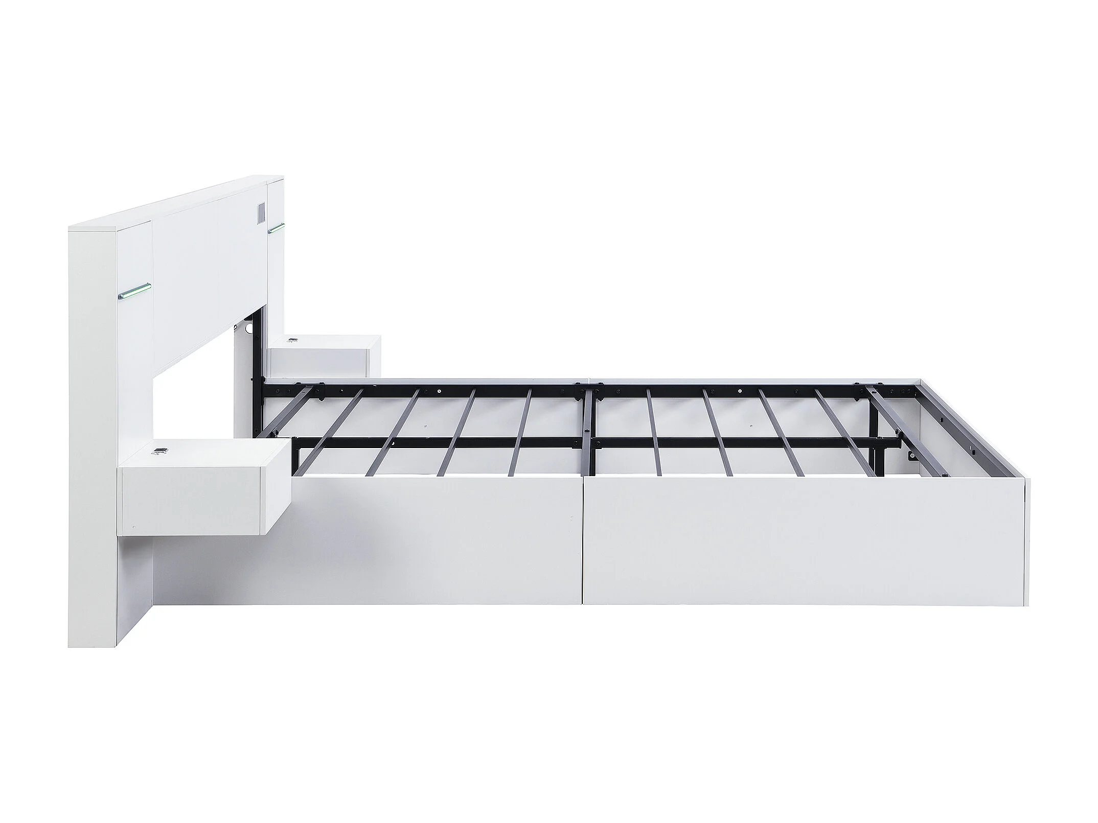 Cama de casal para adulto (180 x 200 cm) com porta USB, coluna Bluetooth e 2 mesas de cabeceira (sem gavetas) - Branca