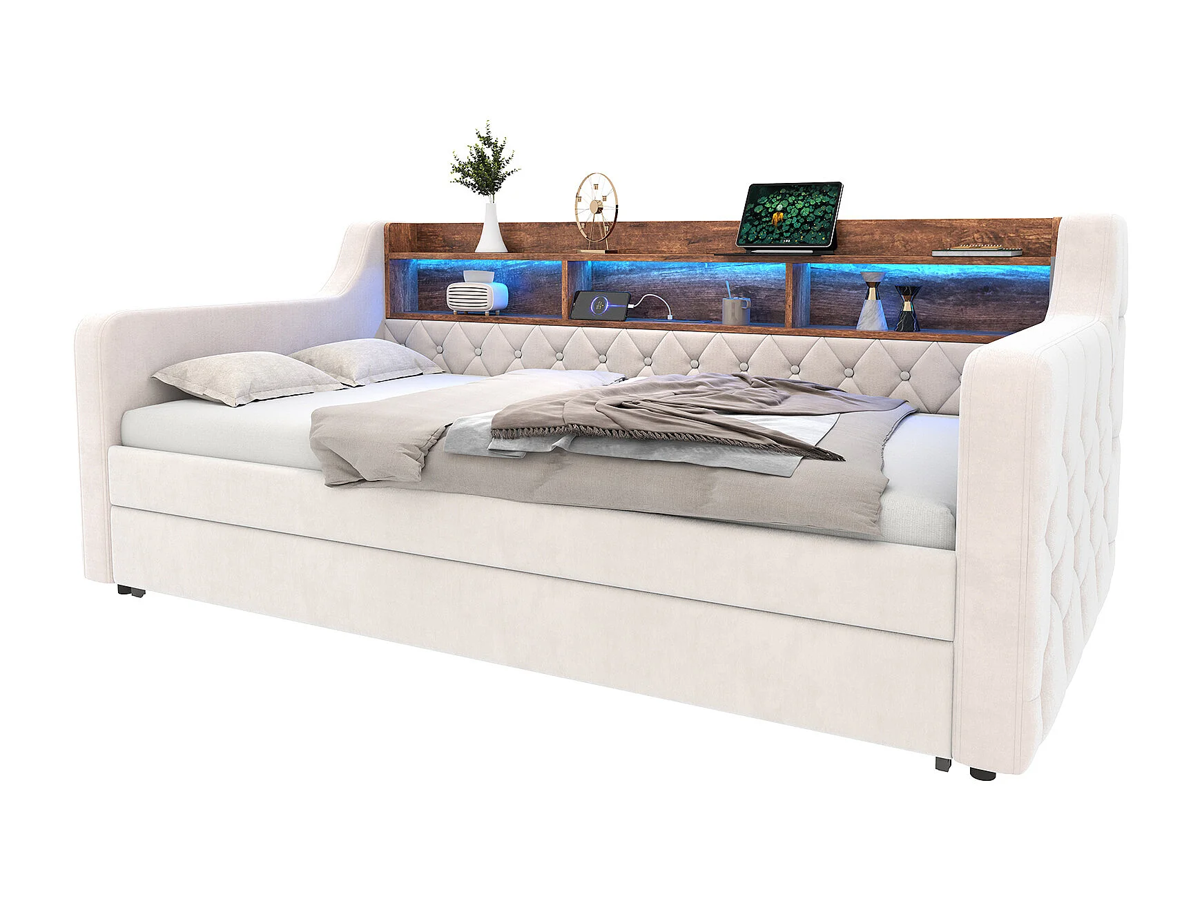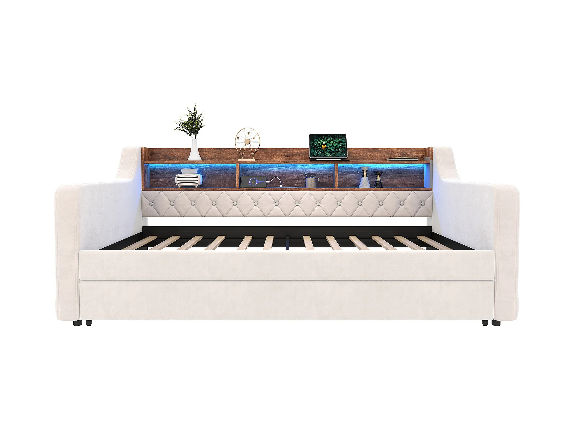 Cama de criança 90x190 cm - com prateleiras, porta USB Tipo-C, iluminação LED - veludo bege - colchão não incluído