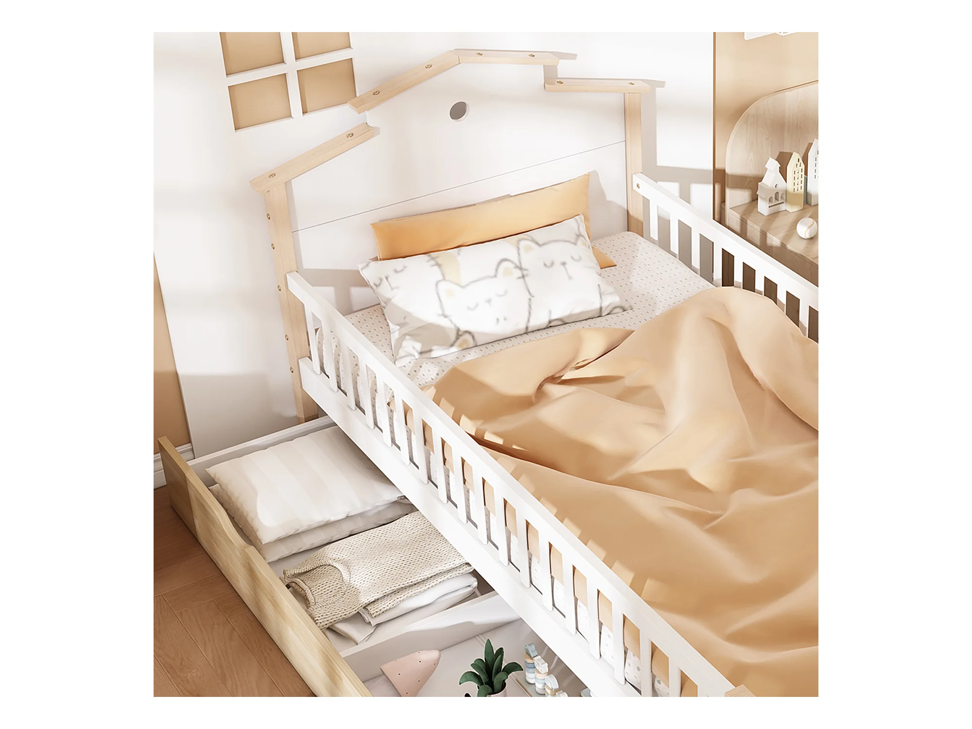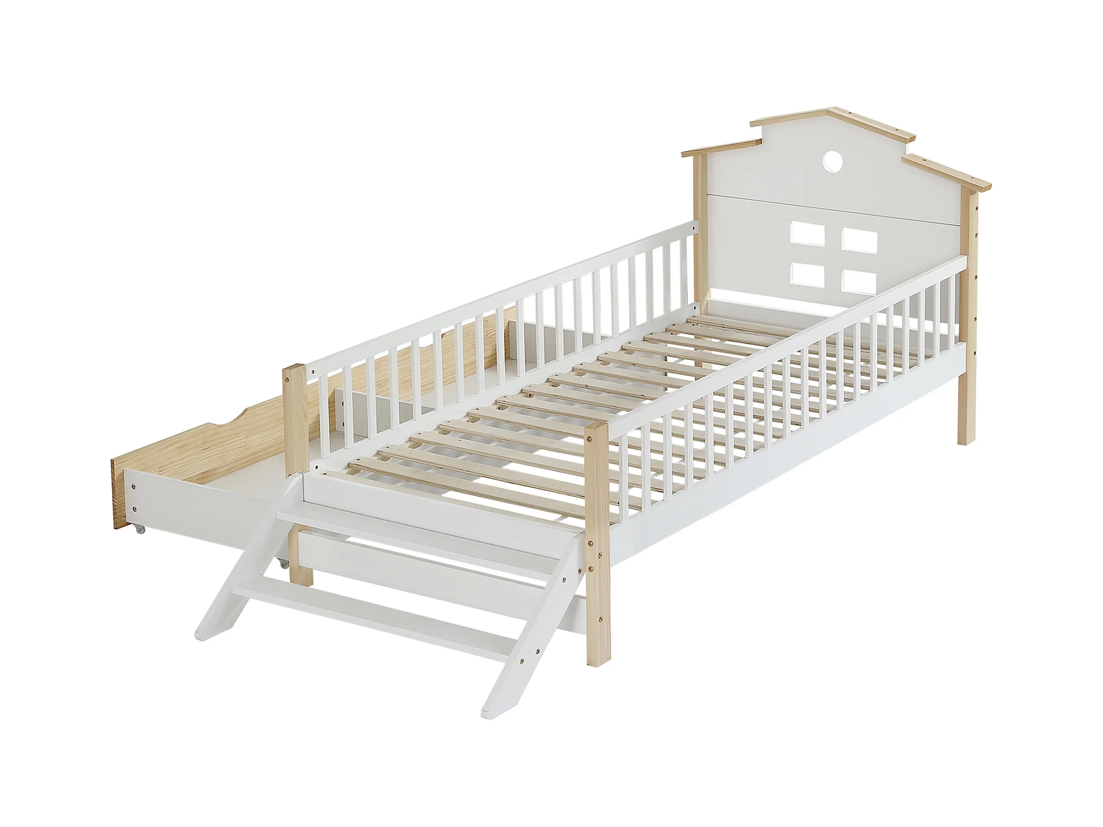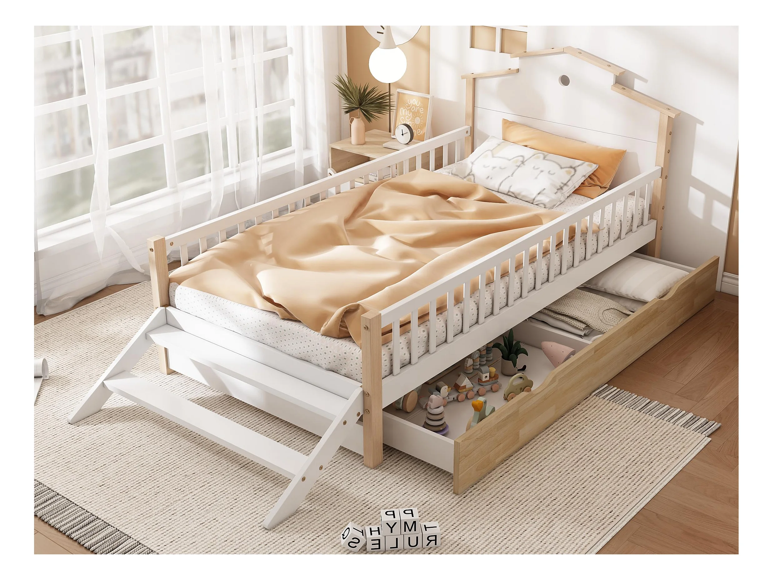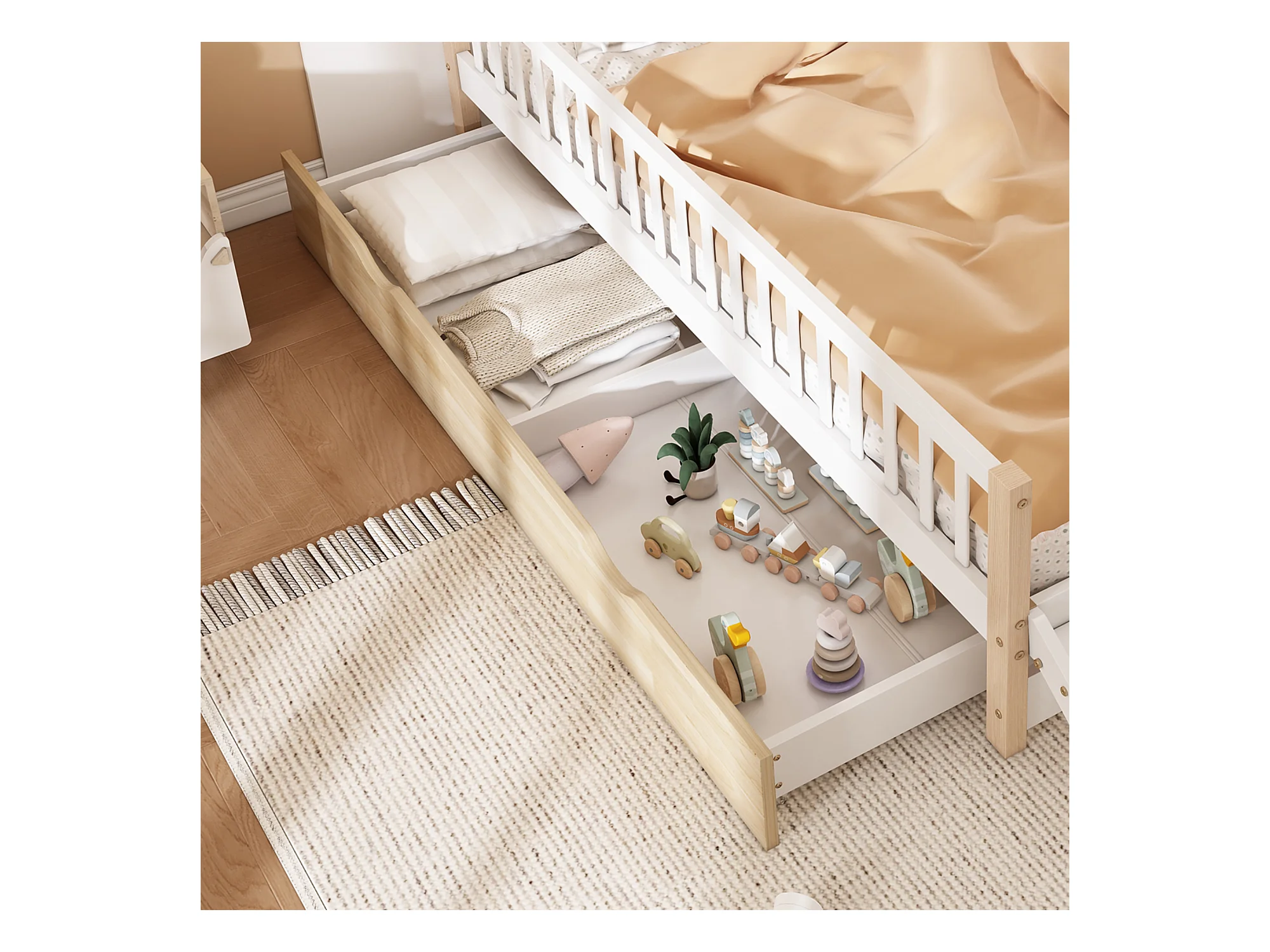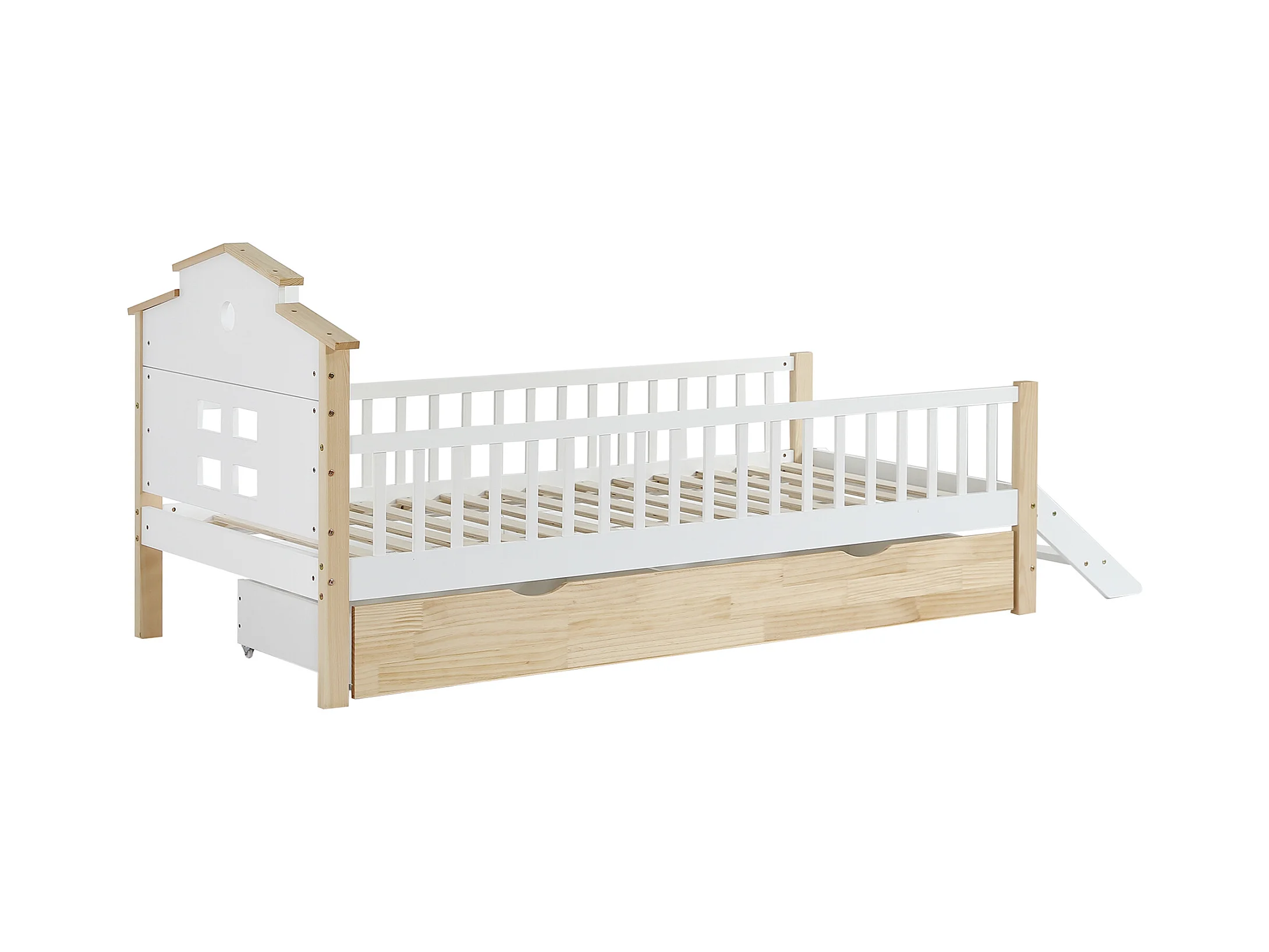 Cama de criança em madeira 90x200cm - com barreiras de segurança e gavetas - Branco e Natural
