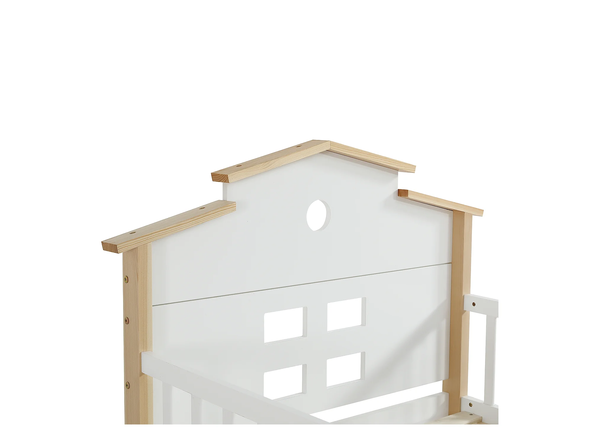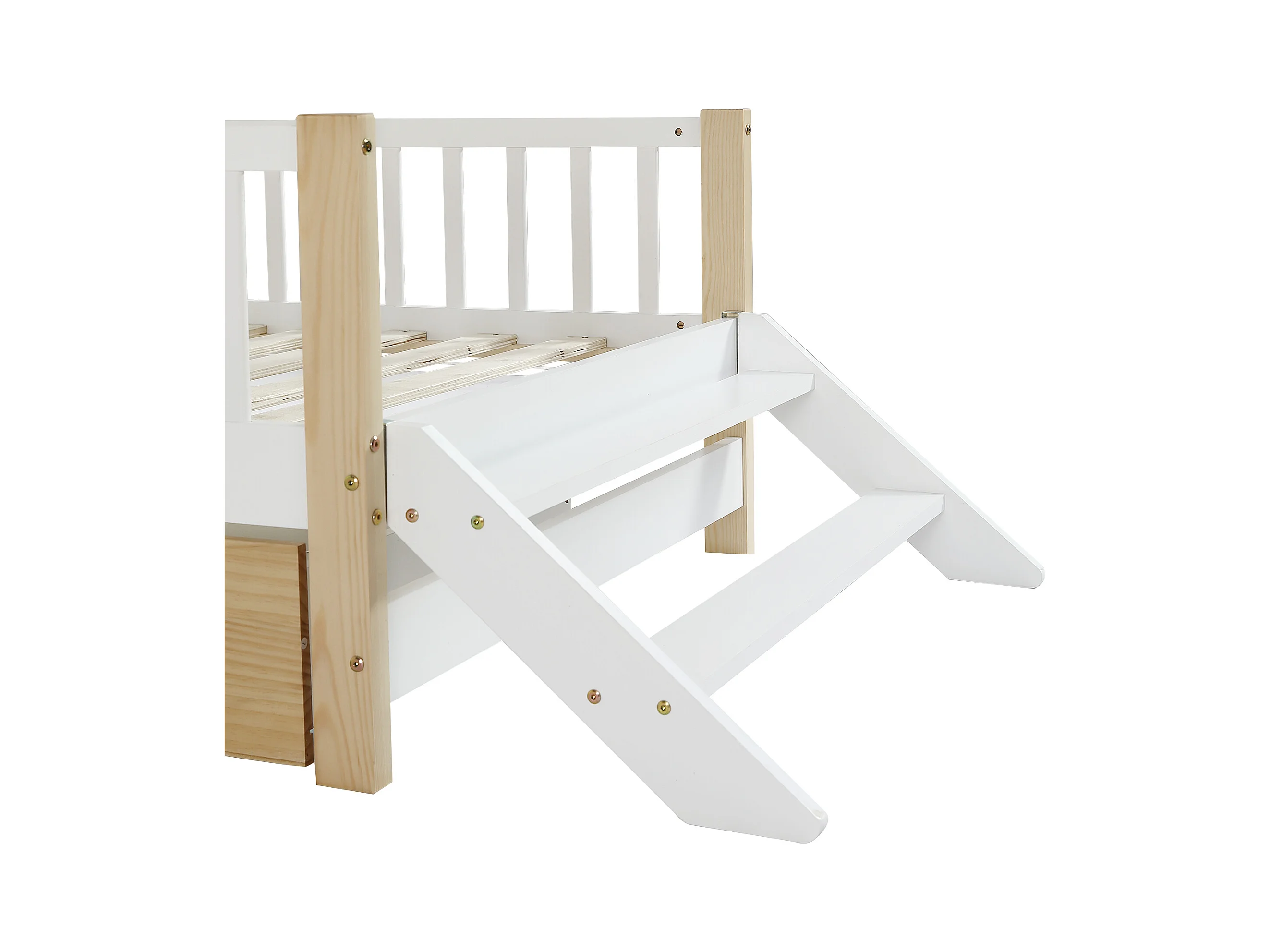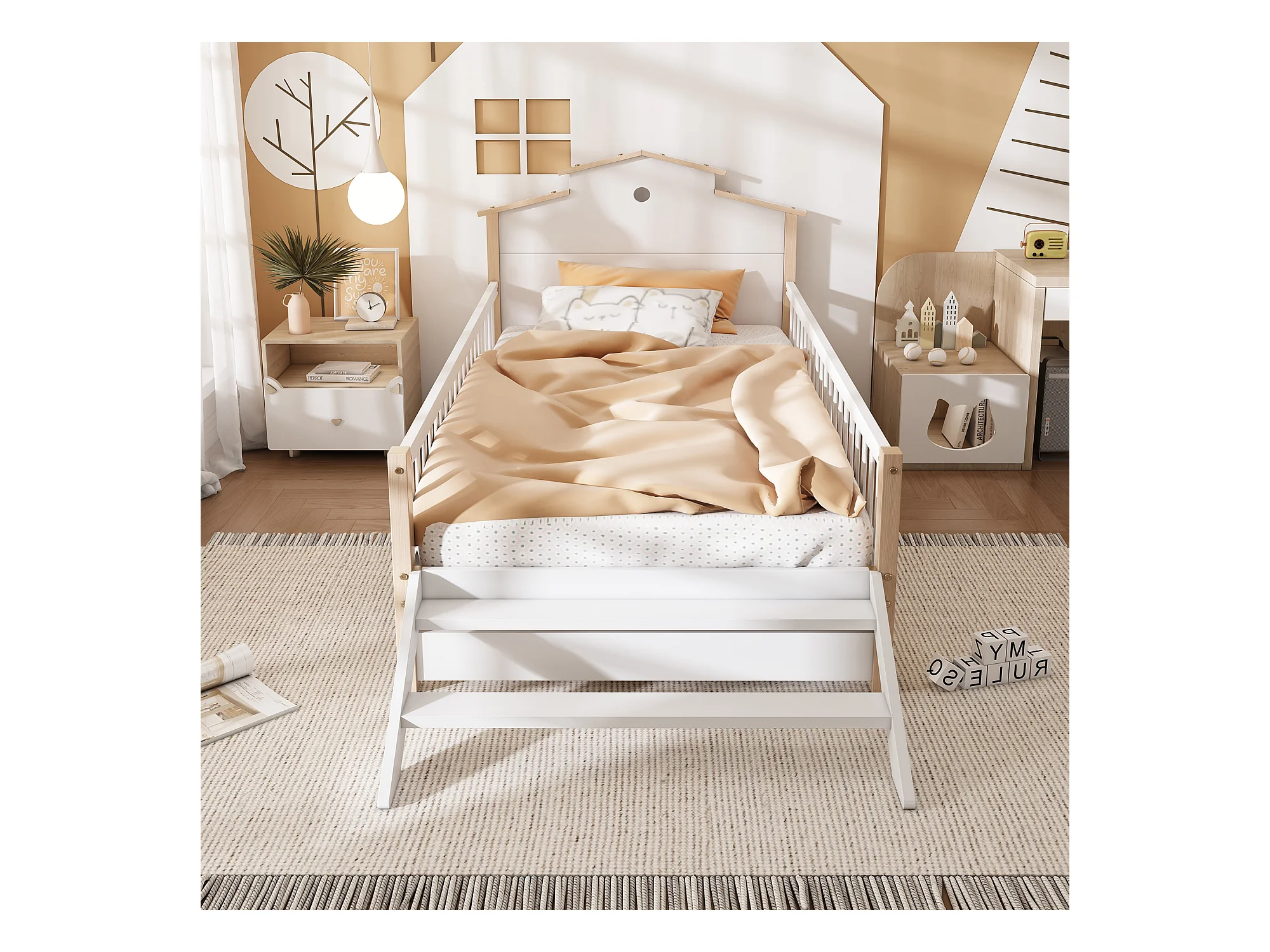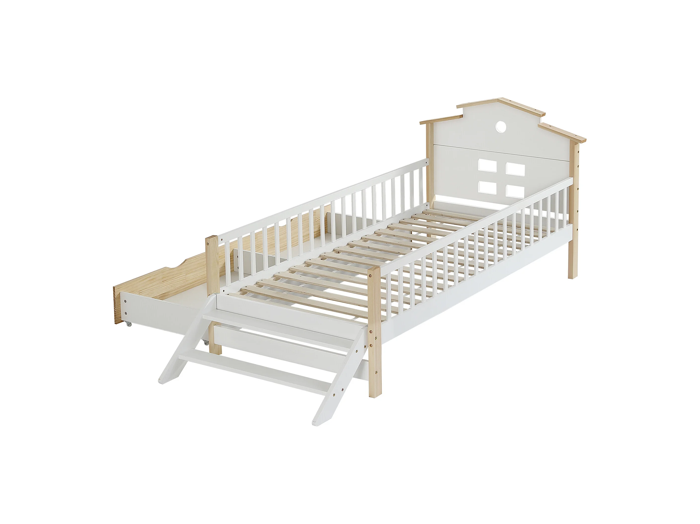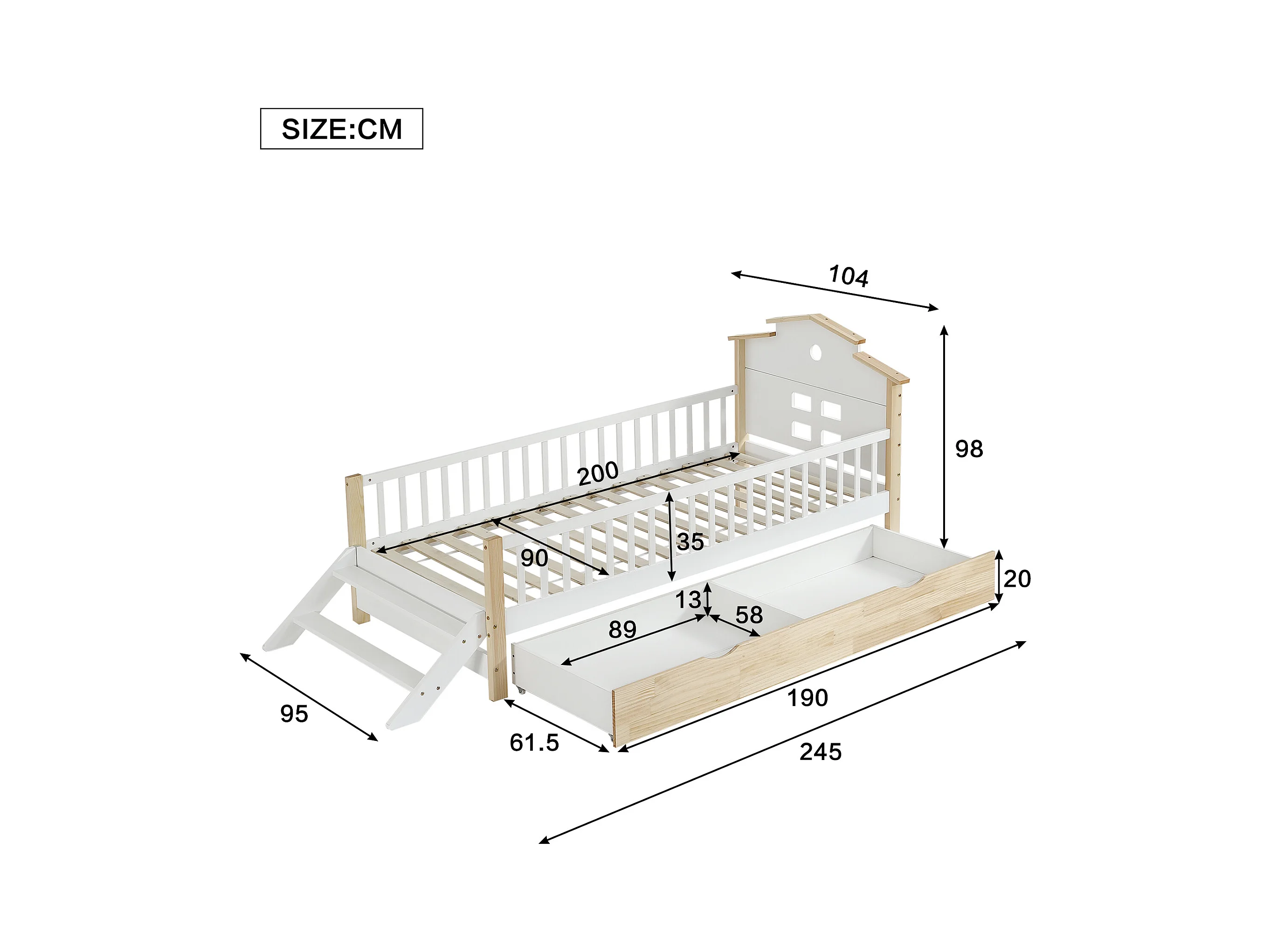 Cama de criança em madeira 90x200cm - com barreiras de segurança e gavetas - Branco e Natural