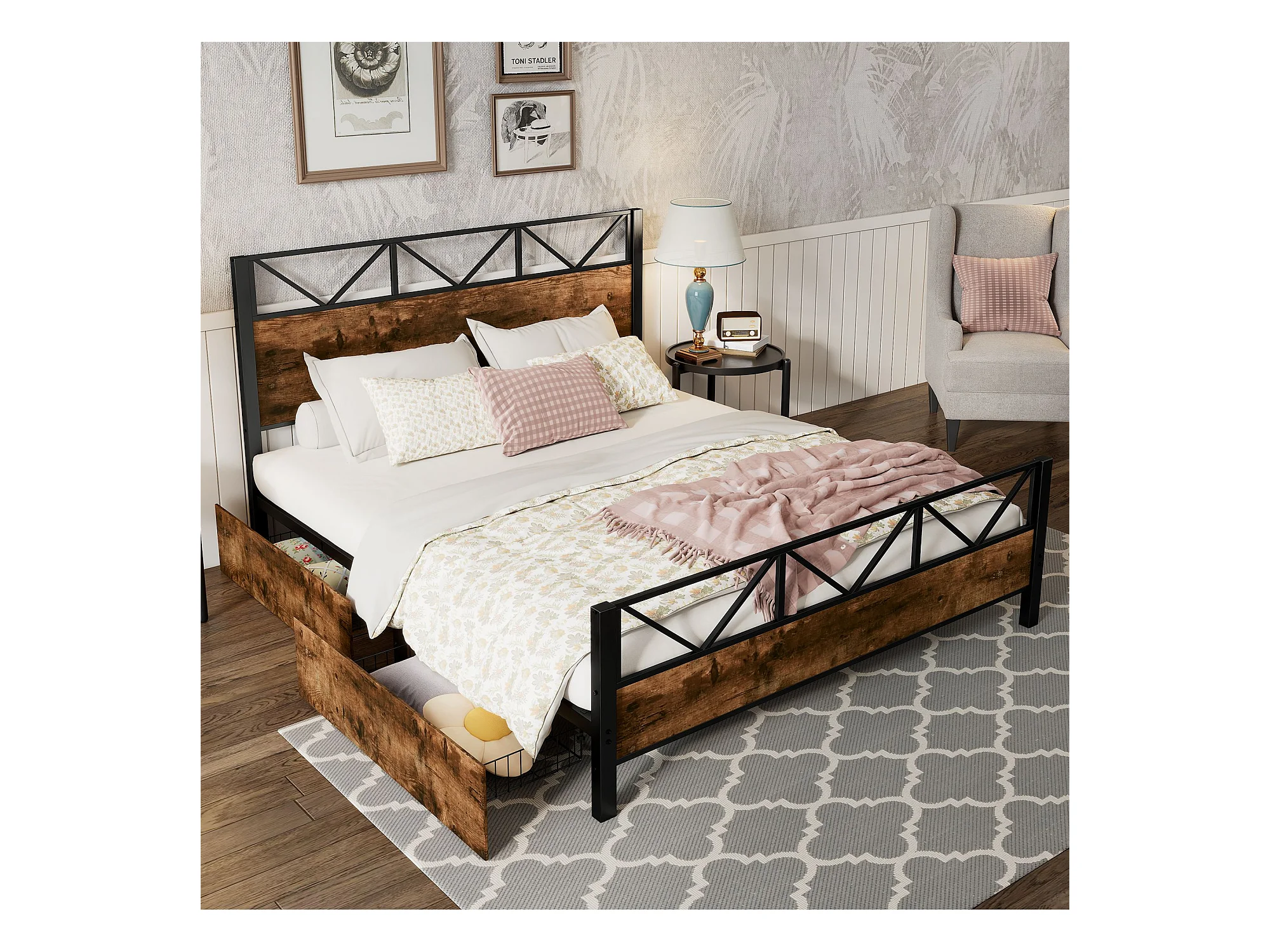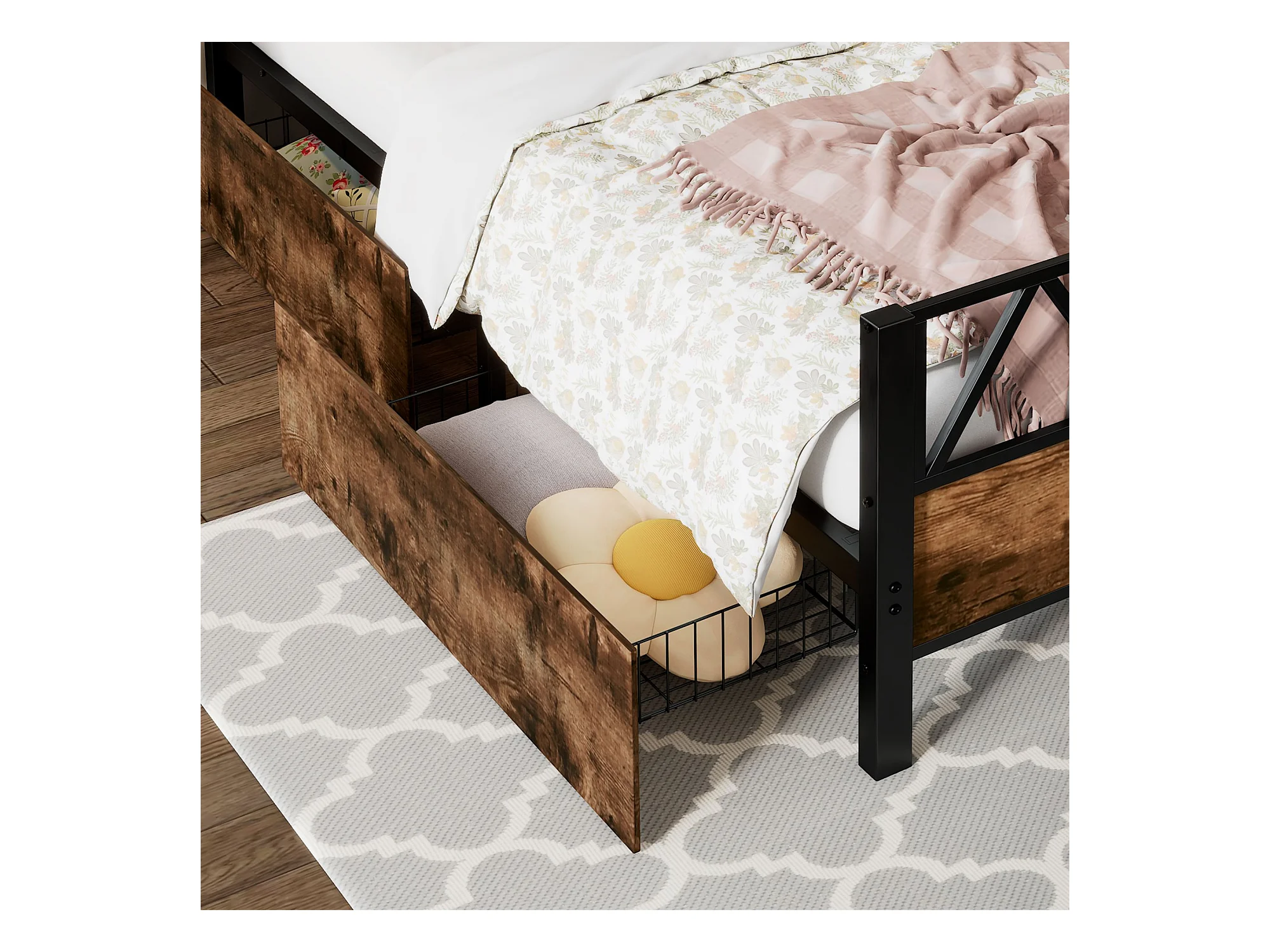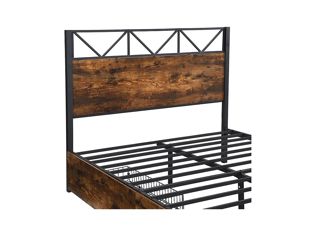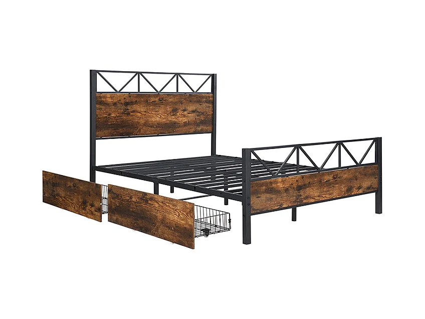 Cama de metal Cama de casal 140x200 cm, duas gavetas com rodízios, Estrutura de metal, base plana, metal + MDF, preto + nogueira