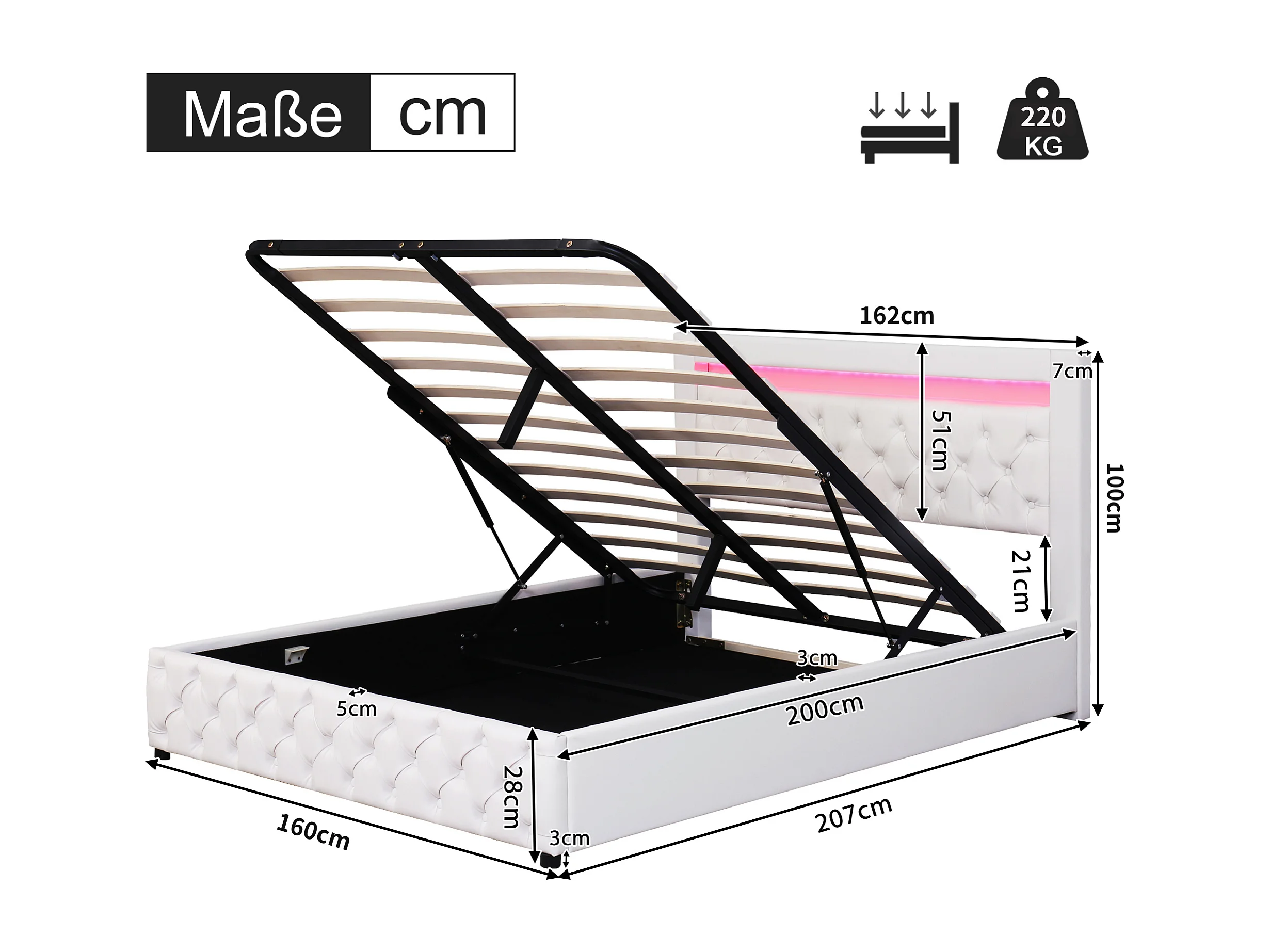 Cama de PU branca 160x200 com LED integrado, base de ripas e amplo espaço de armazenamento, design funcional