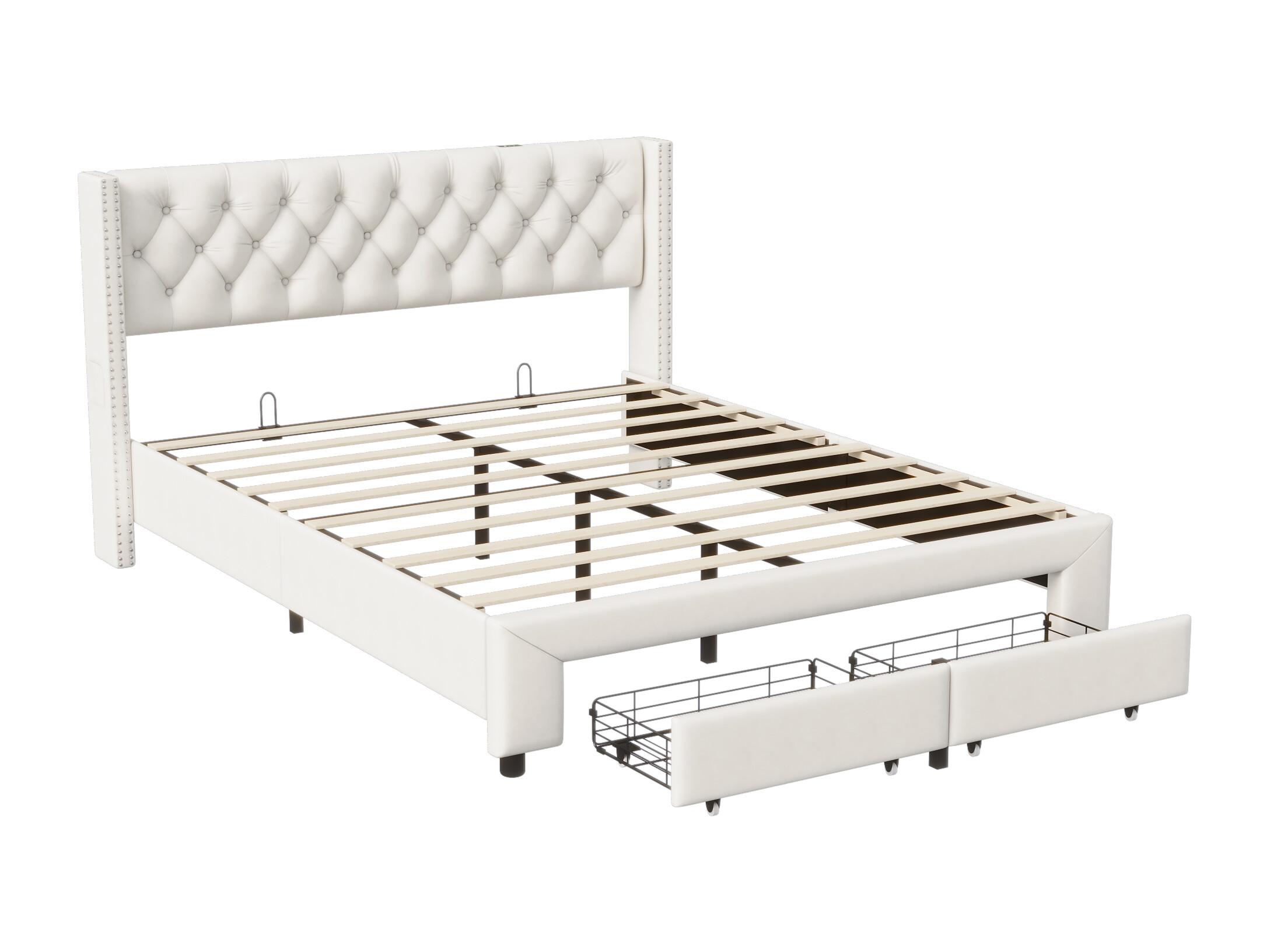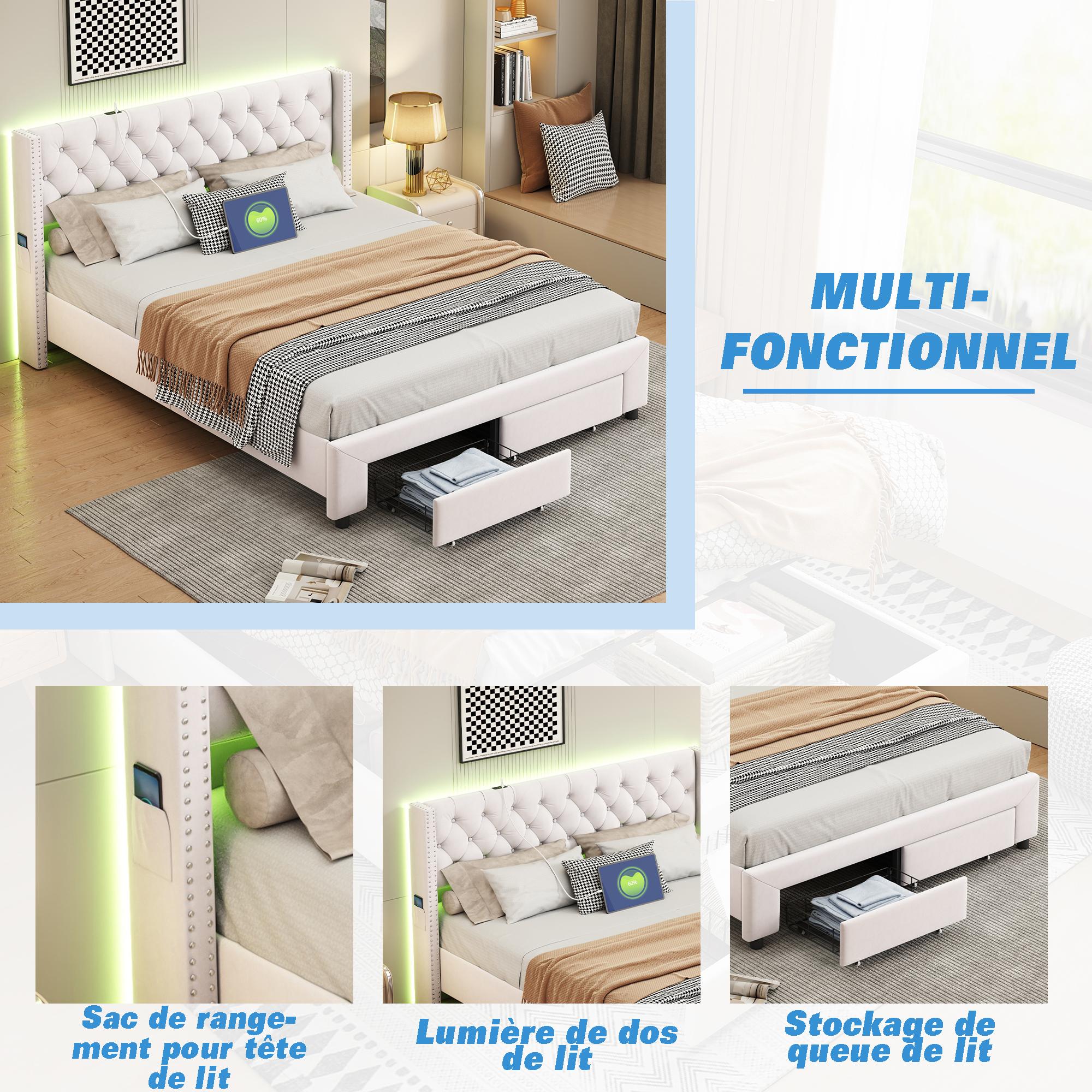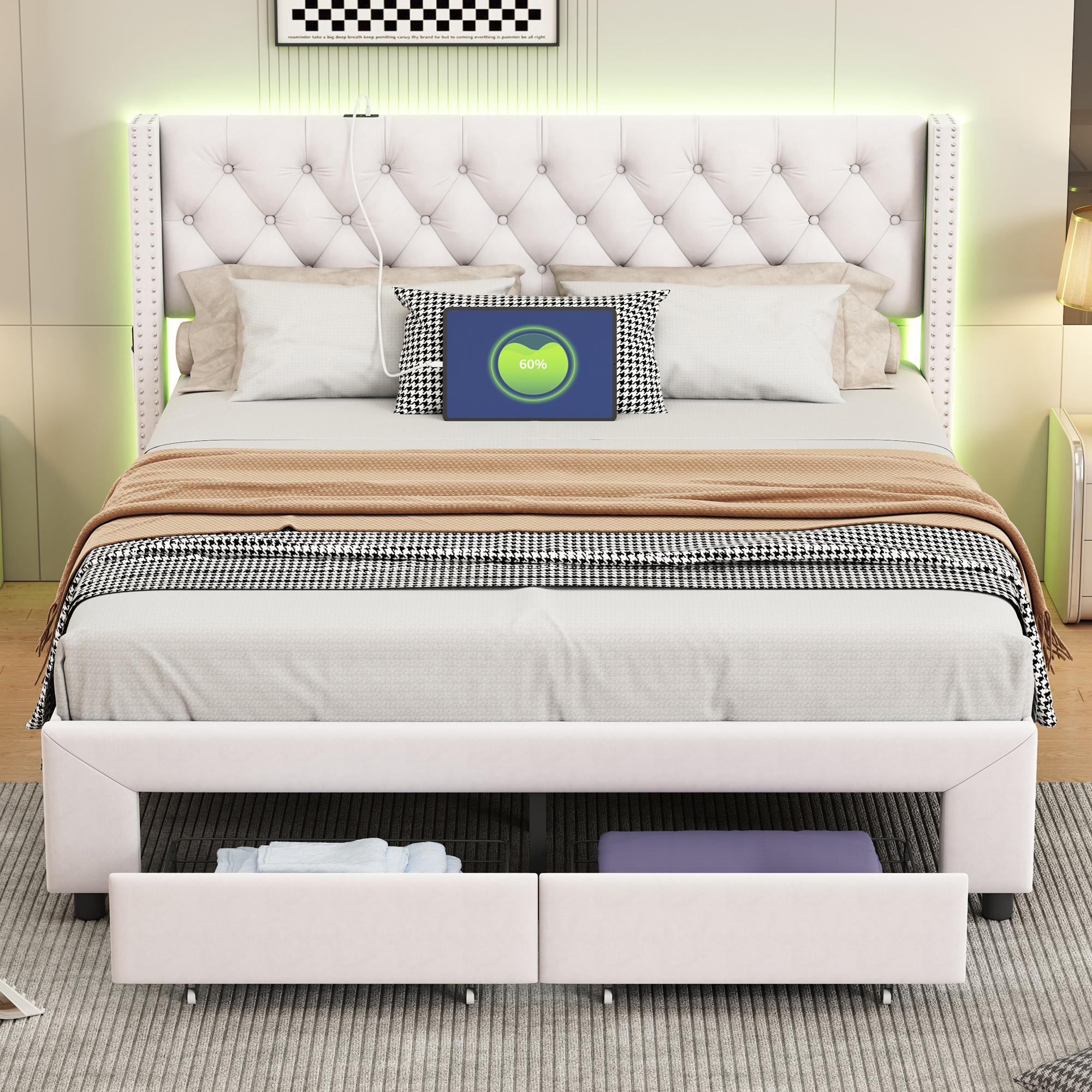 Estrutura de cama 160 x 200 com gavetas, cama estofada com LED e USB, cama estofada em veludo, bege