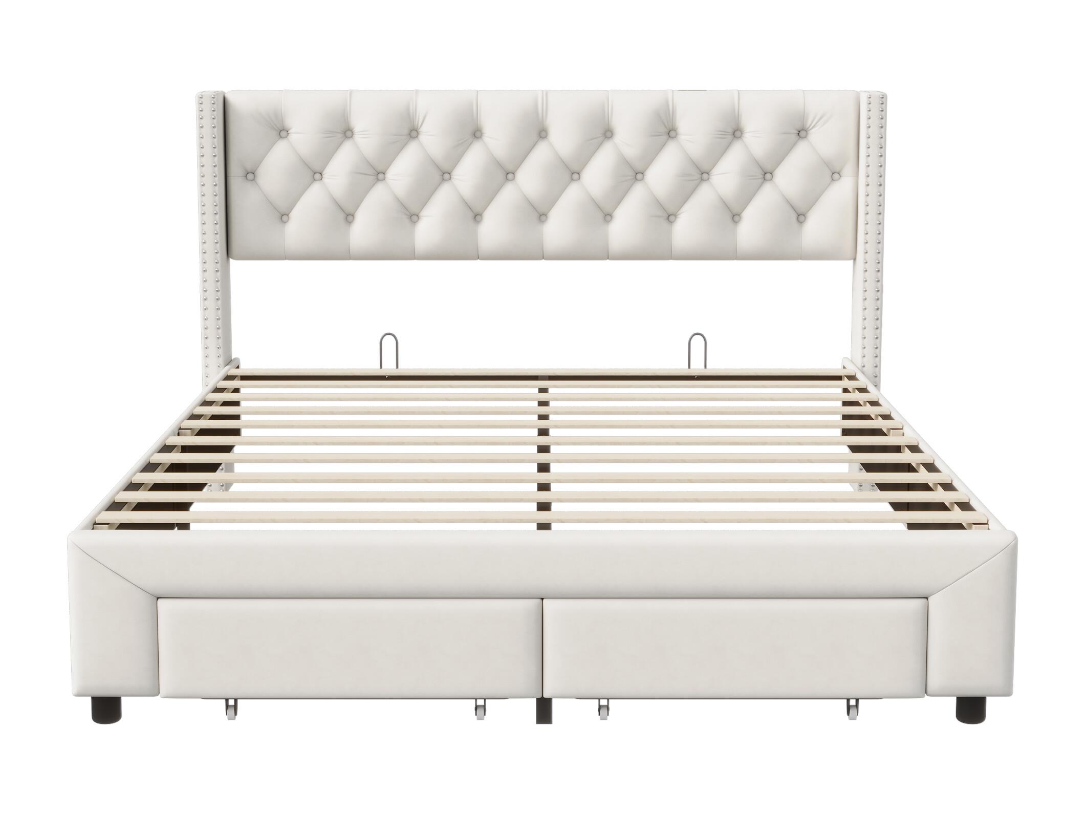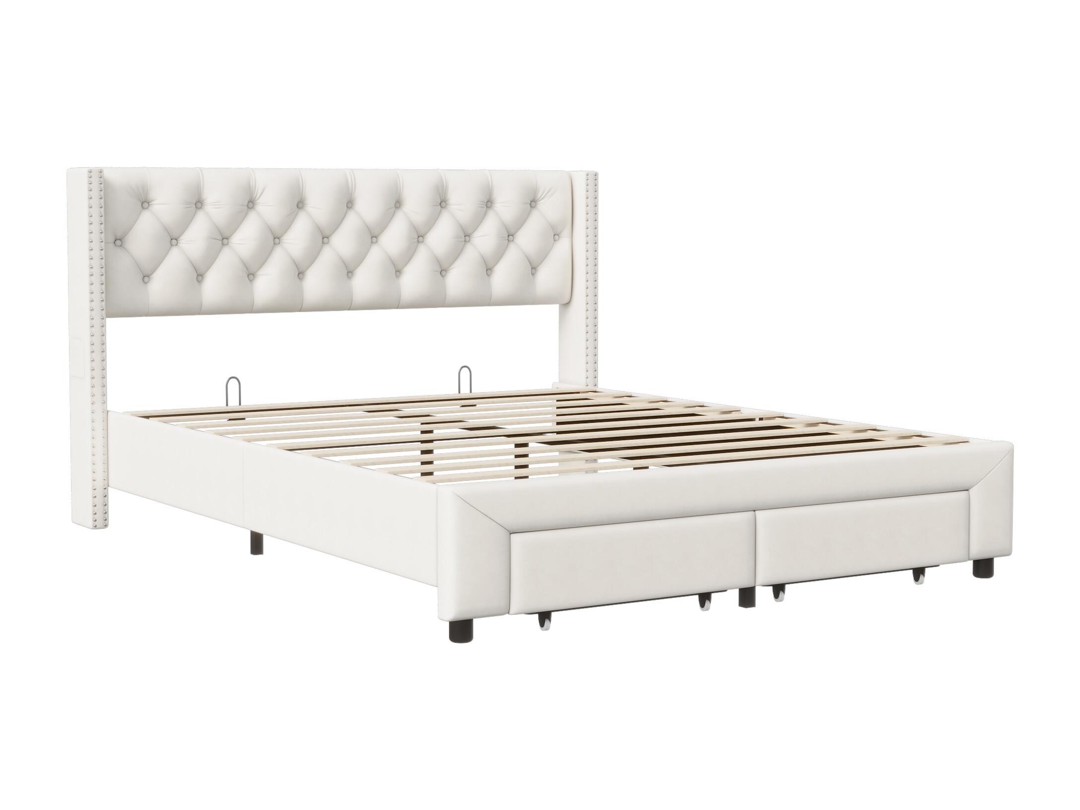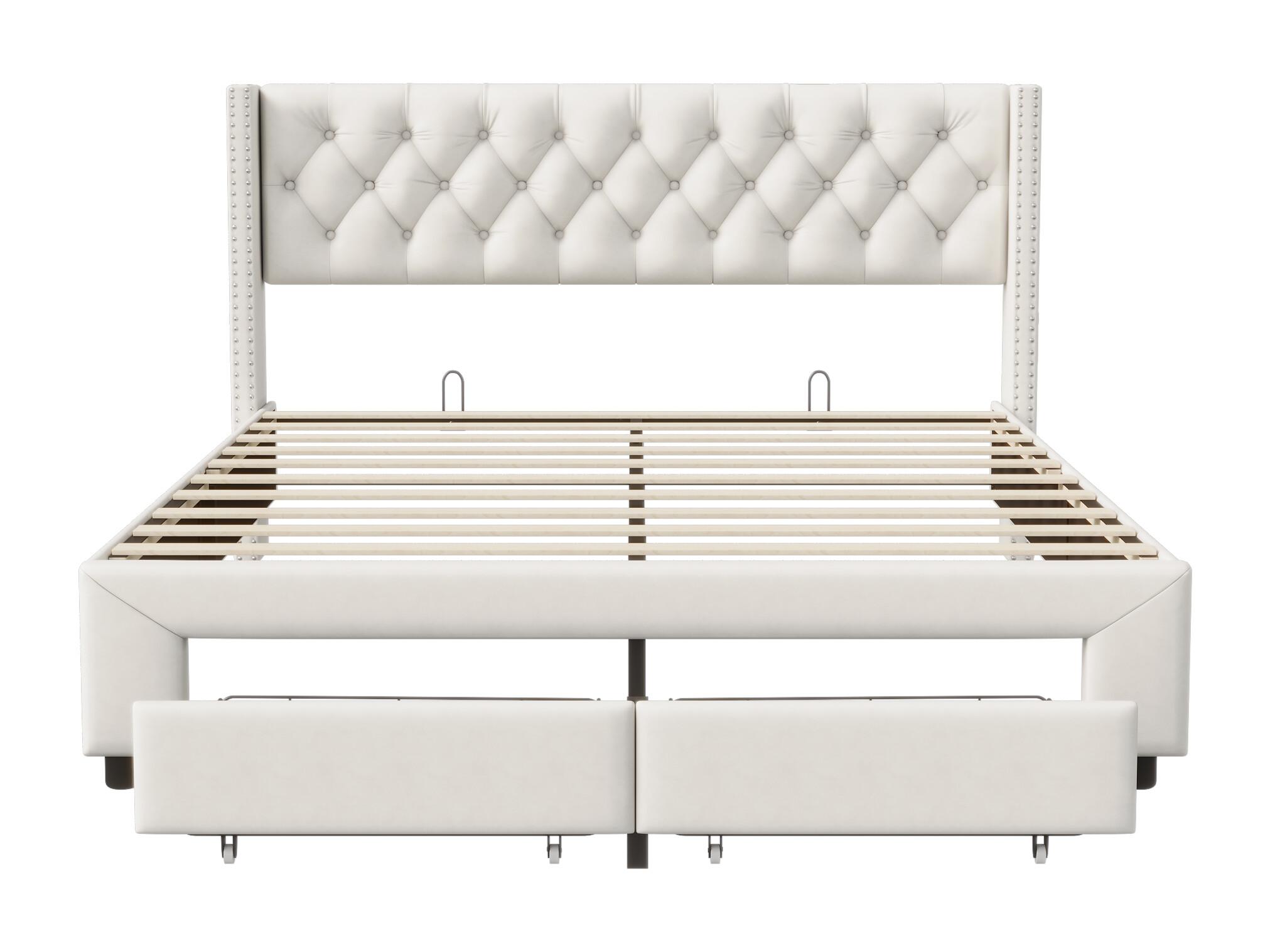 Estrutura de cama 160 x 200 com gavetas, cama estofada com LED e USB, cama estofada em veludo, bege