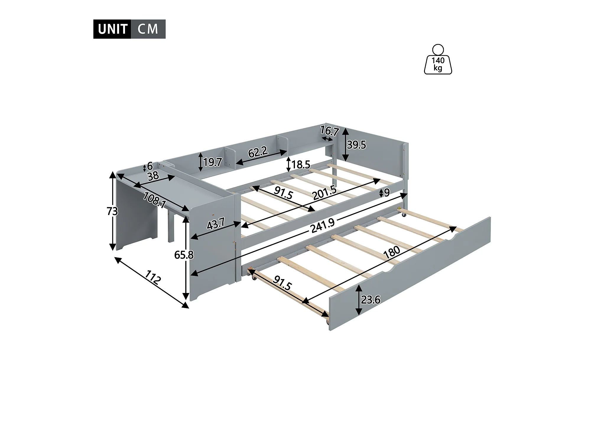 Cama de rodízio 90 x 200 cm + 90 x 180 cm com mesa e 3 prateleiras - madeira maciça de pinho - base de ripas - cinza