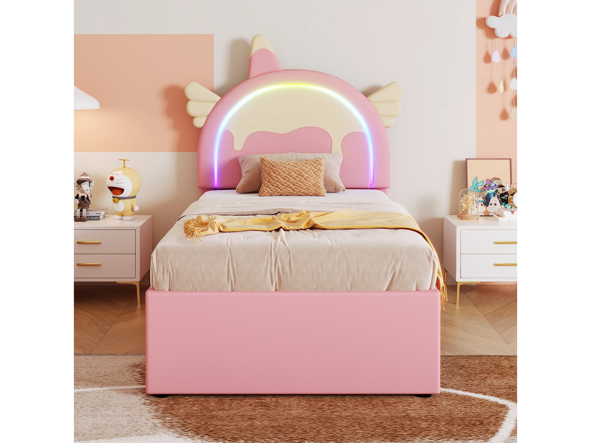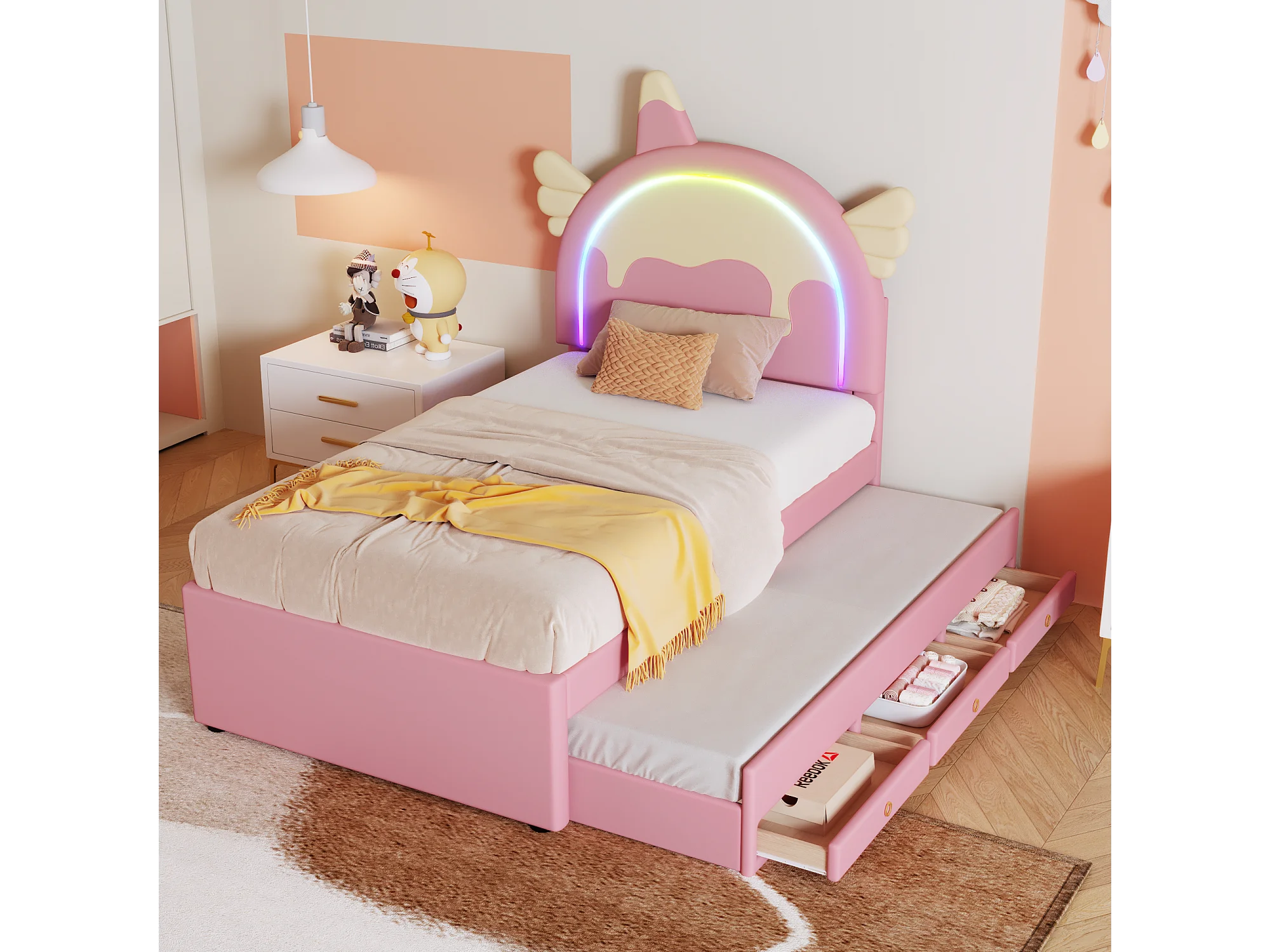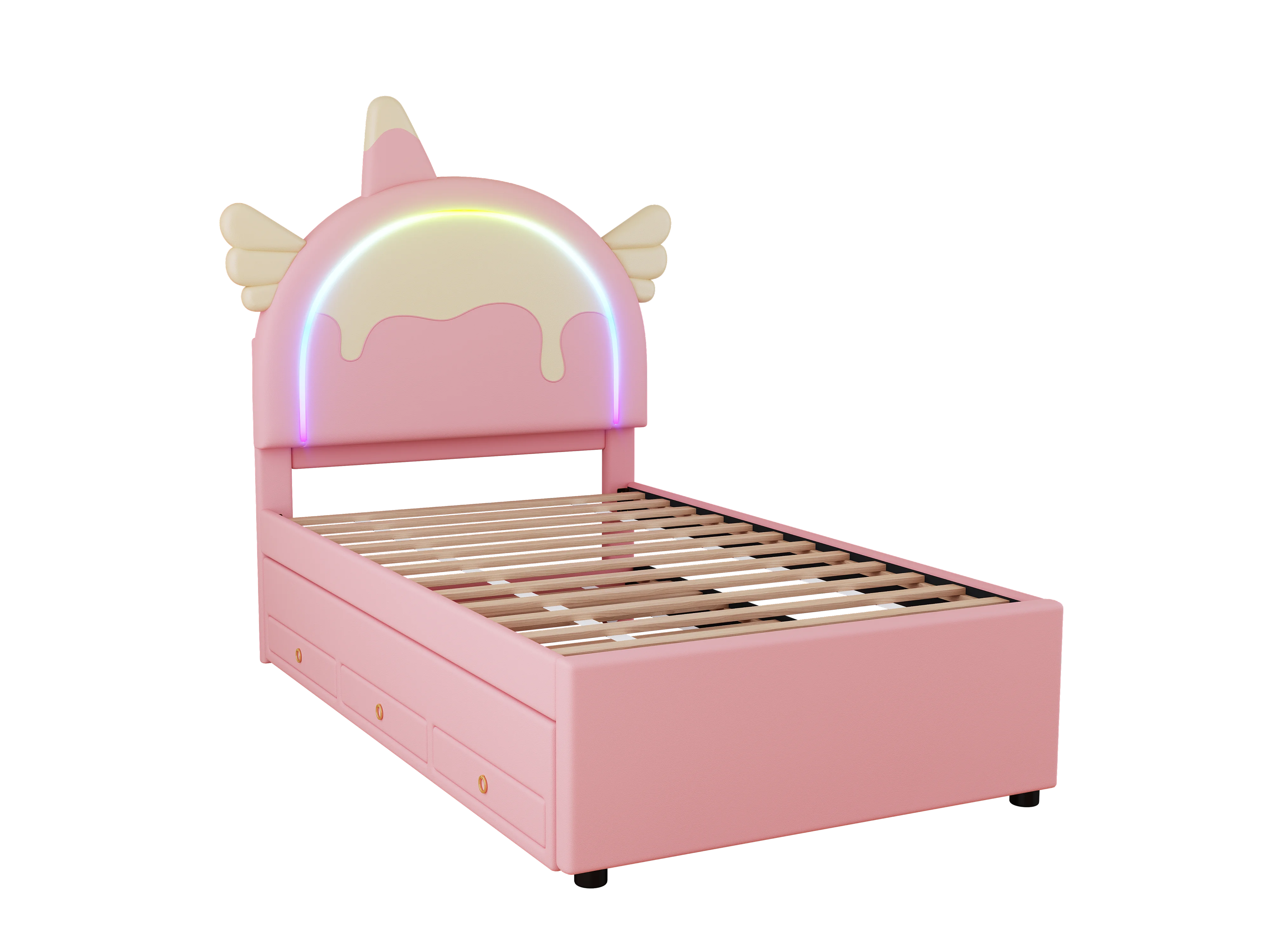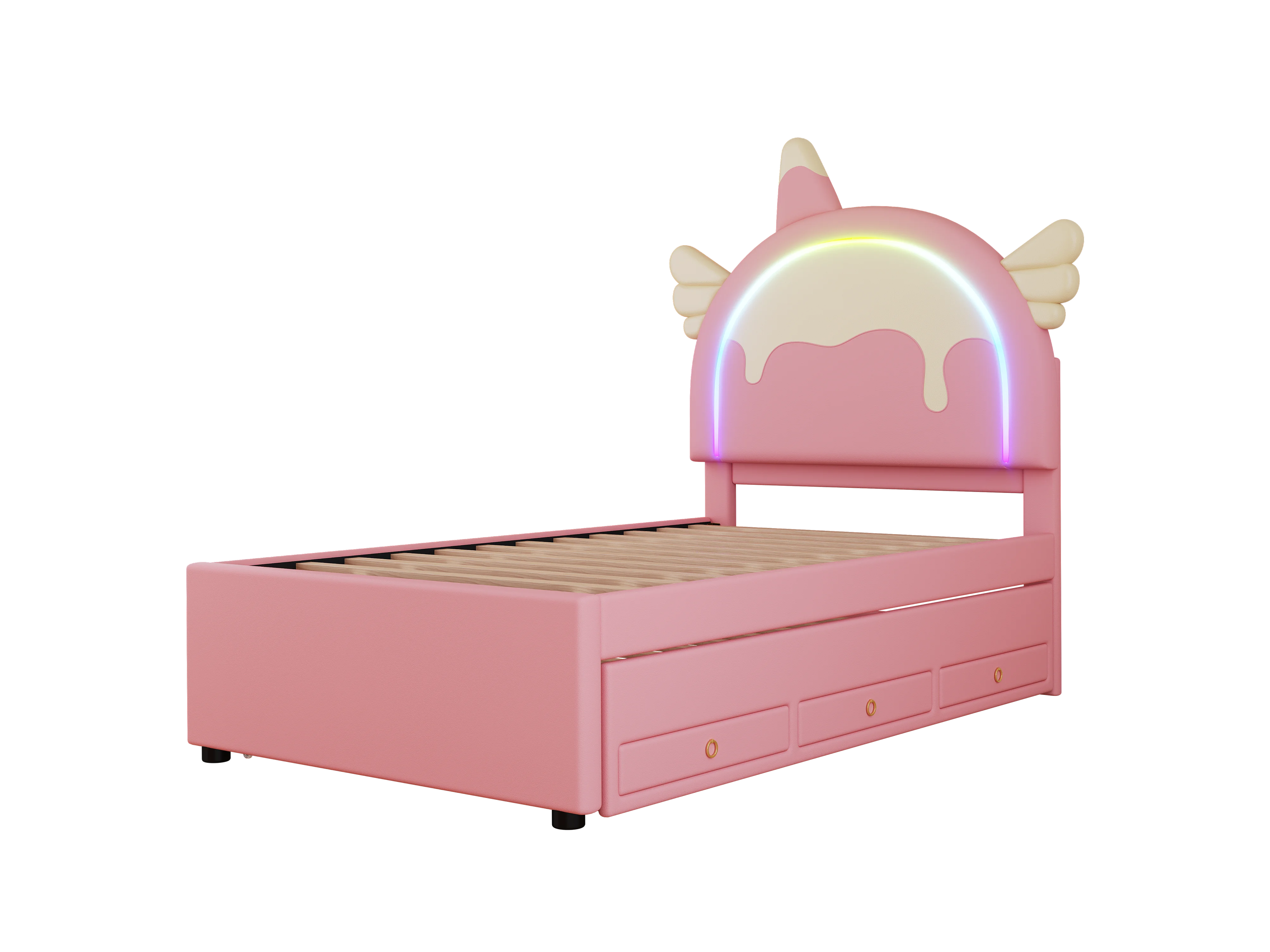 Cama de rodízio 90x200cm+90x190cm, cama de criança com 3 gavetas, estrado de ripas e cabeceira em forma de unicórnio, material PU, rosa