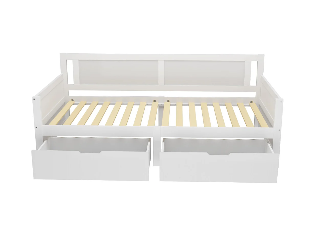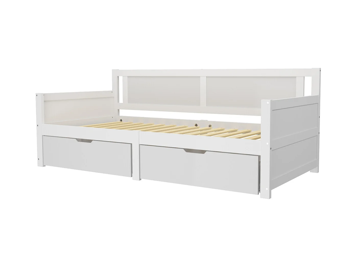 Cama de solteiro 90x200cm com 2 gavetas, estrutura de madeira maciça, com estrado de ripas, branca