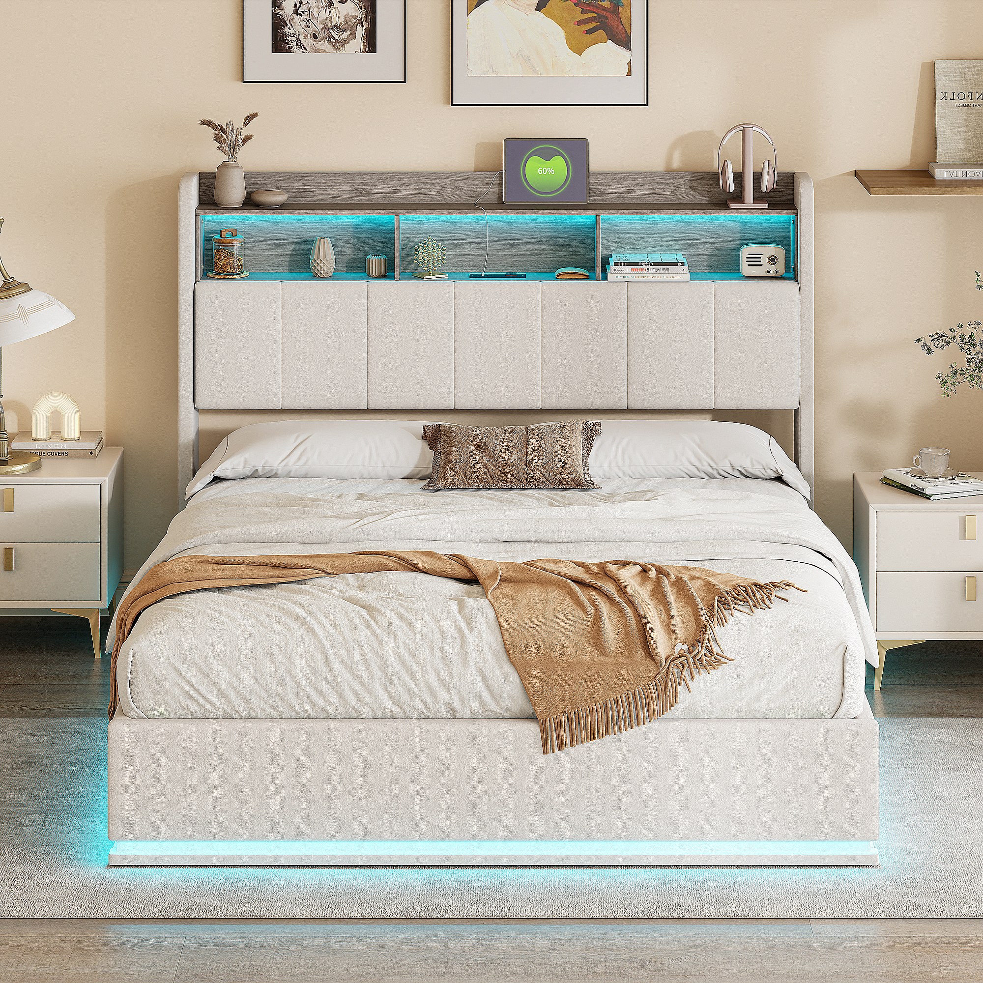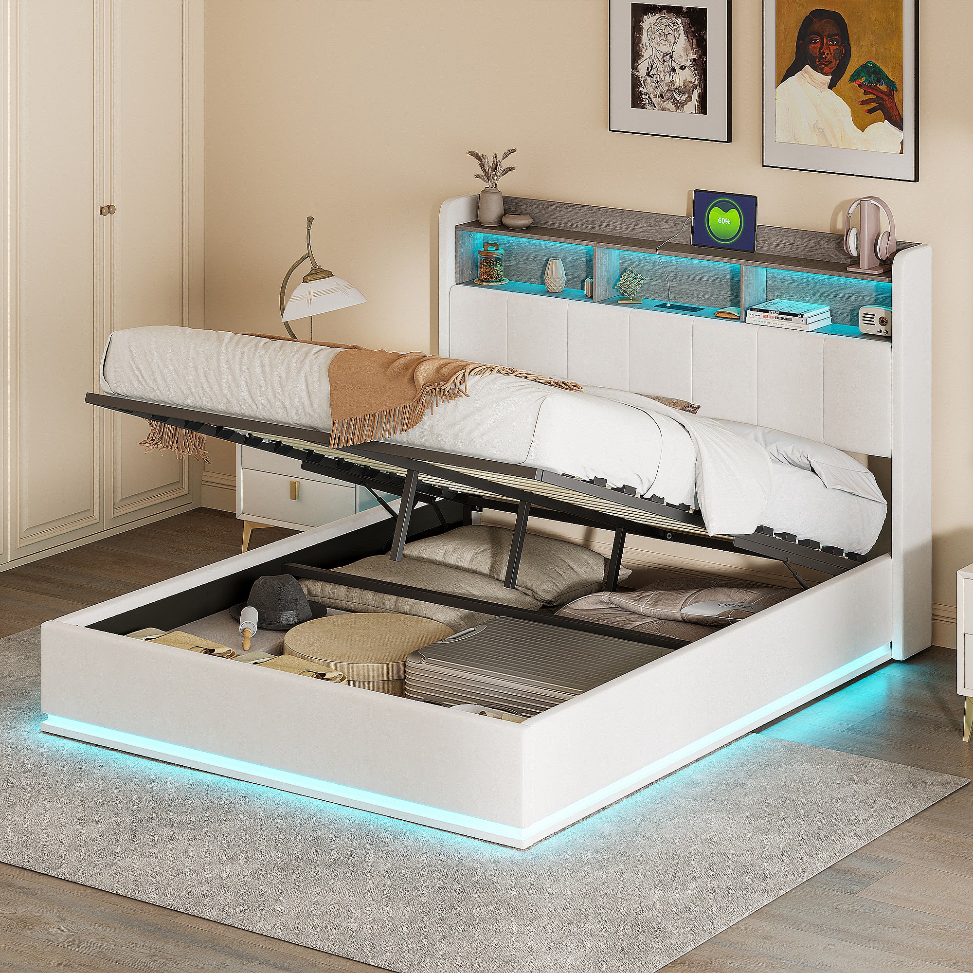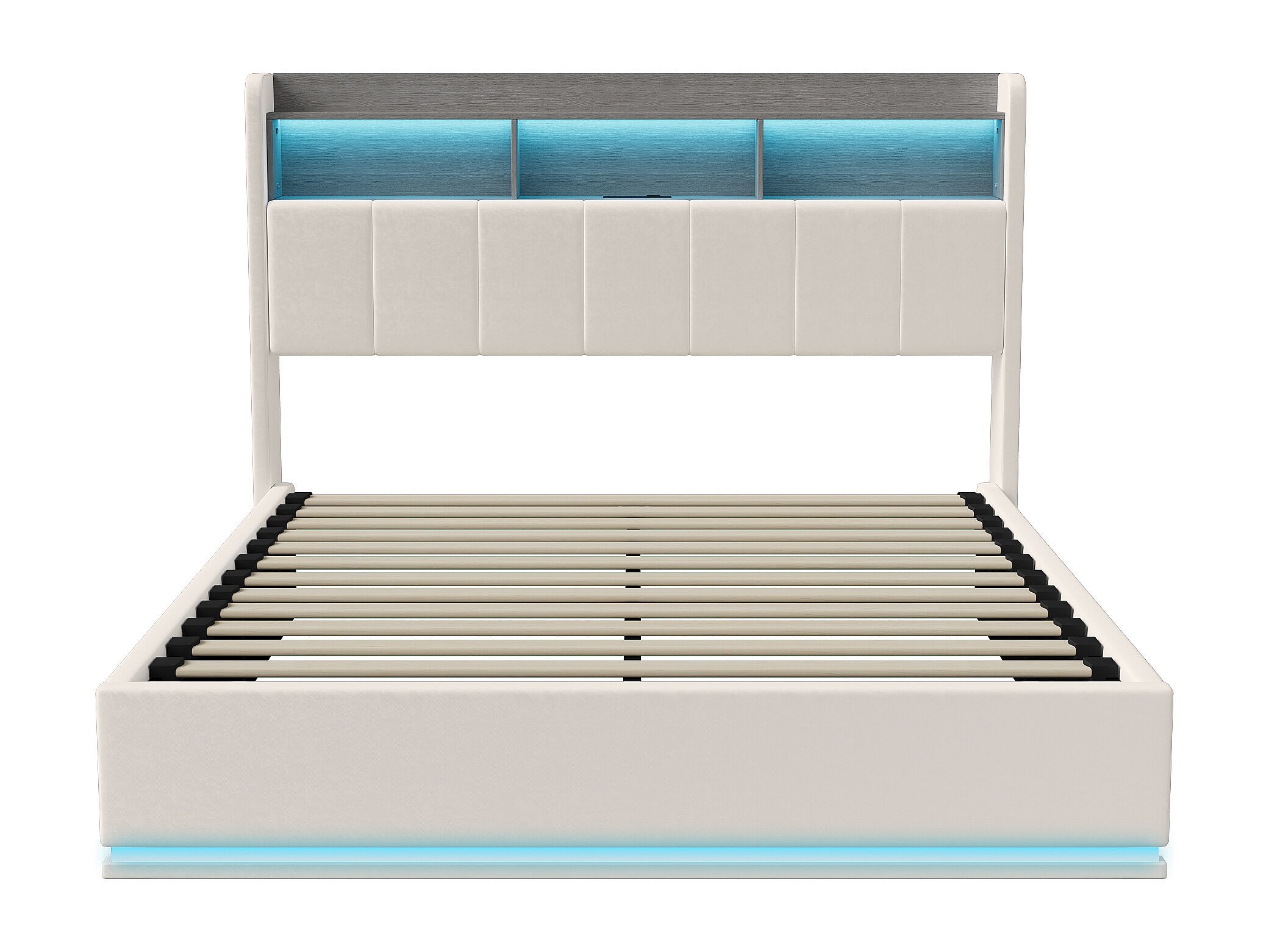 Cama de veludo branco 140x200cm com faixa de LED integrada, cabeceira com armazenamento e iluminação - Design moderno e funcional