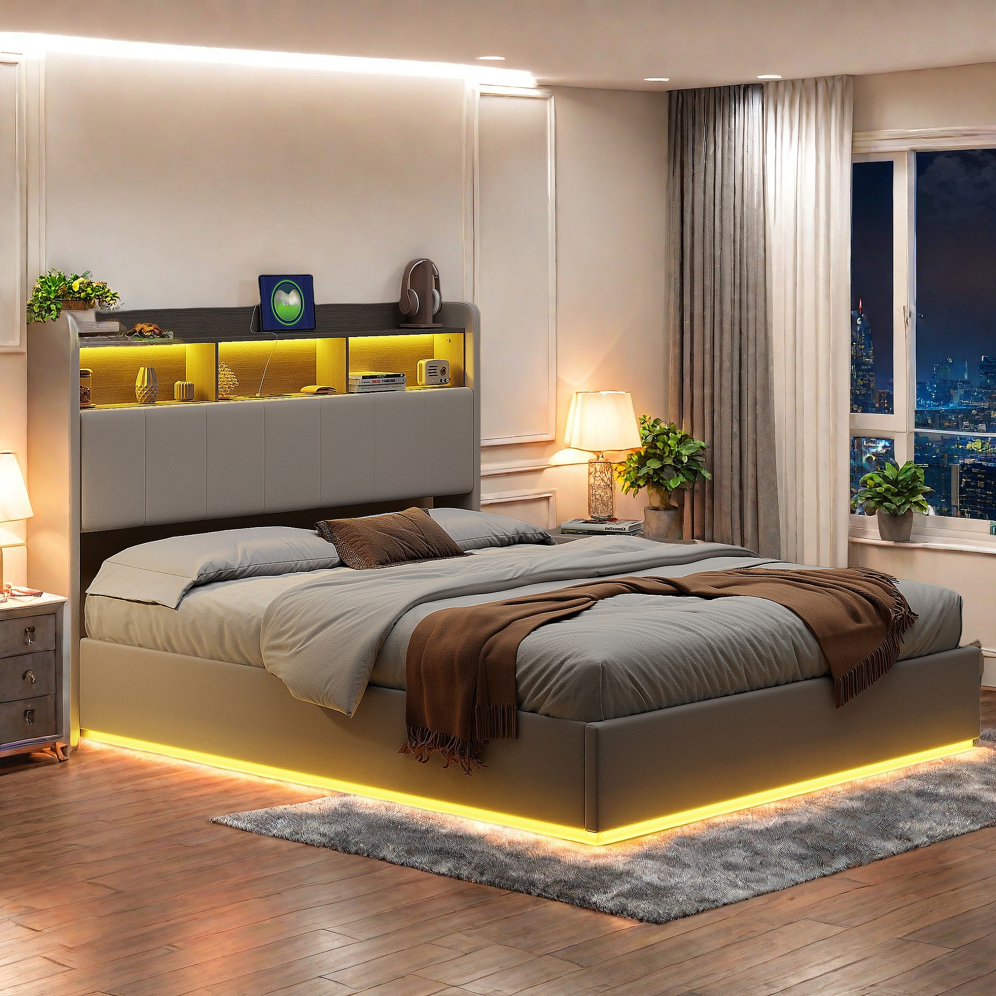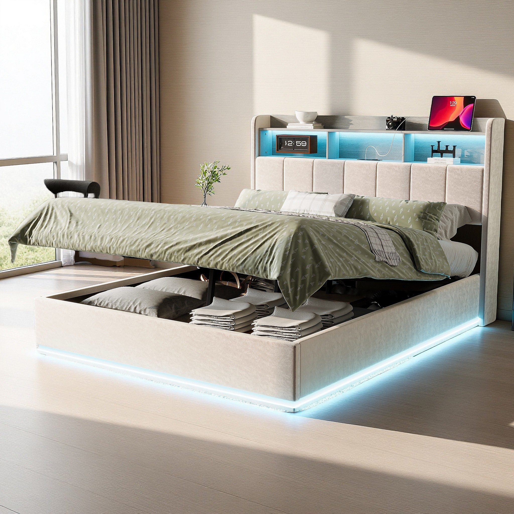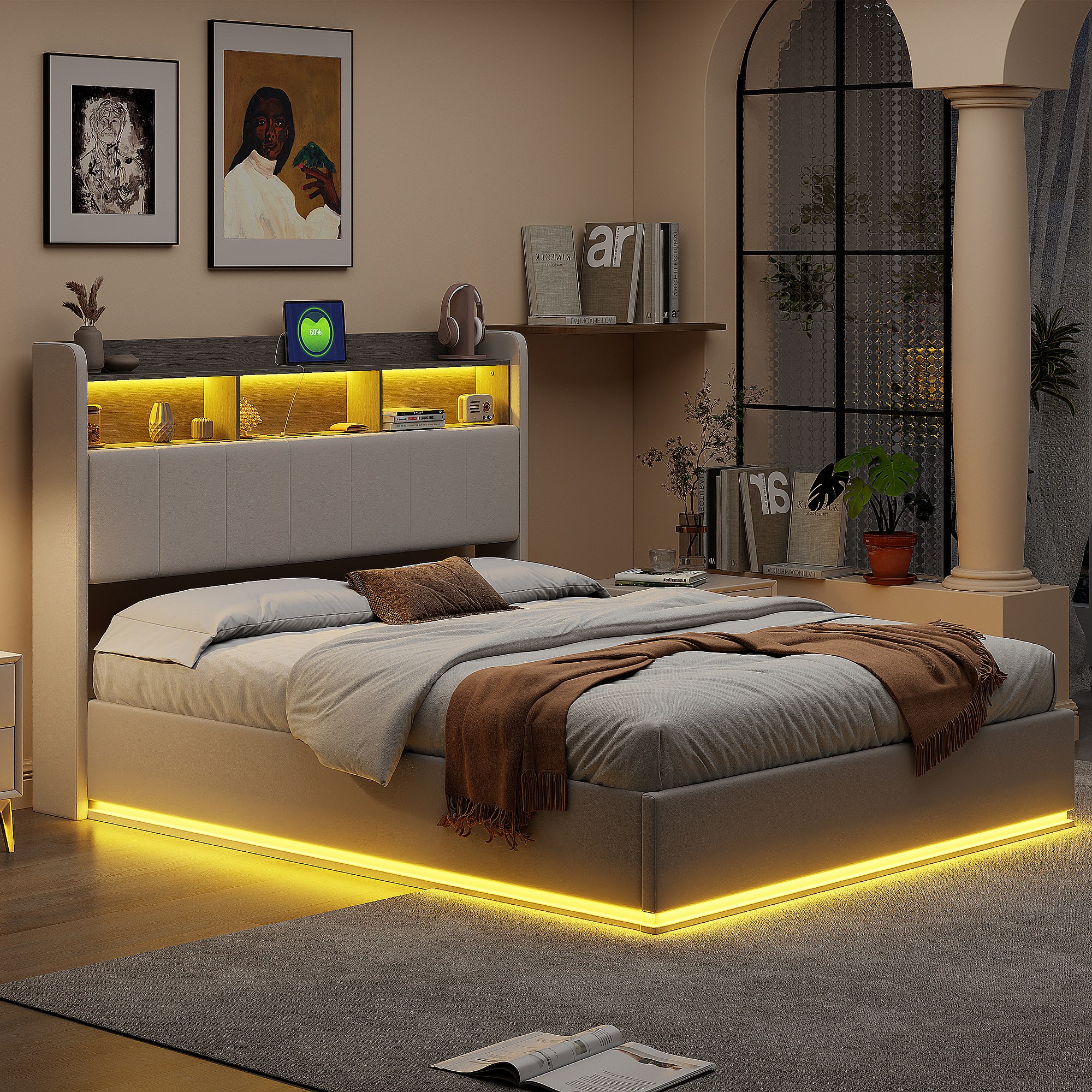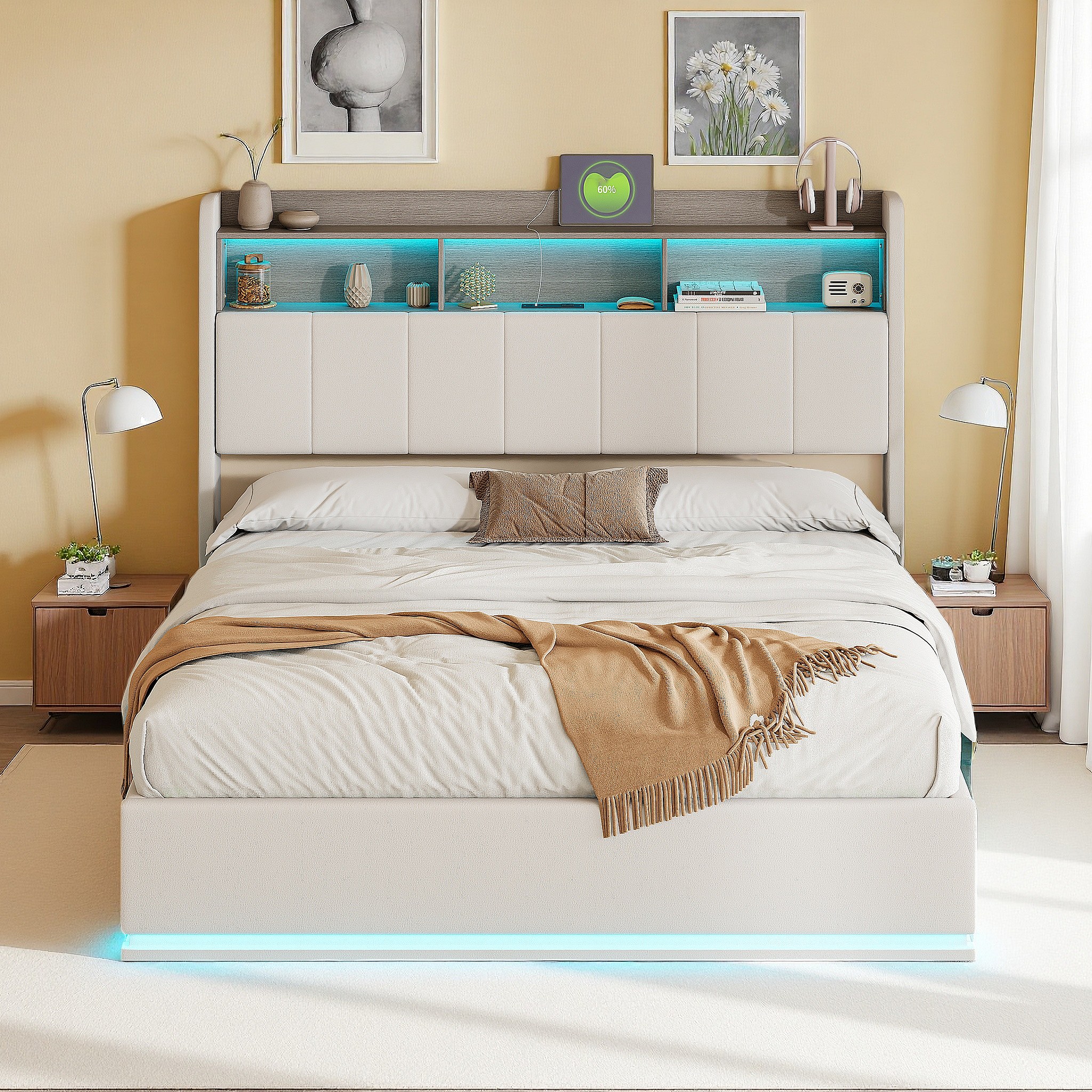 Cama de veludo branco 140x200cm com faixa de LED integrada, cabeceira com armazenamento e iluminação - Design moderno e funcional
