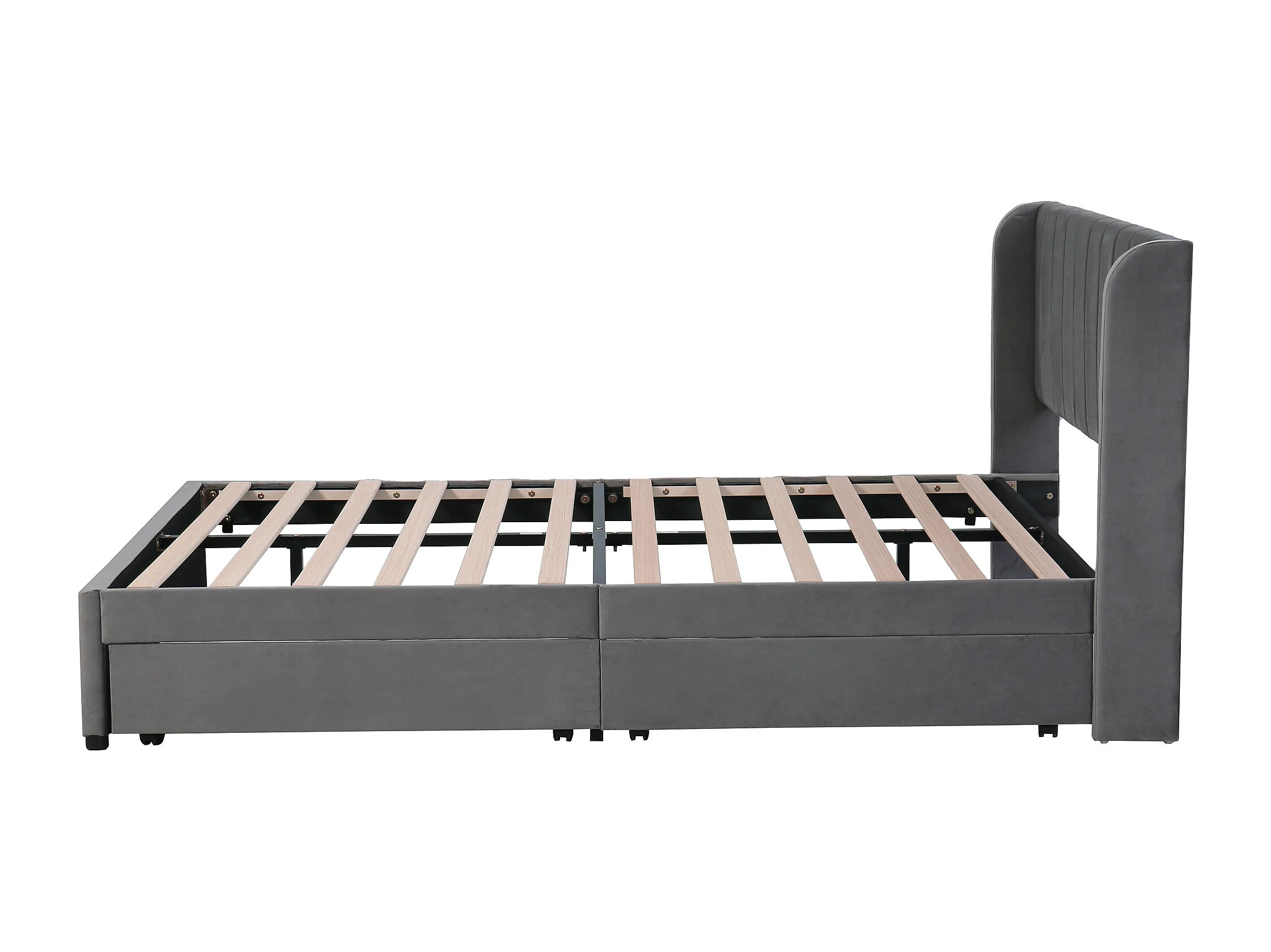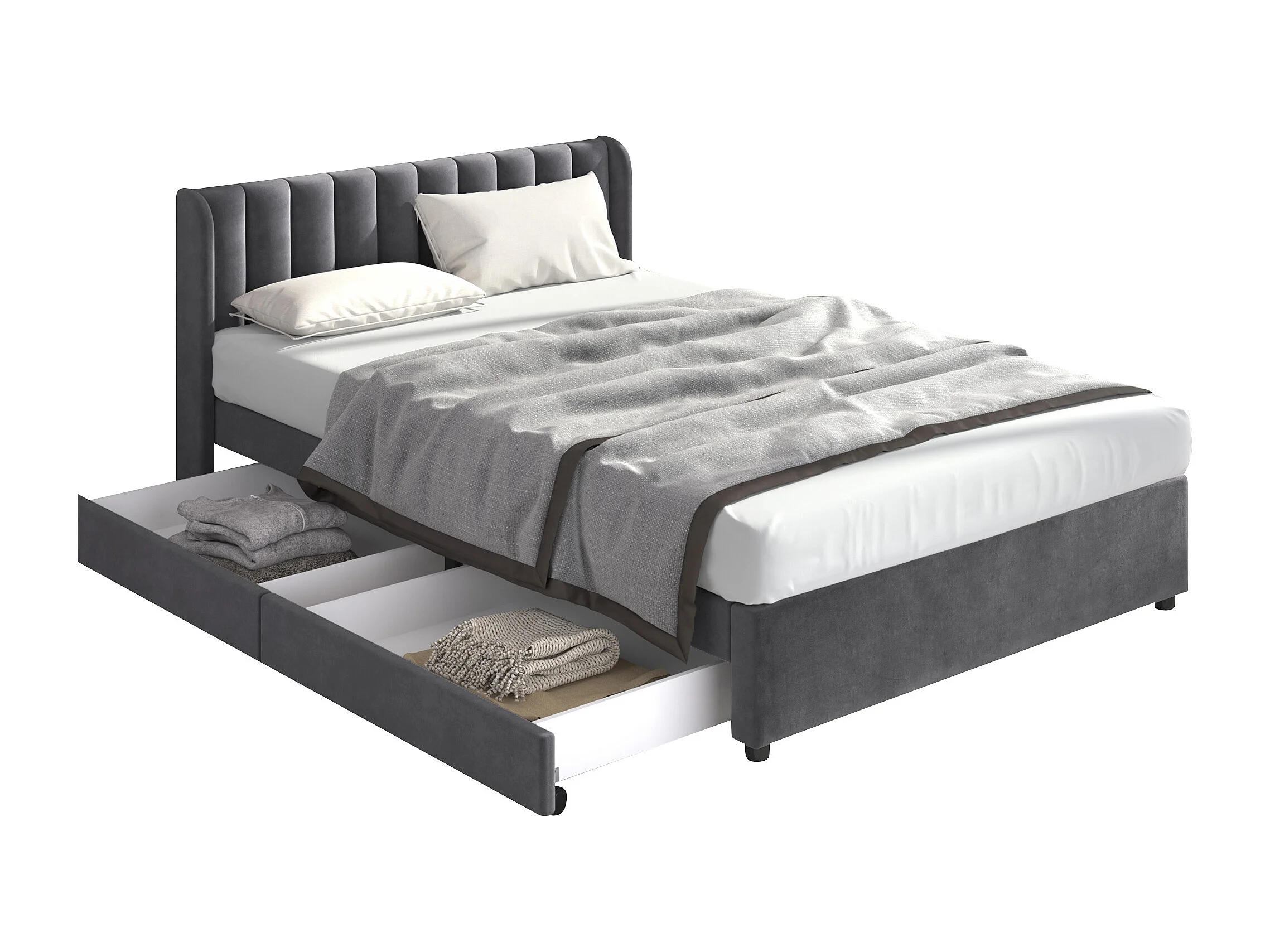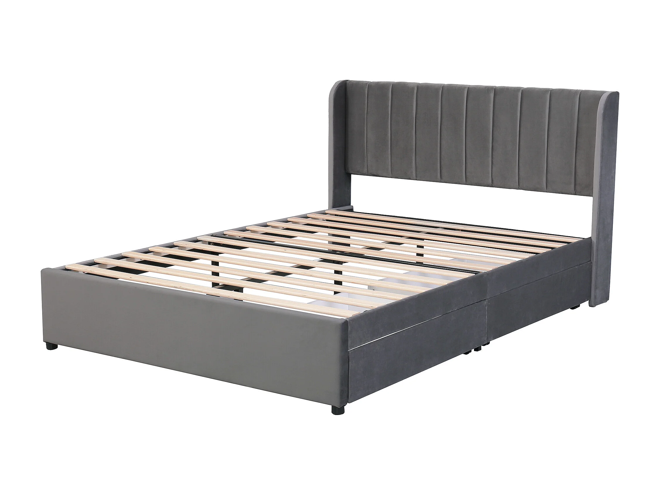 Cama dupla 160x200 cm com estrado de ripas, cabeceira e 2 gavetas, em veludo cinza (sem colchão)