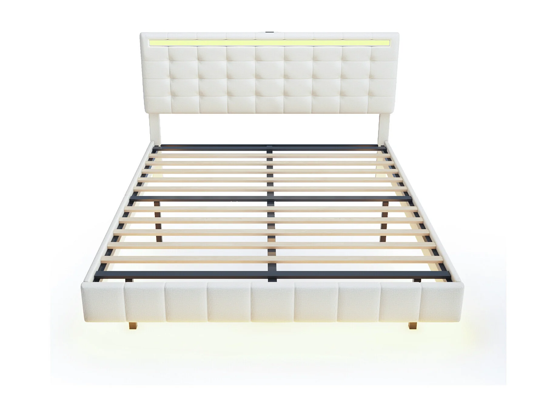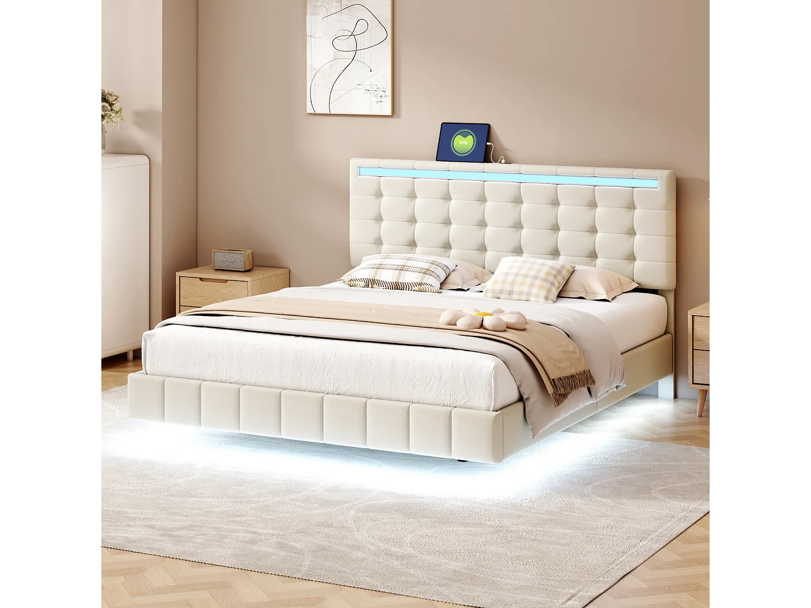 Cama estofada de 140 x 200 cm, com luzes LED e estrutura flutuante estofada, bege, linho.
