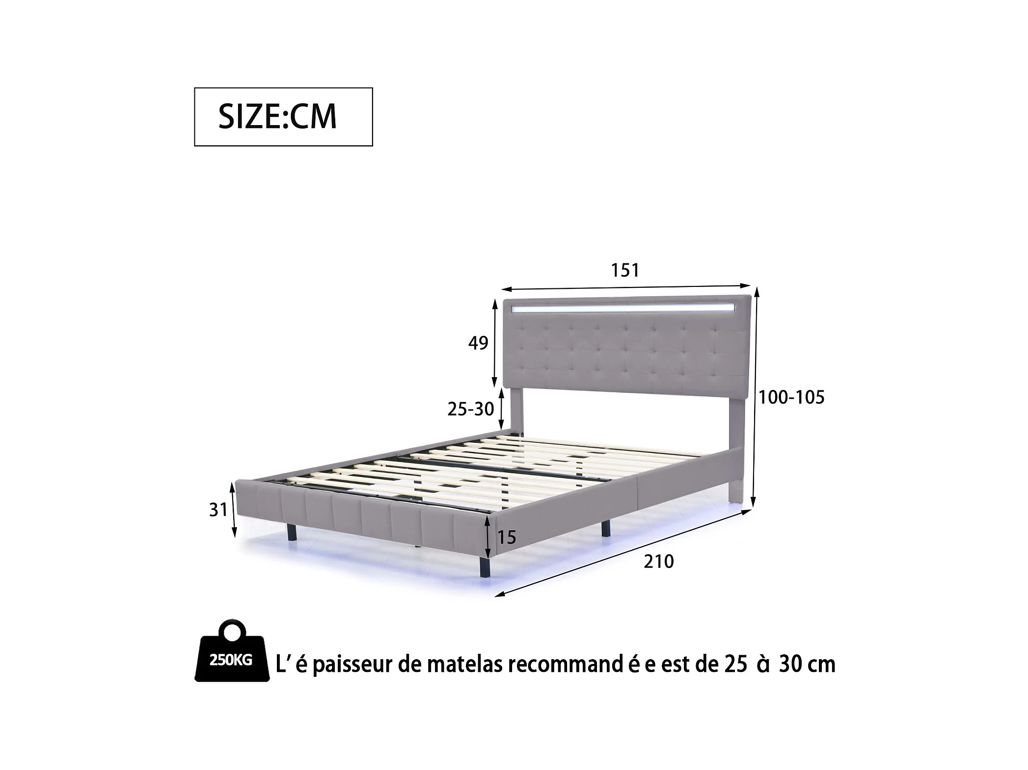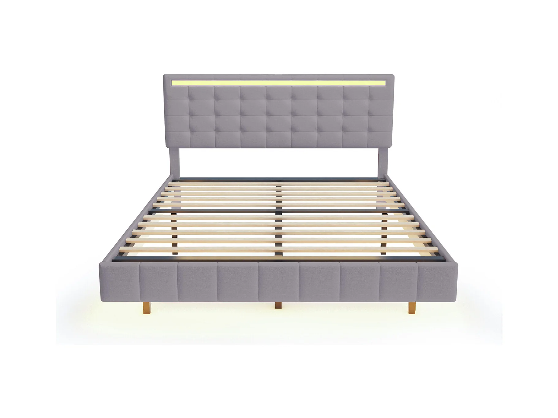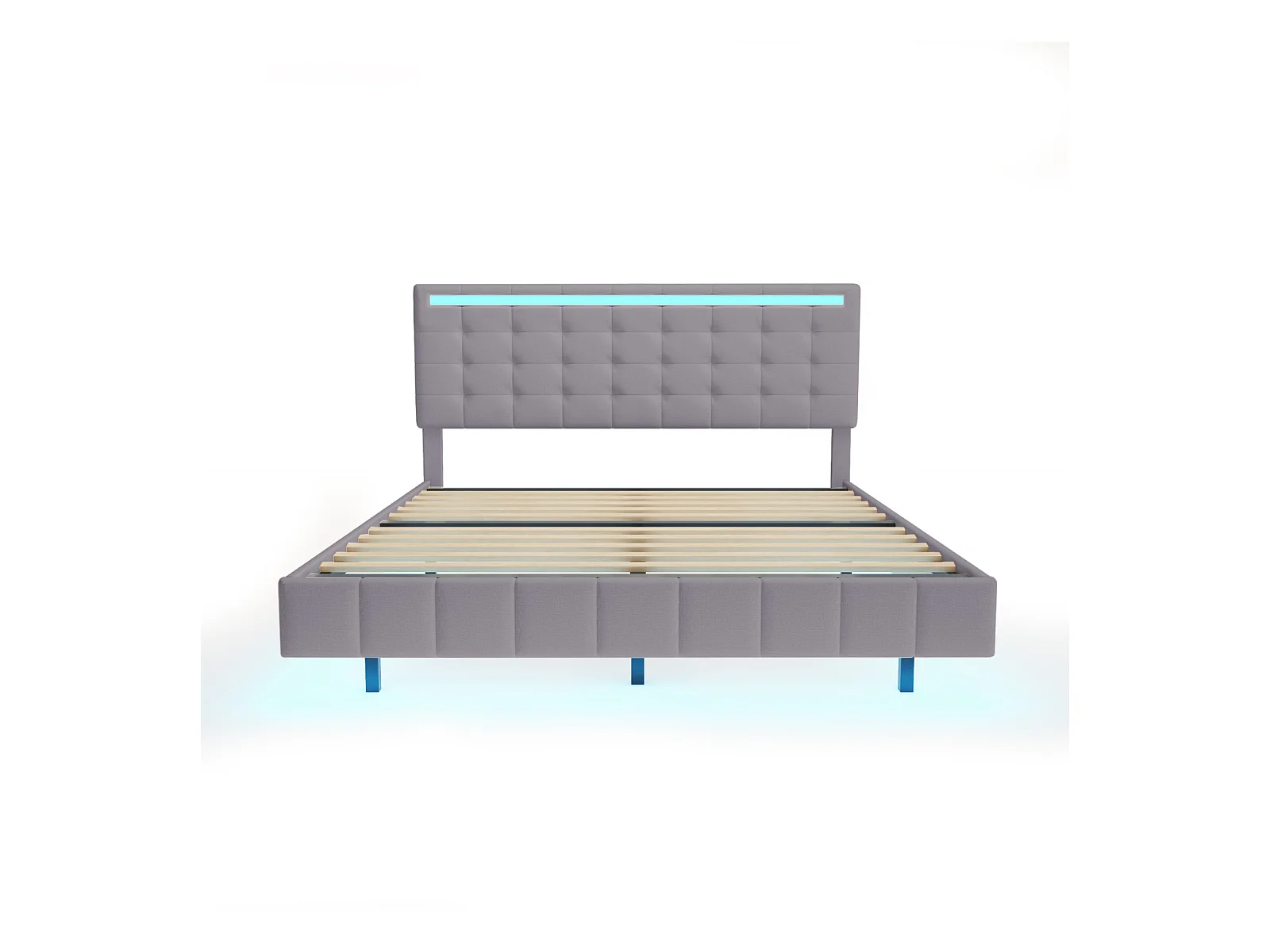 Cama estofada de 140 x 200 cm, com luzes LED e estrutura flutuante estofada, Cinza, Linho.