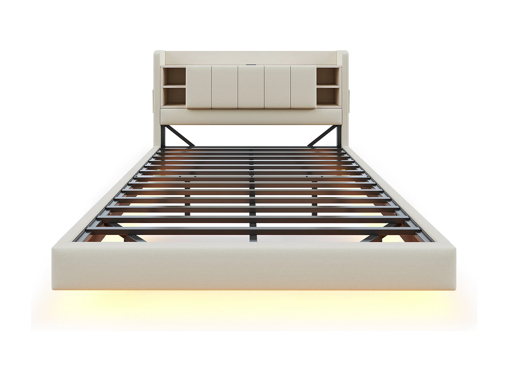 Cama estofada, 140 x 200 cm, multifuncional, com luz LED e interface USB, estrutura metálica, bege