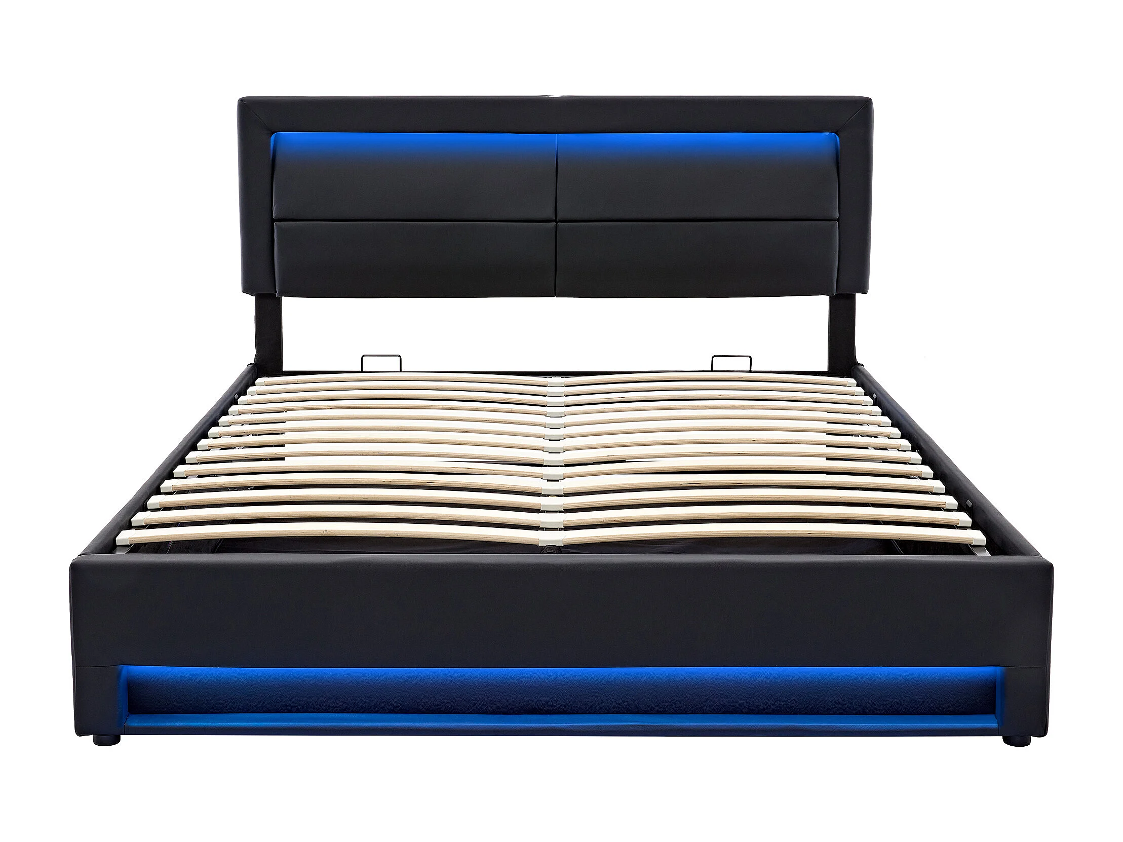 Cama estofada 140x200 PU preta com LED, portas USB e armazenamento prático para adultos