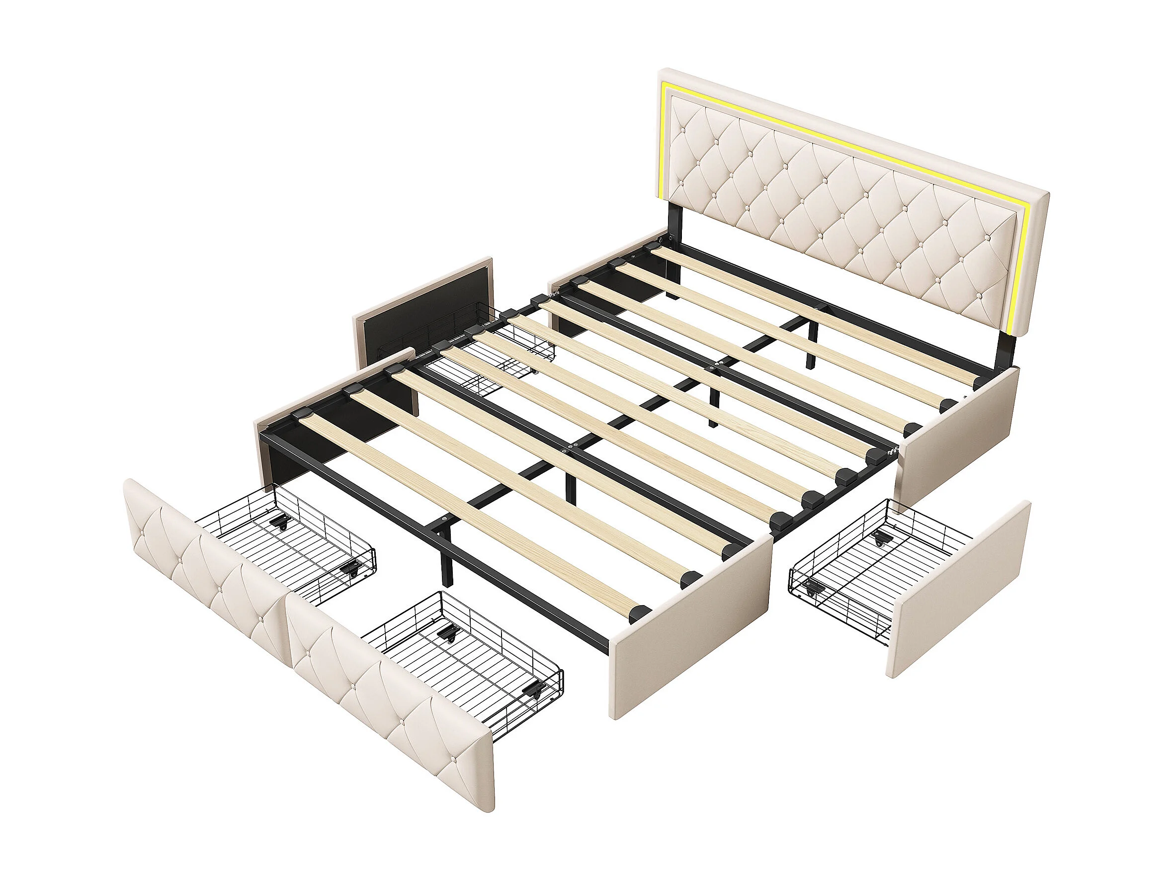 Cama de casal 140x200 cm em linho bege, 4 gavetas, LED, prateleiras, portas USB/tipo C, base de ripas de madeira