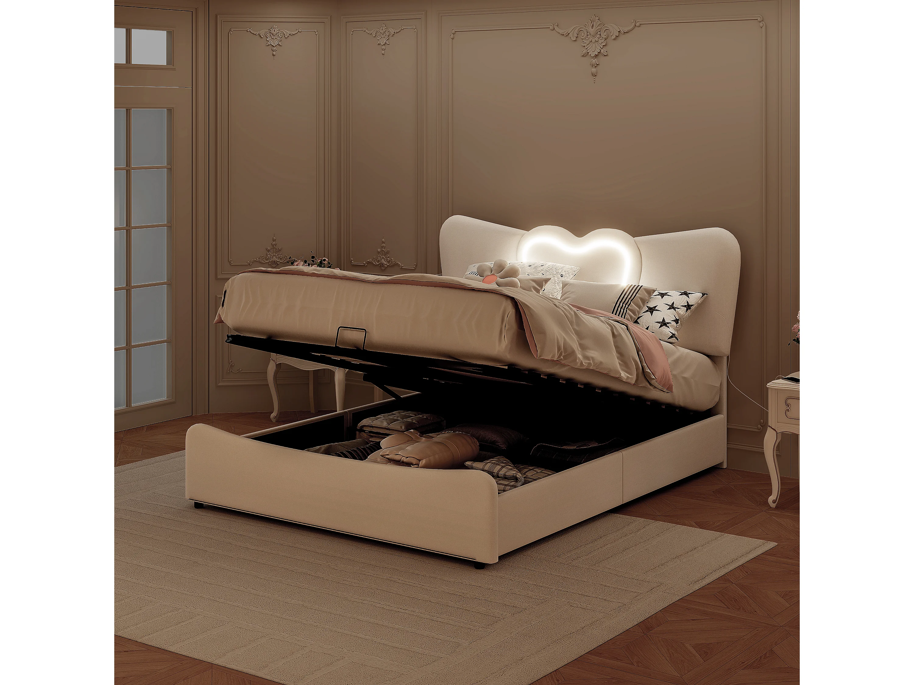 Cama com gavetas 160x200 cm em veludo bege, cabeceira e armários de cama a gás, luz LED, porta USB + Tipo C, design moderno e confortável