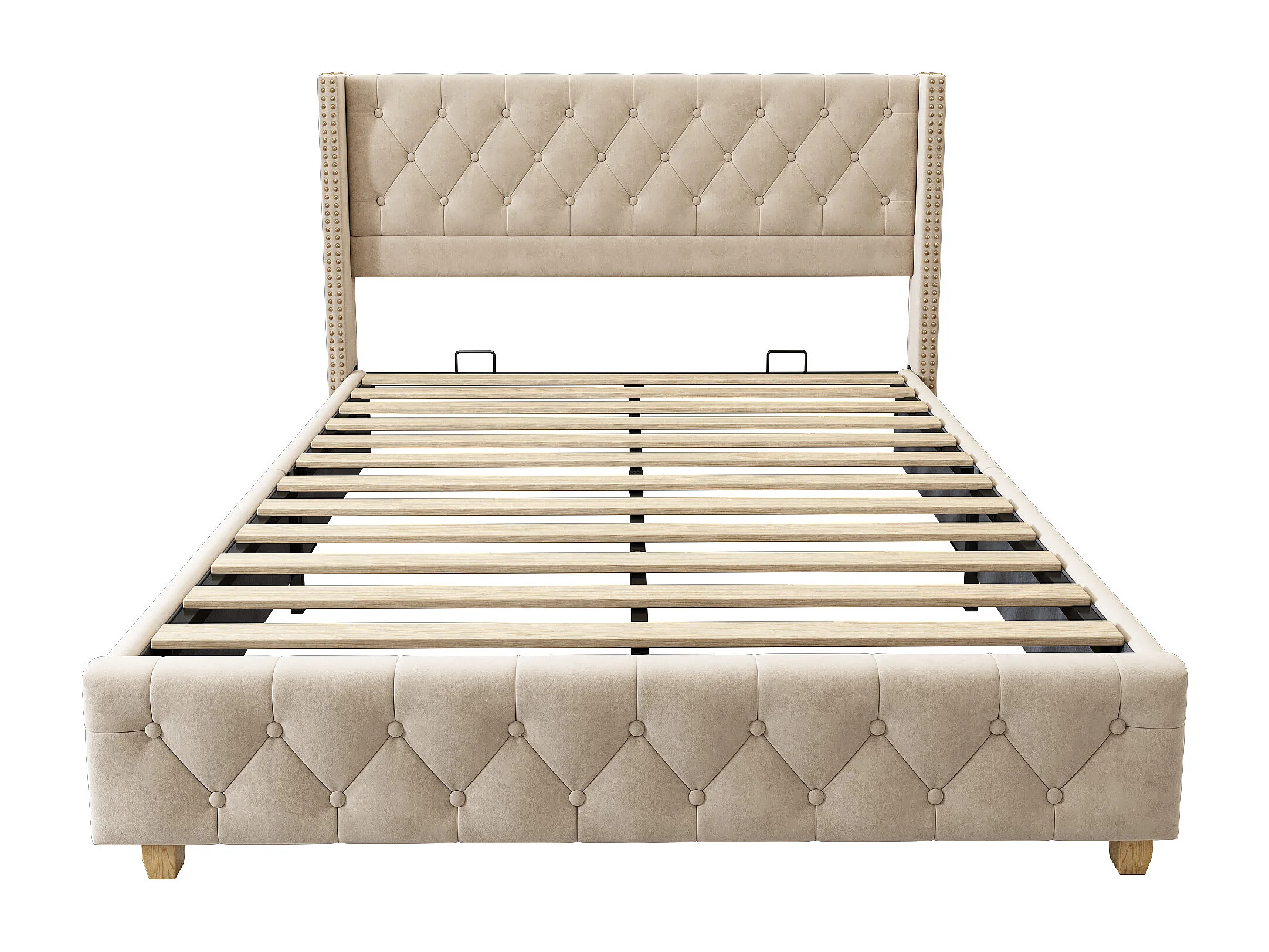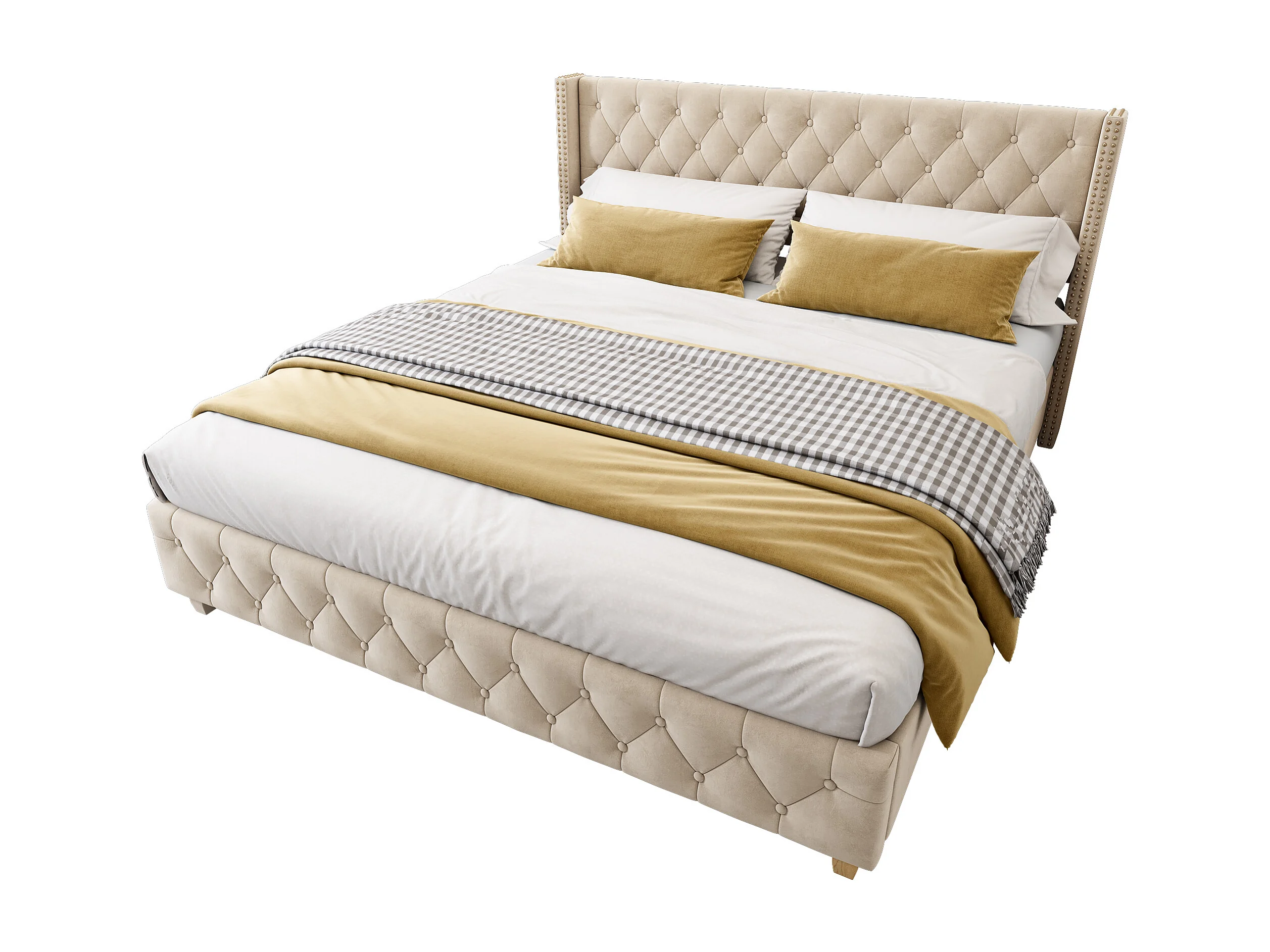 Cama estofada 160x200 cm em veludo bege claro com cabeceira capitonê e pés de madeira