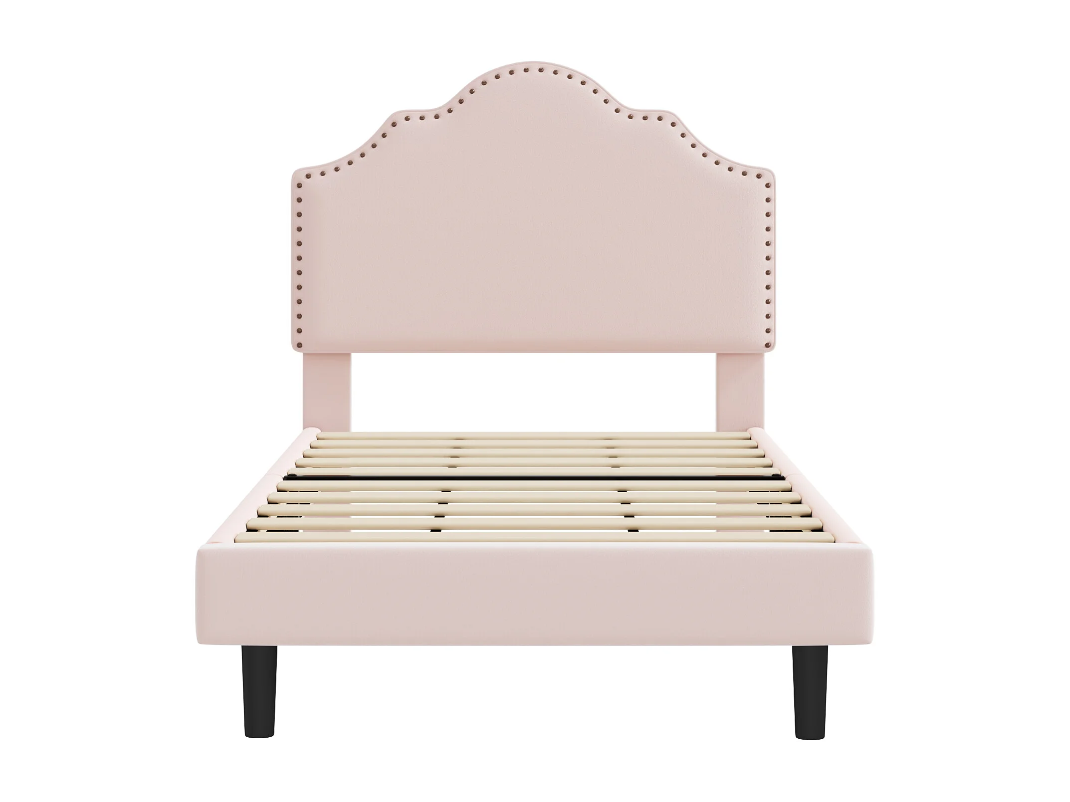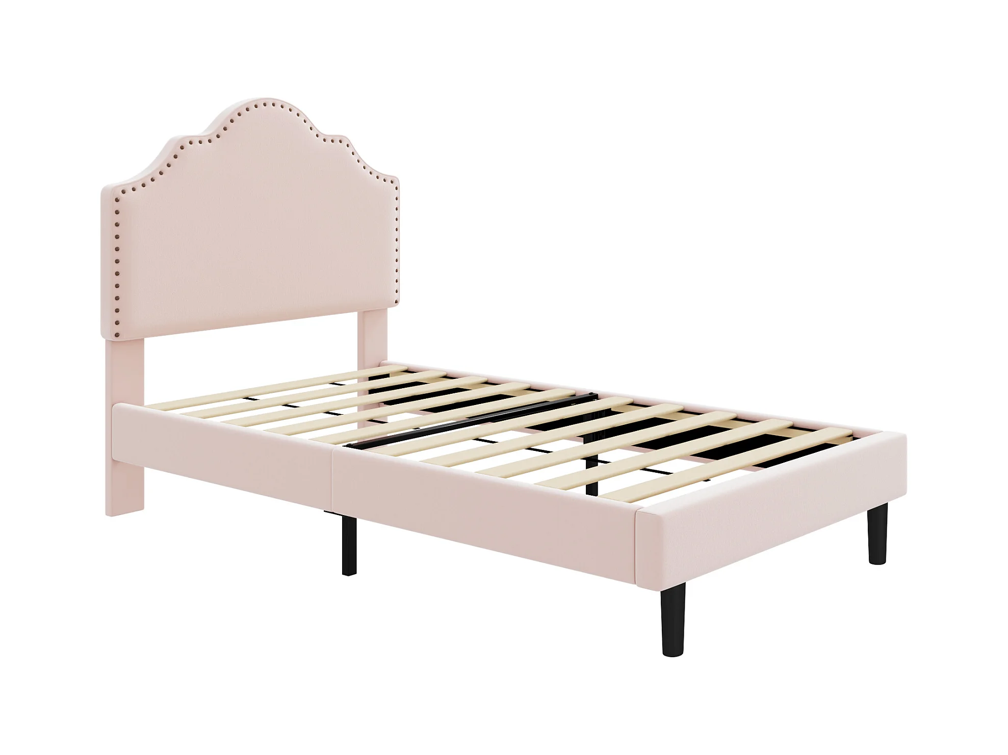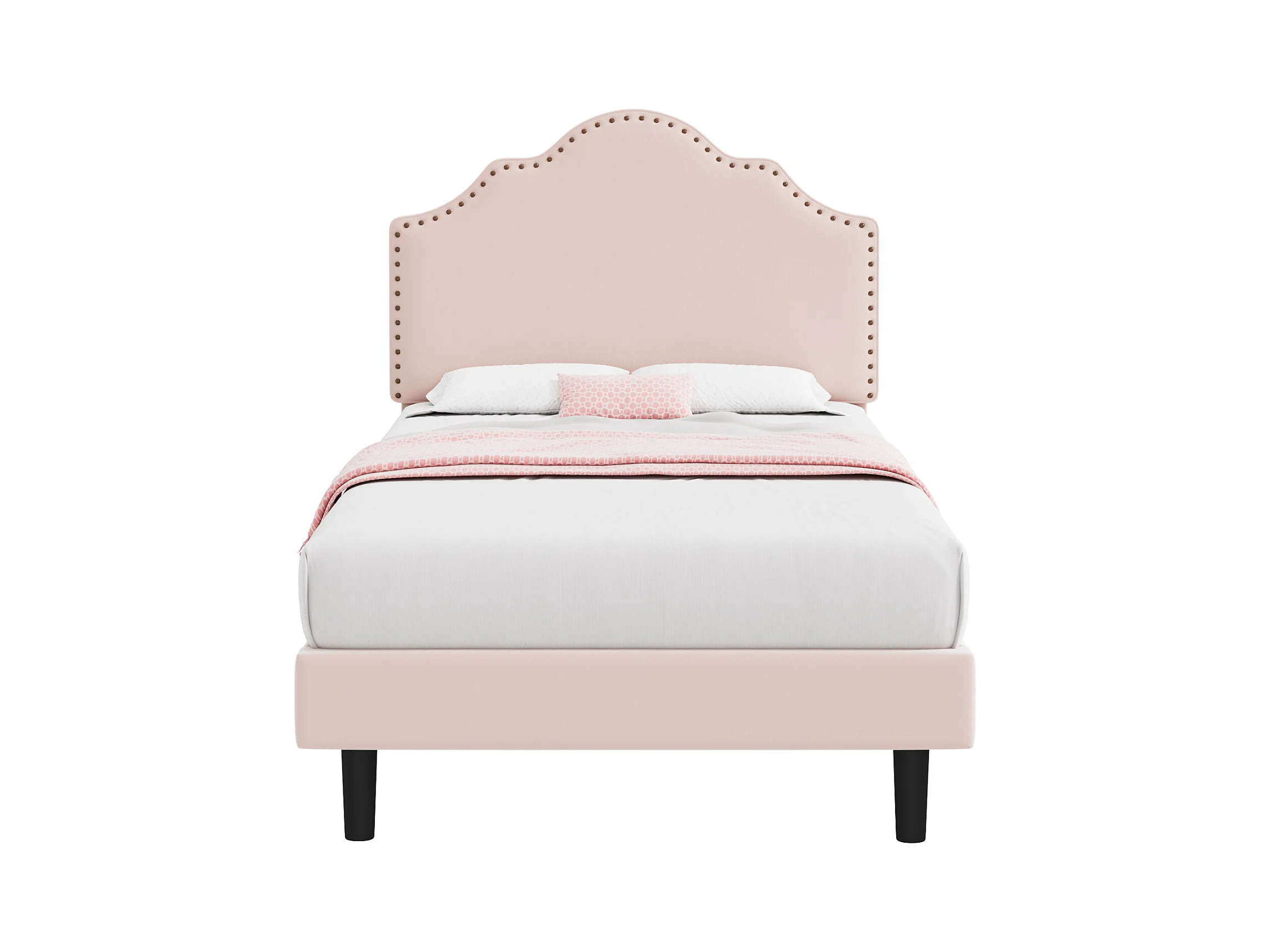 Cama estofada 90 x 200 cm com cabeceira curva - decoração com rebites - veludo - rosa (sem colchão)