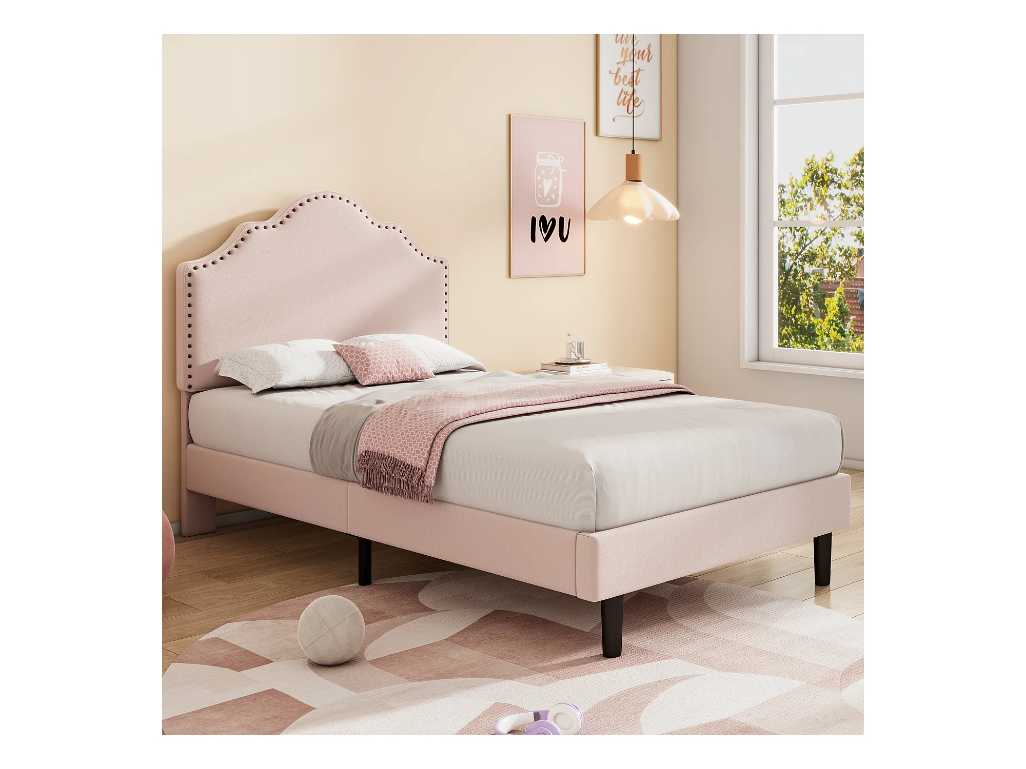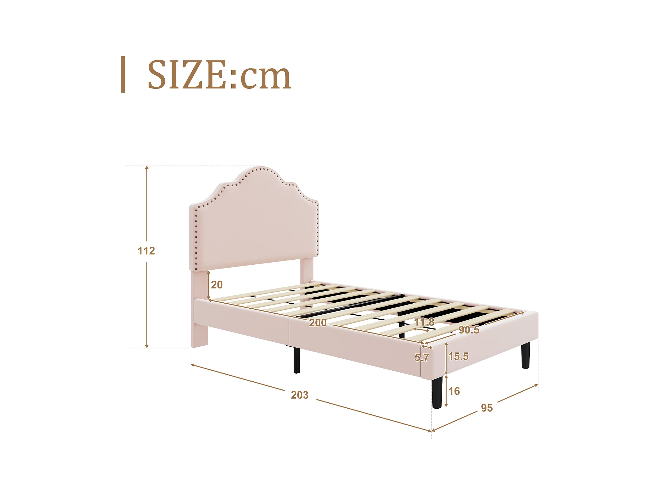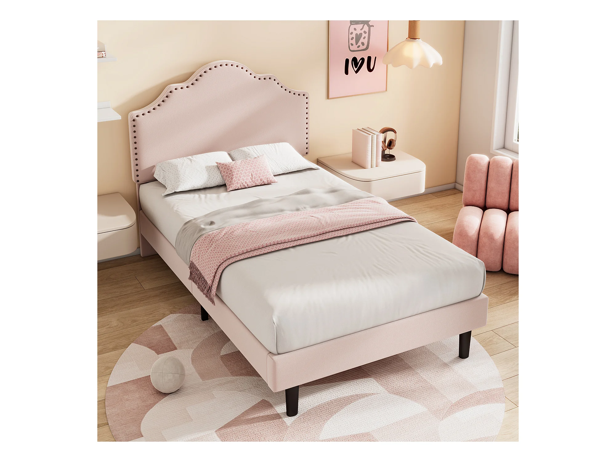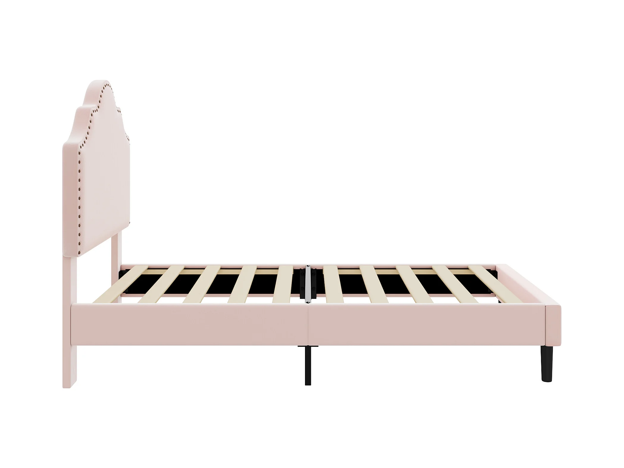 Cama estofada 90 x 200 cm com cabeceira curva - decoração com rebites - veludo - rosa (sem colchão)