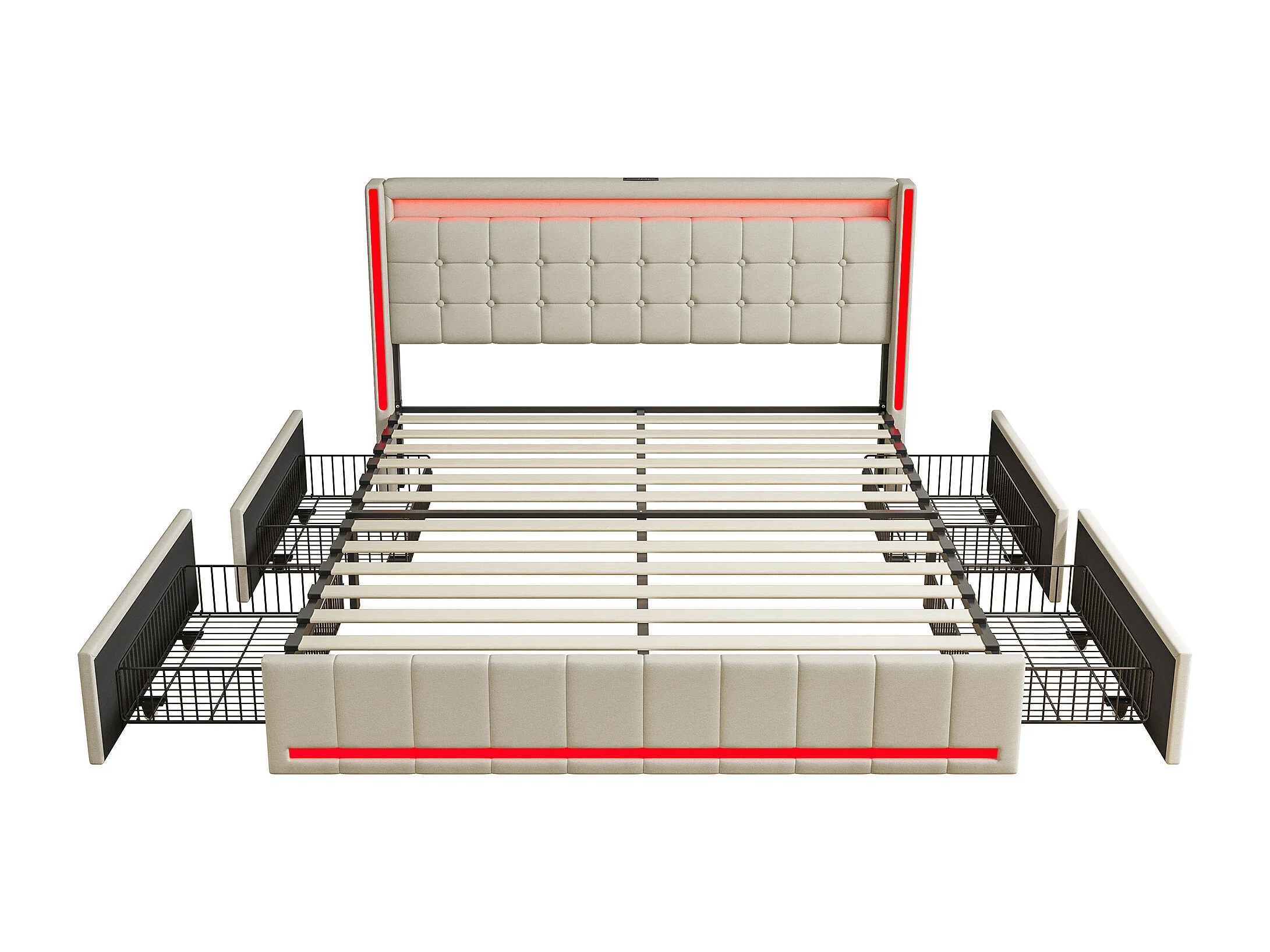 Cama estofada Cama de casal 140x200cm Bege com 4 gavetas com LED e USB