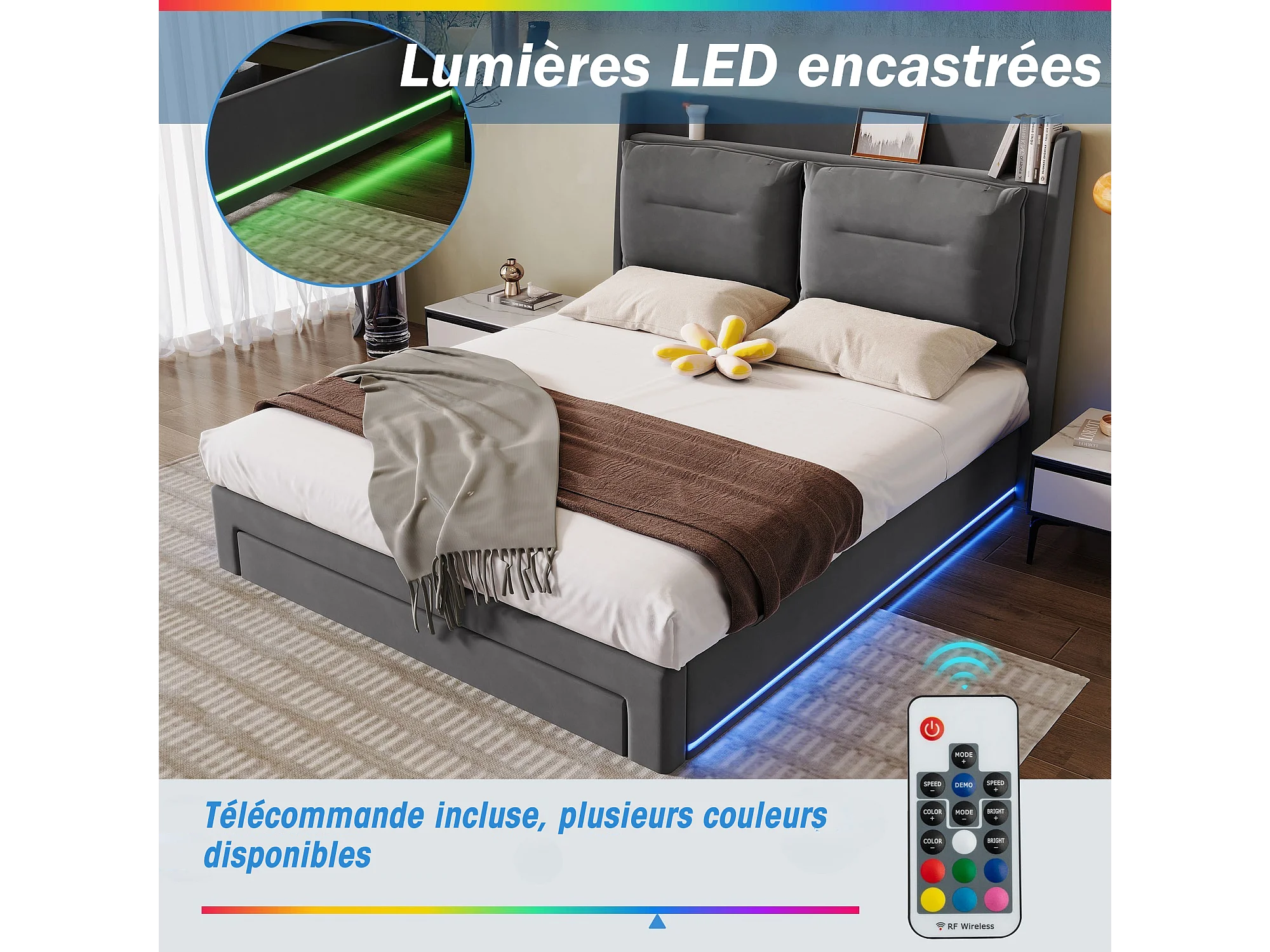 Cama estofada em veludo com arrumação - 140x190 cm - 2 gavetas na extremidade da cama - Faixa de luz LED embutida no pé da cama - Cinza (sem colchão)