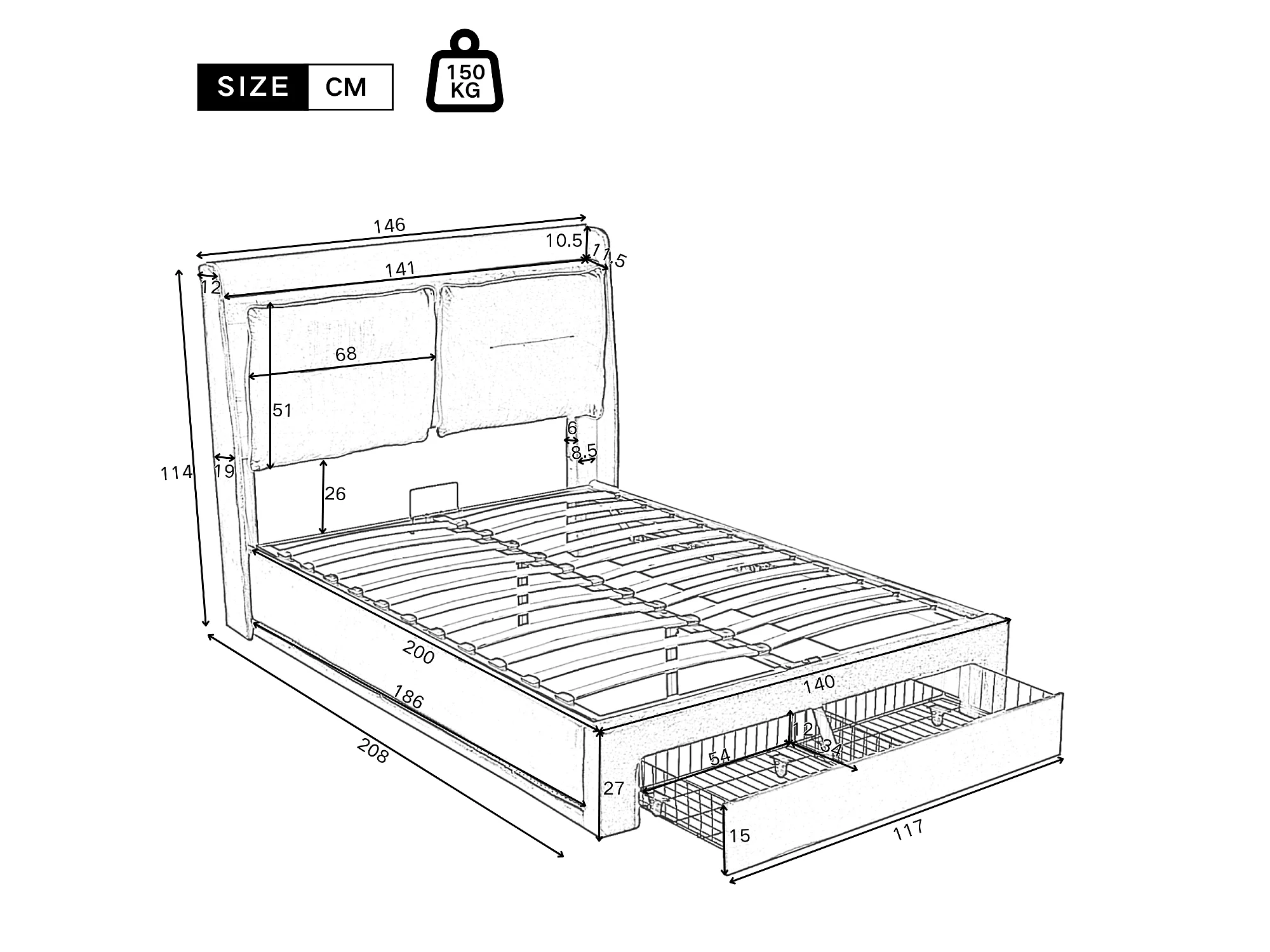 Cama estofada em veludo com arrumação - 140x200 cm - 2 gavetas na extremidade da cama - Faixa de luz LED embutida no pé da cama - Bege (sem colchão)