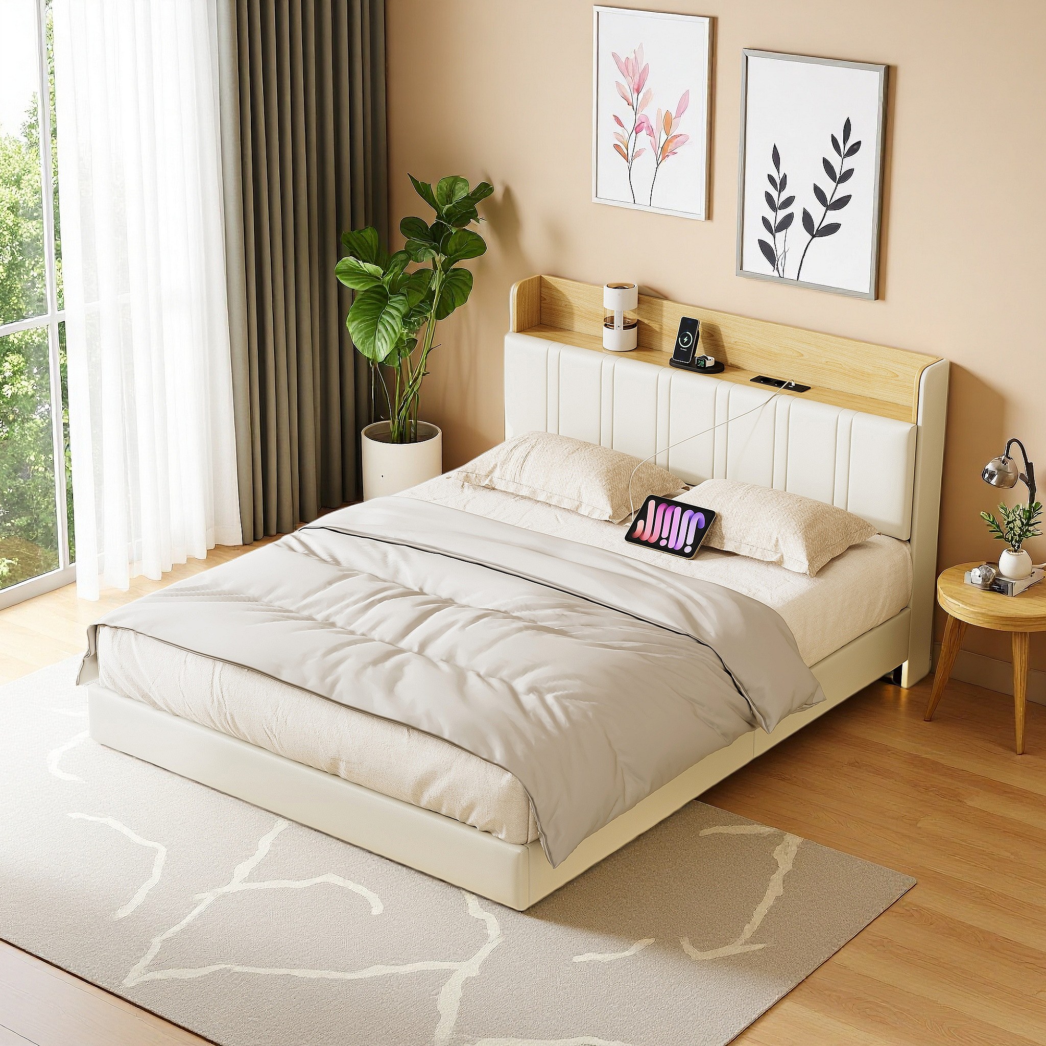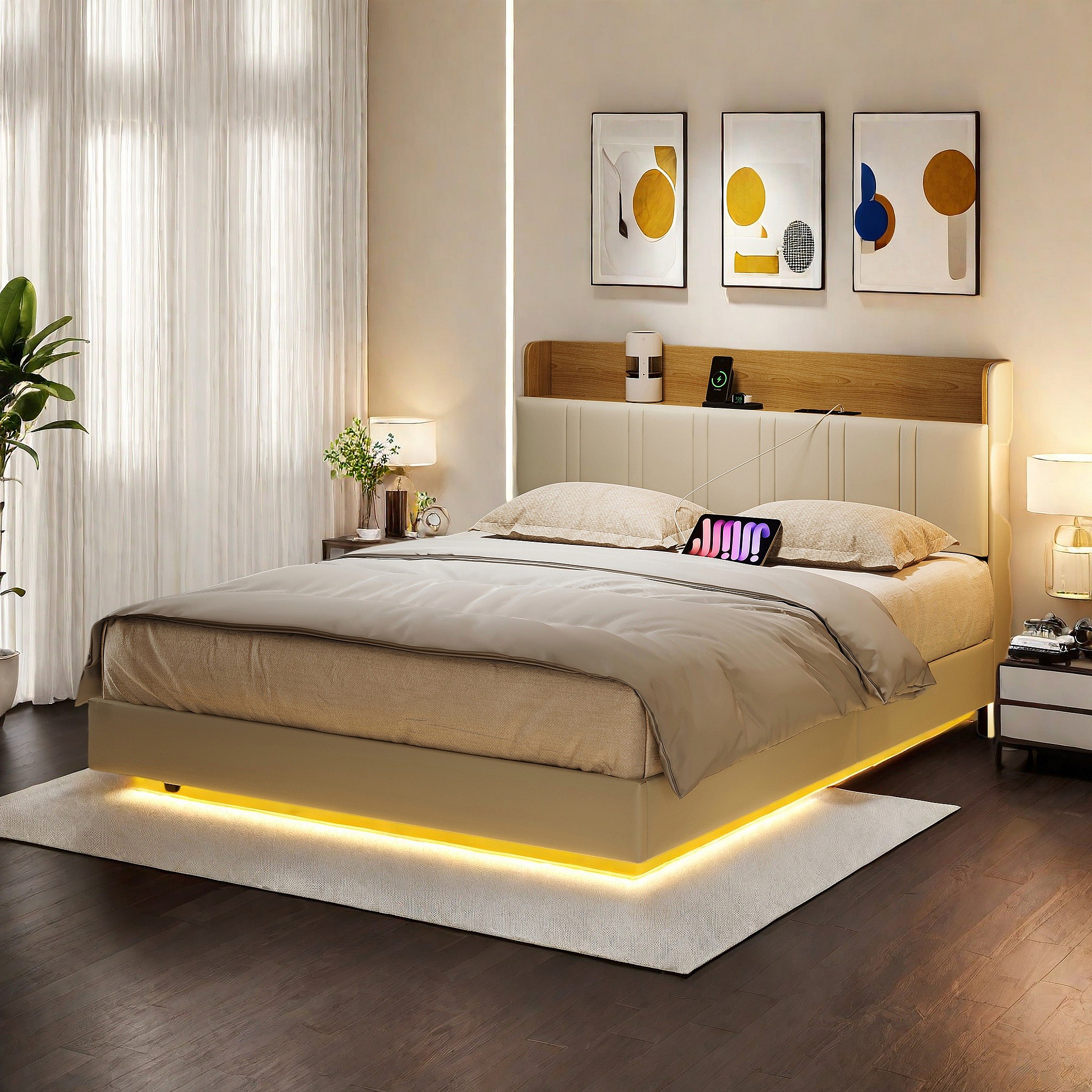 Cama flutuante 140x190 cm PU branco + madeira clara, gavetas para armazenamento, iluminação LED embaixo da cama, porta USB dupla, bolso lateral