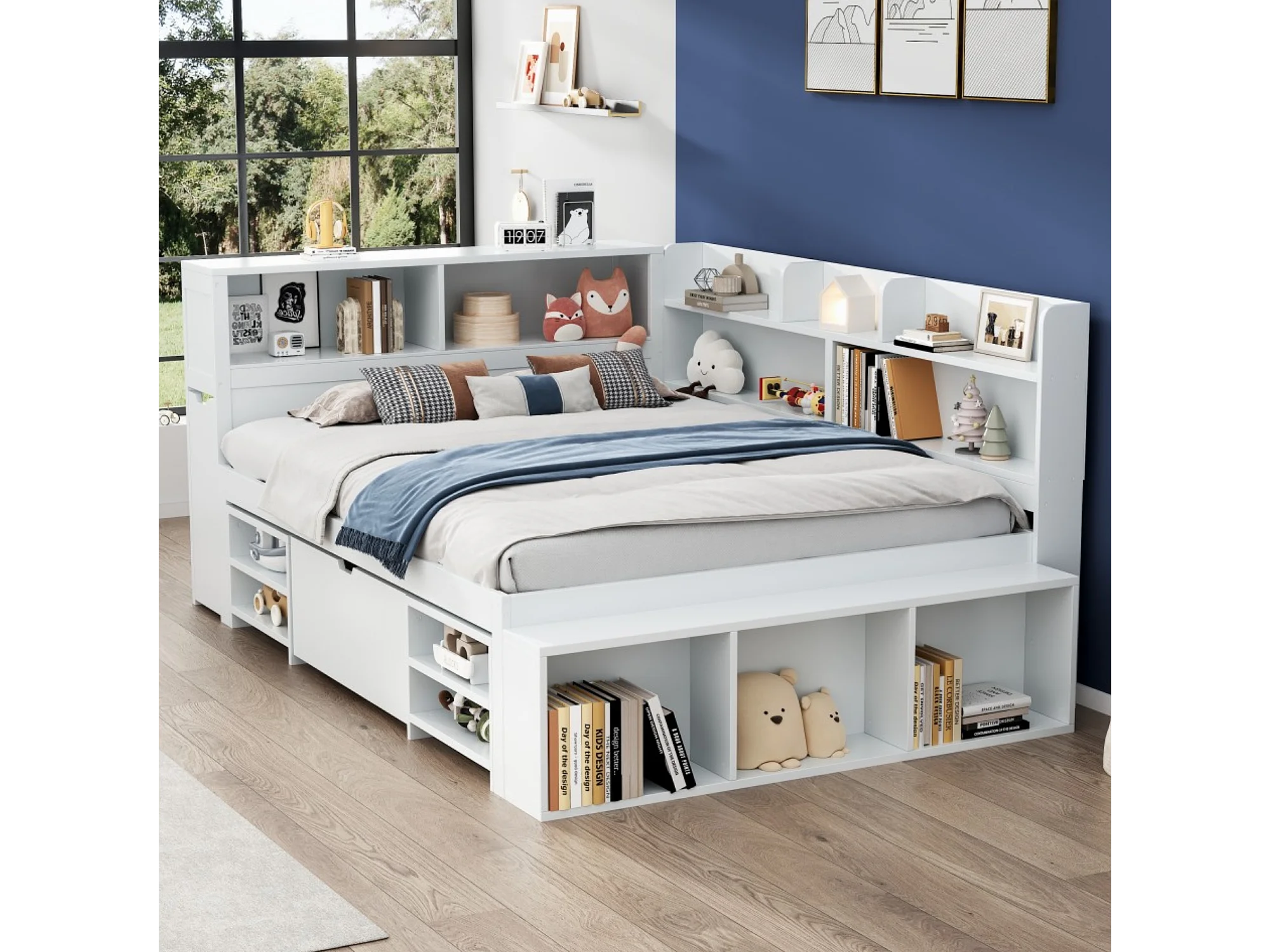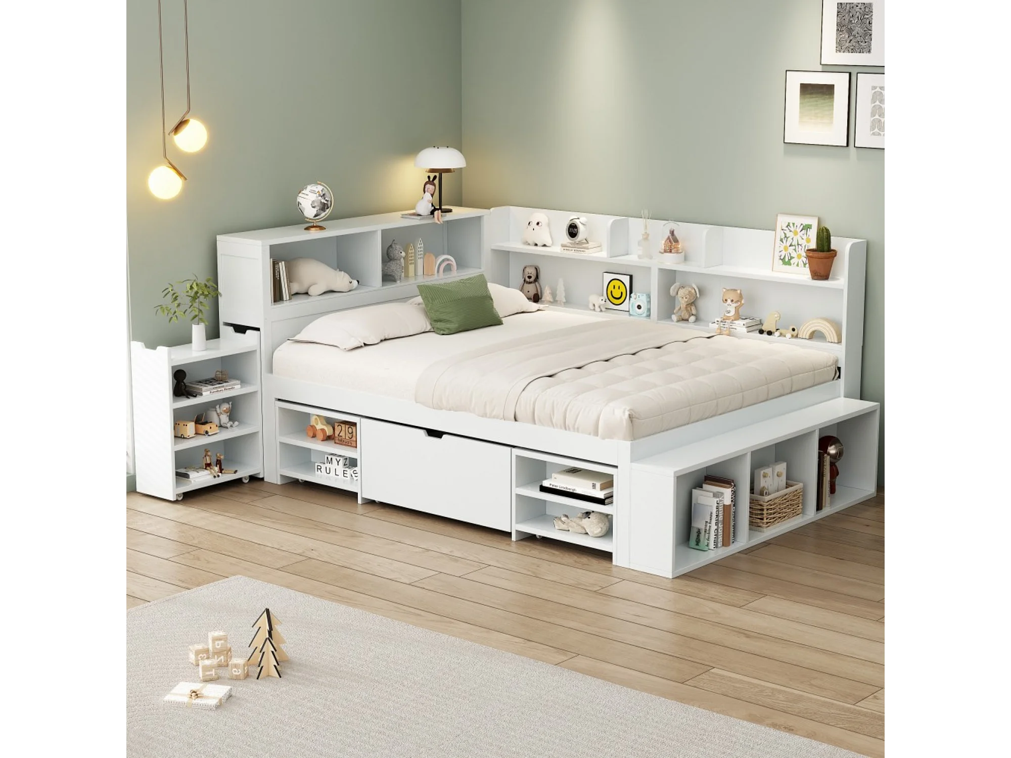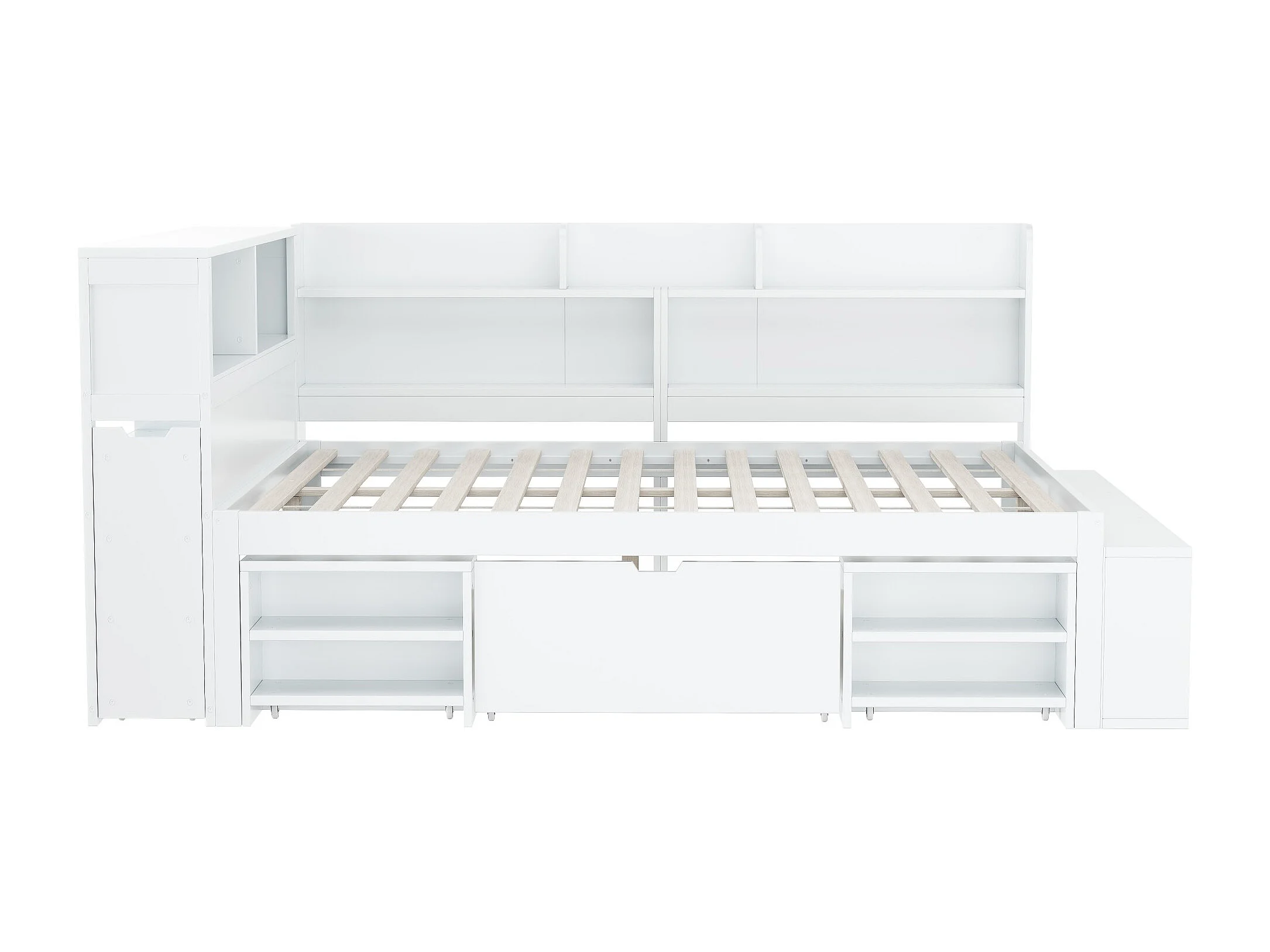 Cama infantil 140*190 cm, com gavetas, prateleiras e arrumação, estrado de ripas, branco