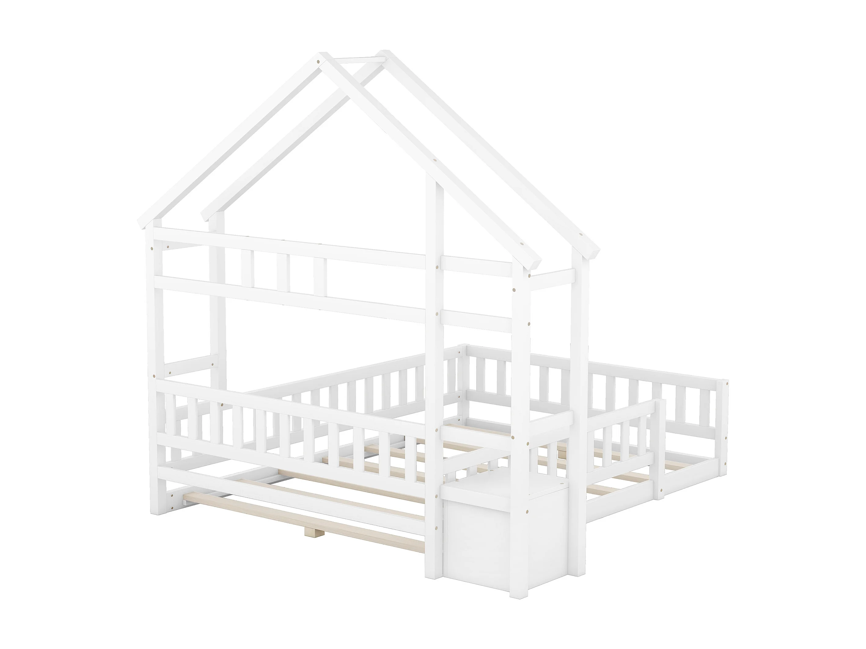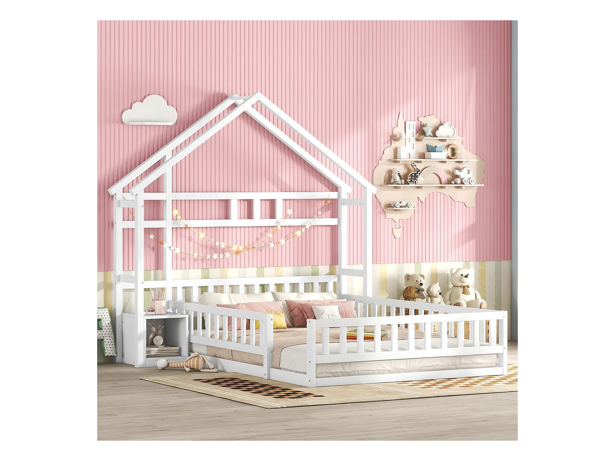 Cama infantil 140x190 em madeira de pinho com guarda-corpo e mesa de cabeceira branca