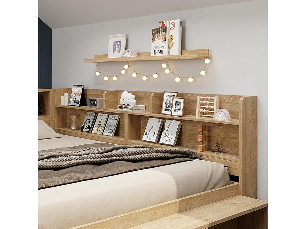 Cama infantil 90 x 200 cm, com mesa de cabeceira, prateleira e arrumação, função de carregamento sem fios, cor natural