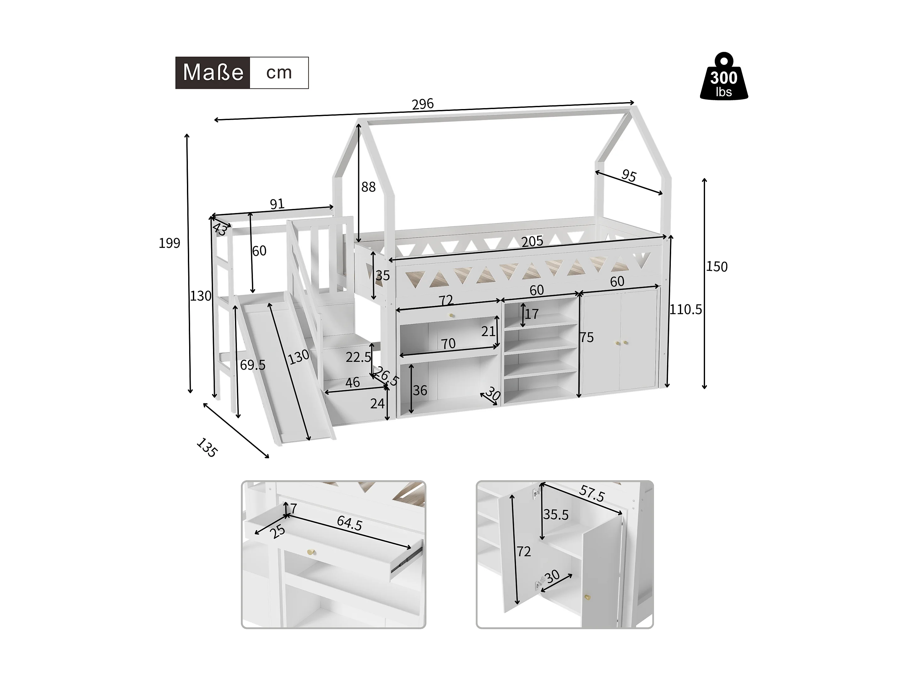 Cama infantil 90x200 branca em madeira maciça com corrediça, gavetas e arrumação