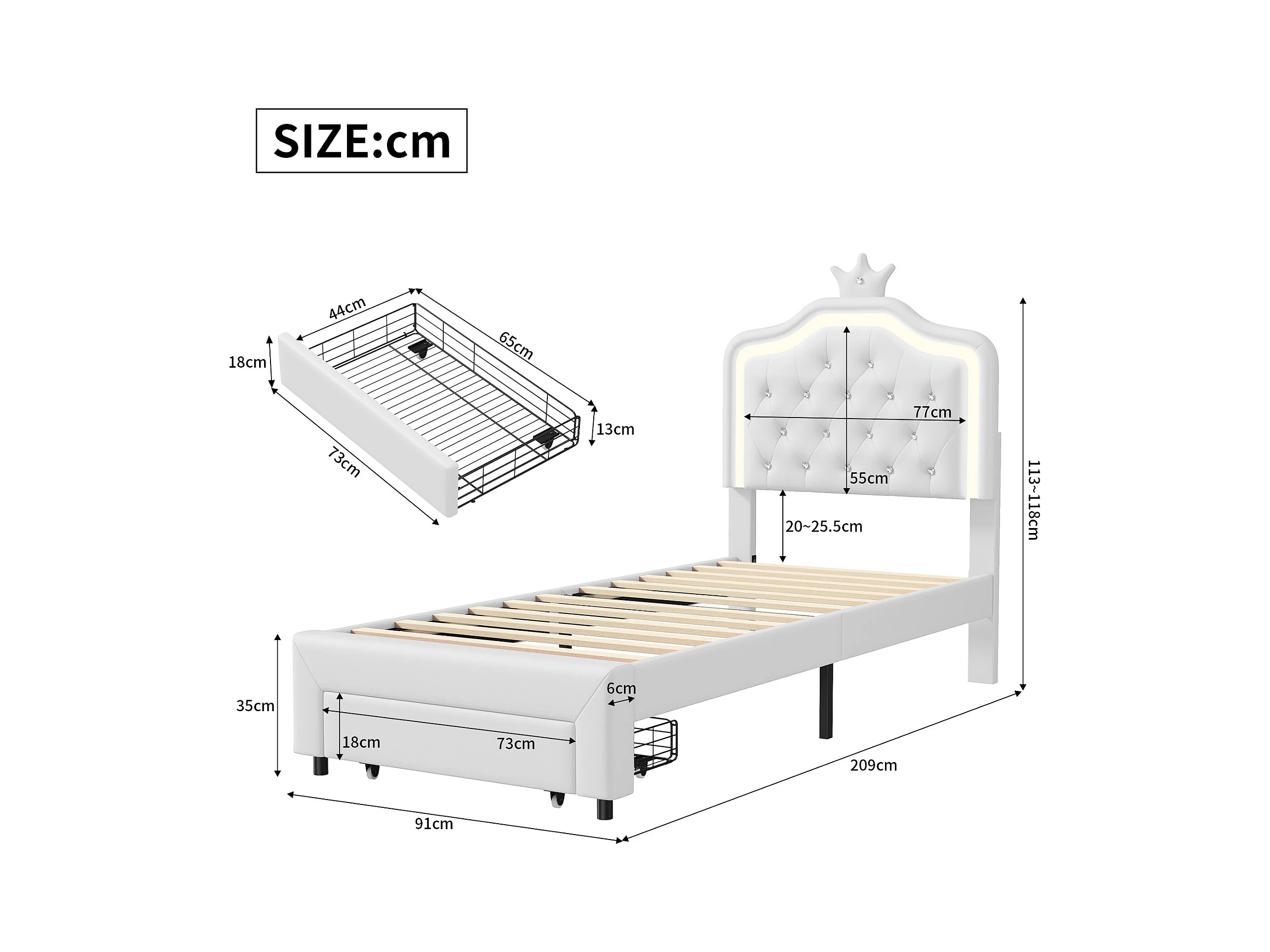 cama infantil 90x200 cm, cama de solteiro estofada 90 x 200 com gaveta, LED ajustável, cama princesa com coroa, PU, branco