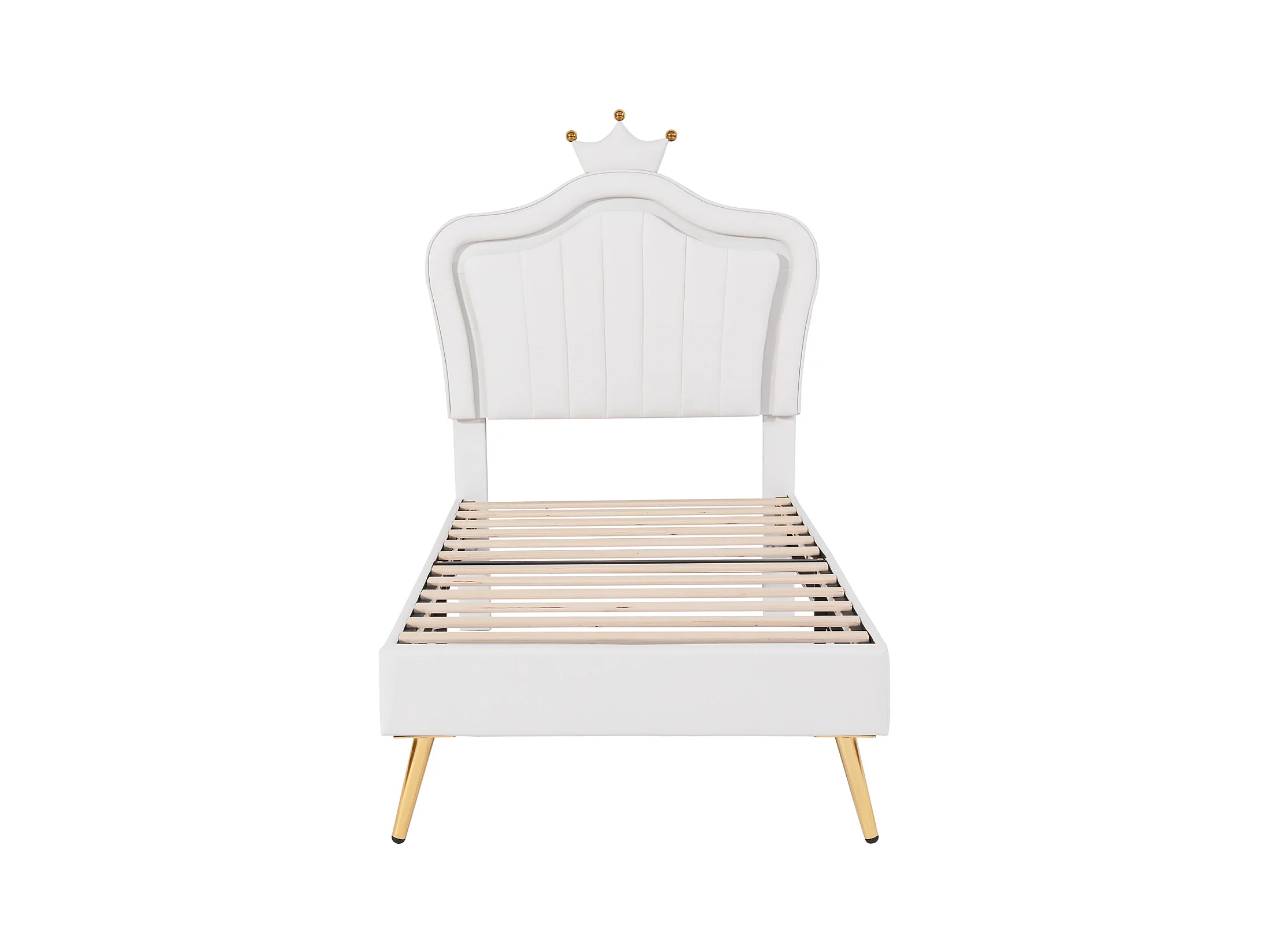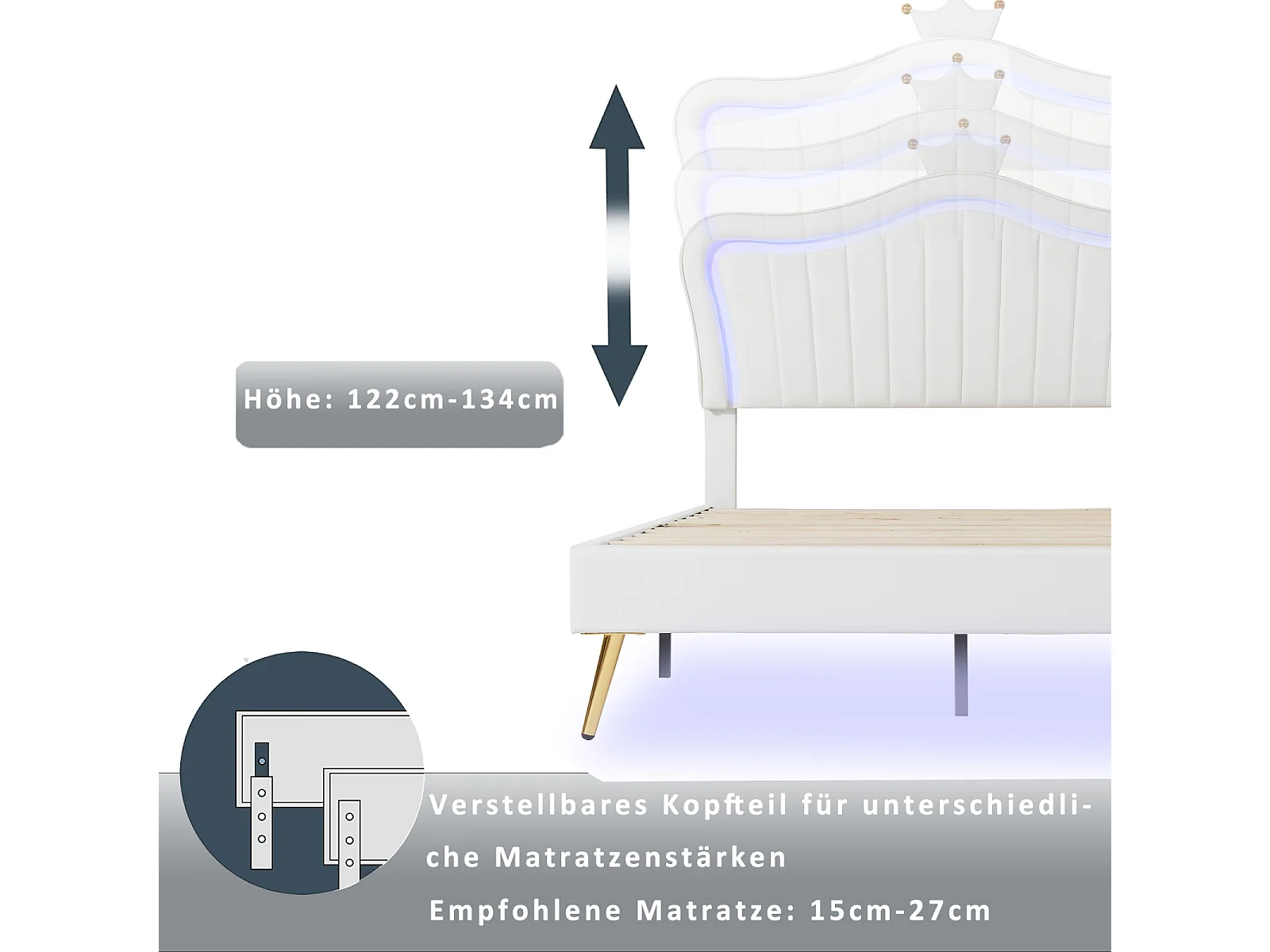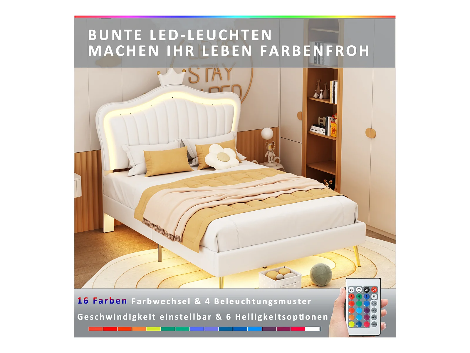 Cama infantil 90x200 cm - Estrutura de cama para meninas com luzes LED - Design de coroa - Couro PU - Branco