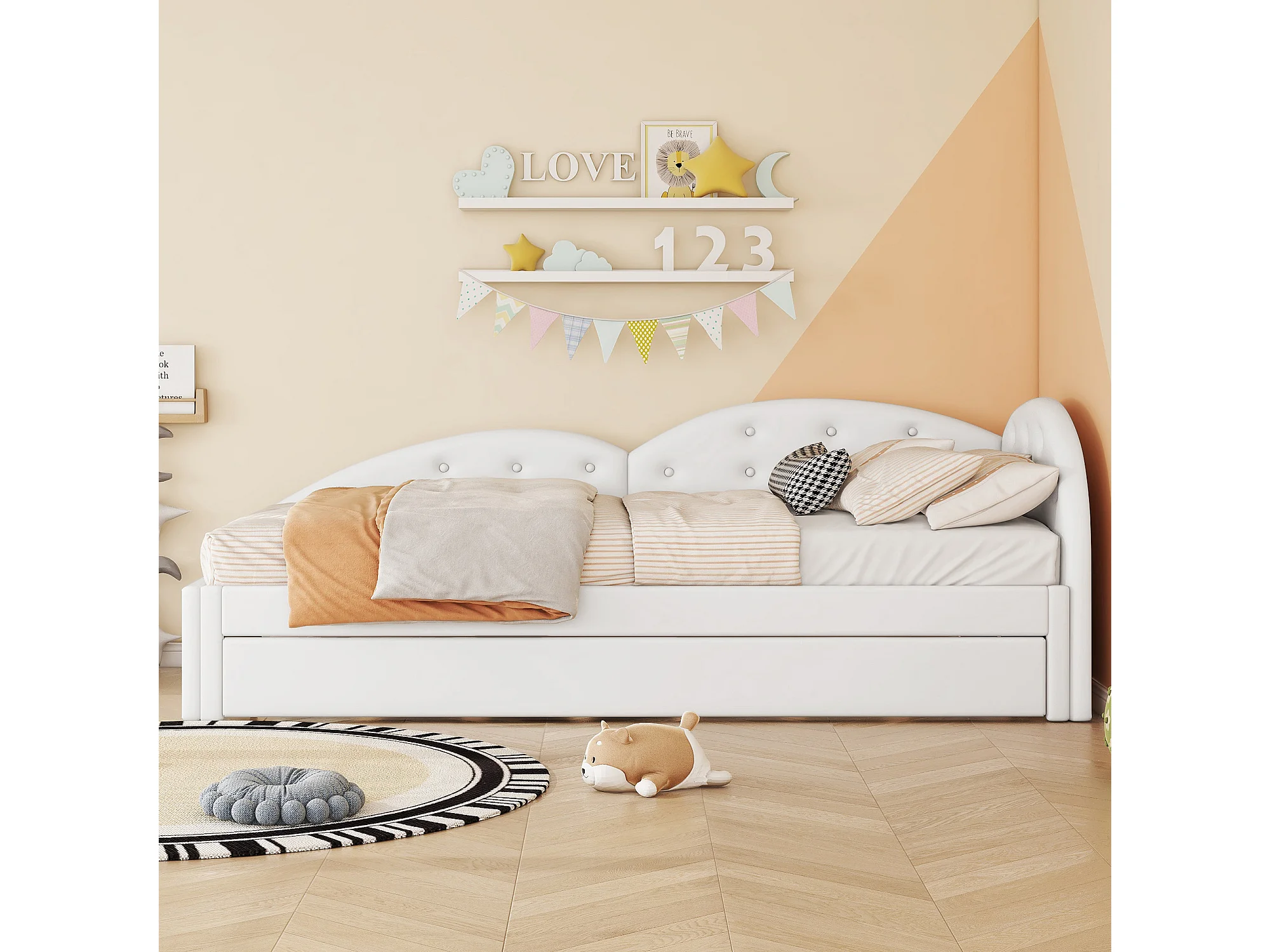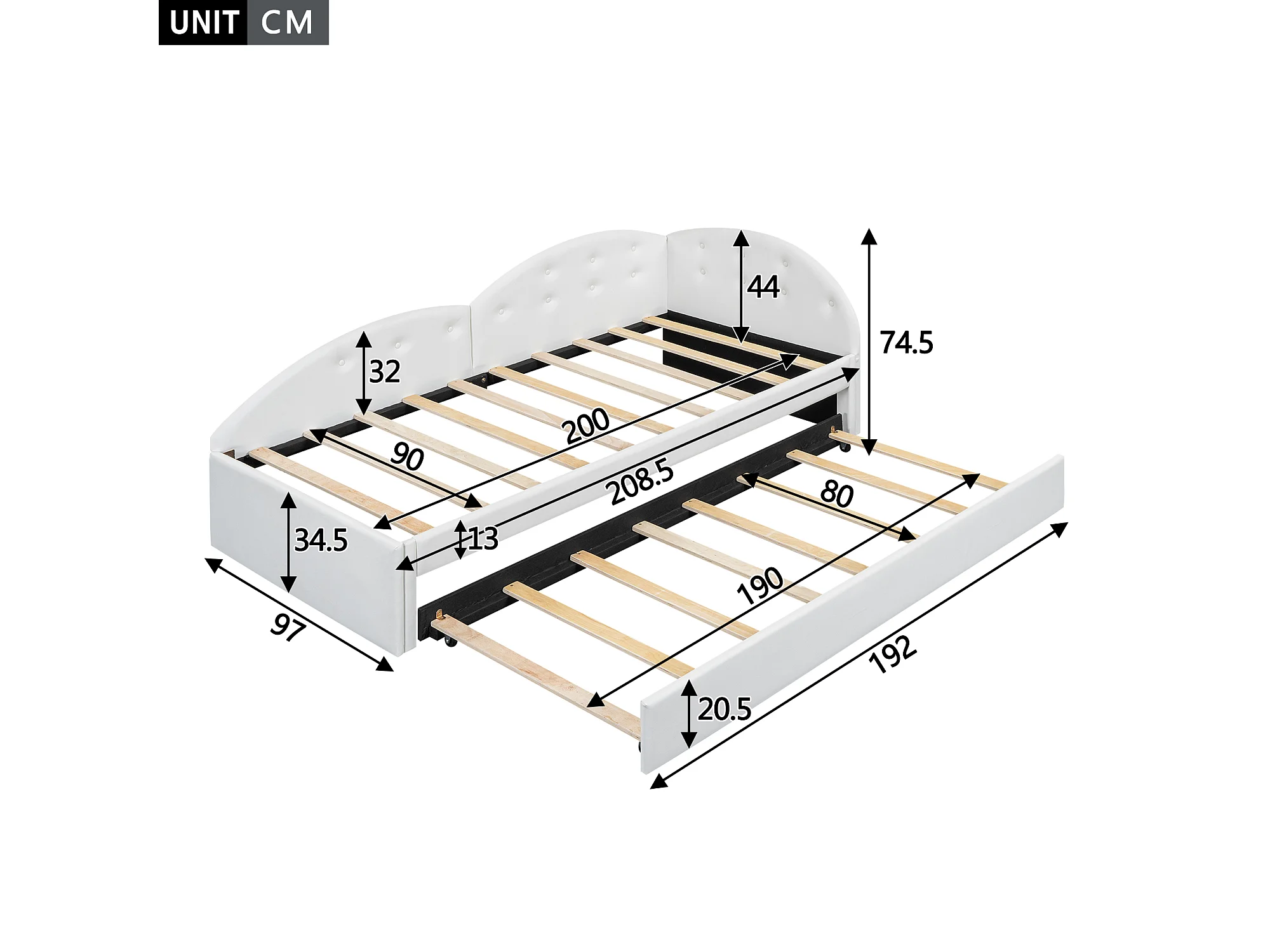 Cama infantil 90x200cm com bicama 80x190cm em PU, estrado de ripas, sem colchão, branco