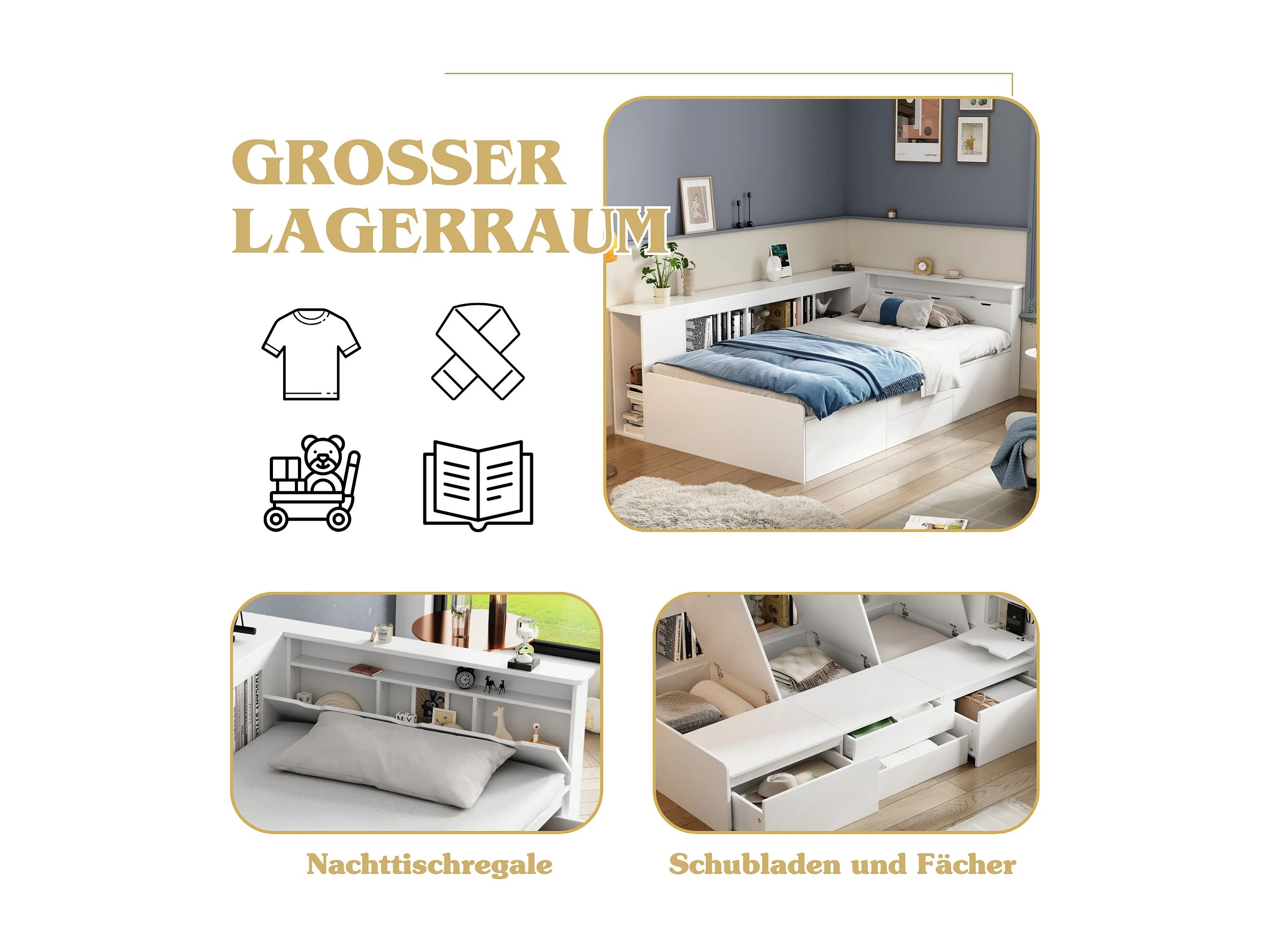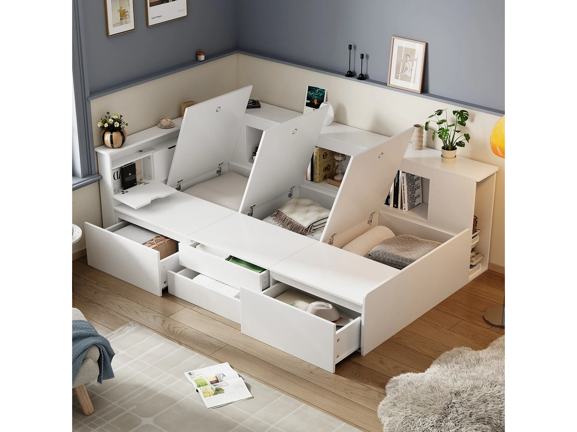 Cama infantil 90x200cm MDF branco com gavetas estante e arrumação integrada sem colchão