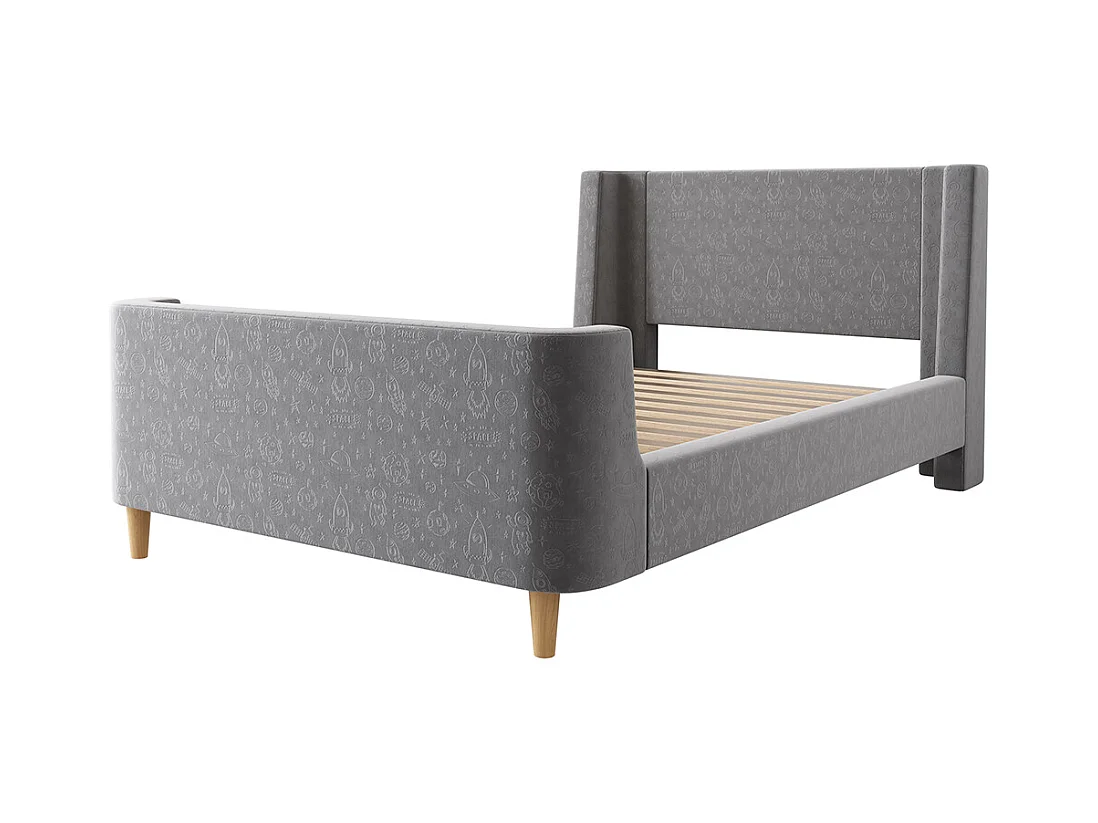 Cama infantil estofada 90 x 200 cm, com estrado de ripas, encosto e braços, cinza