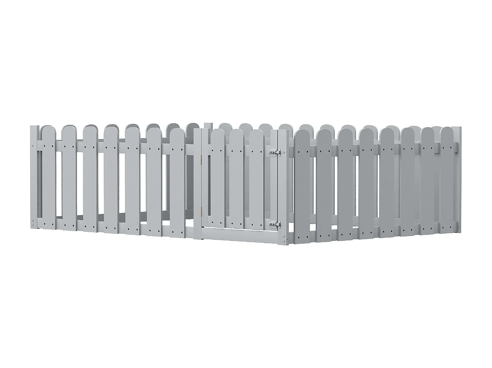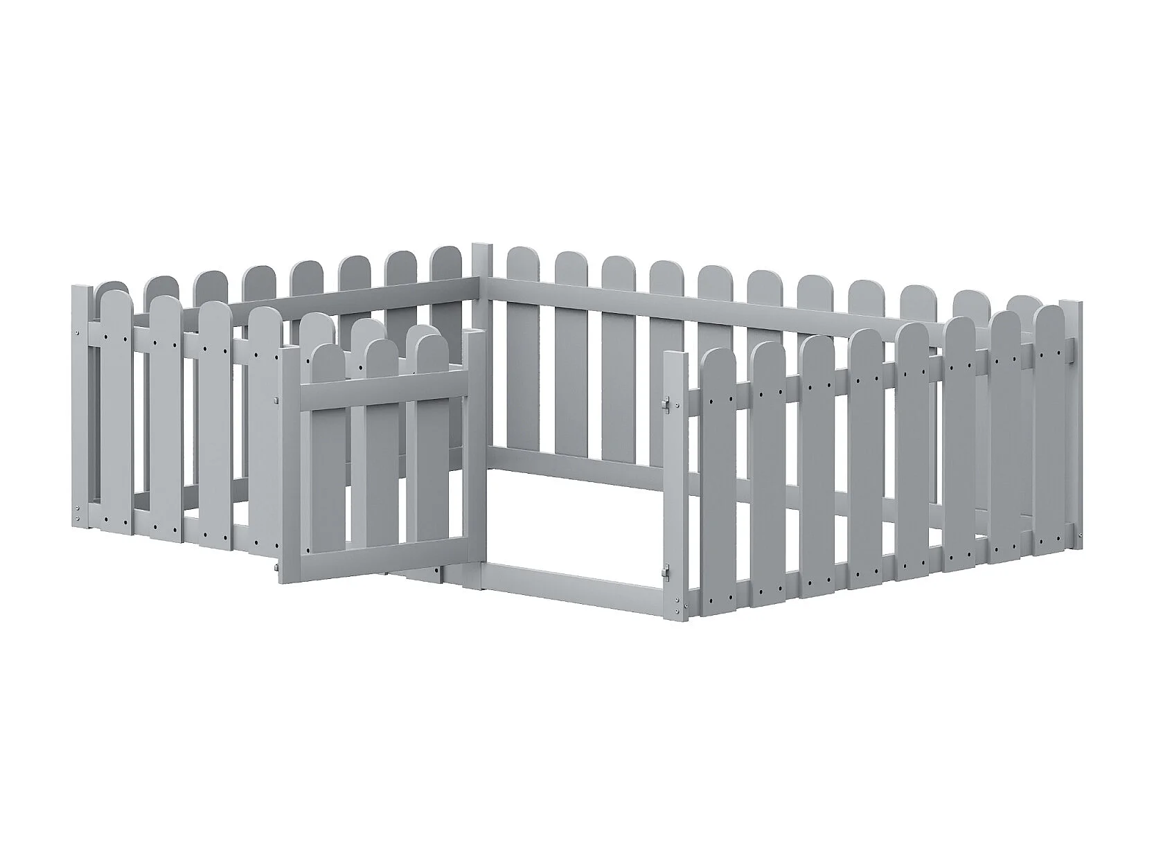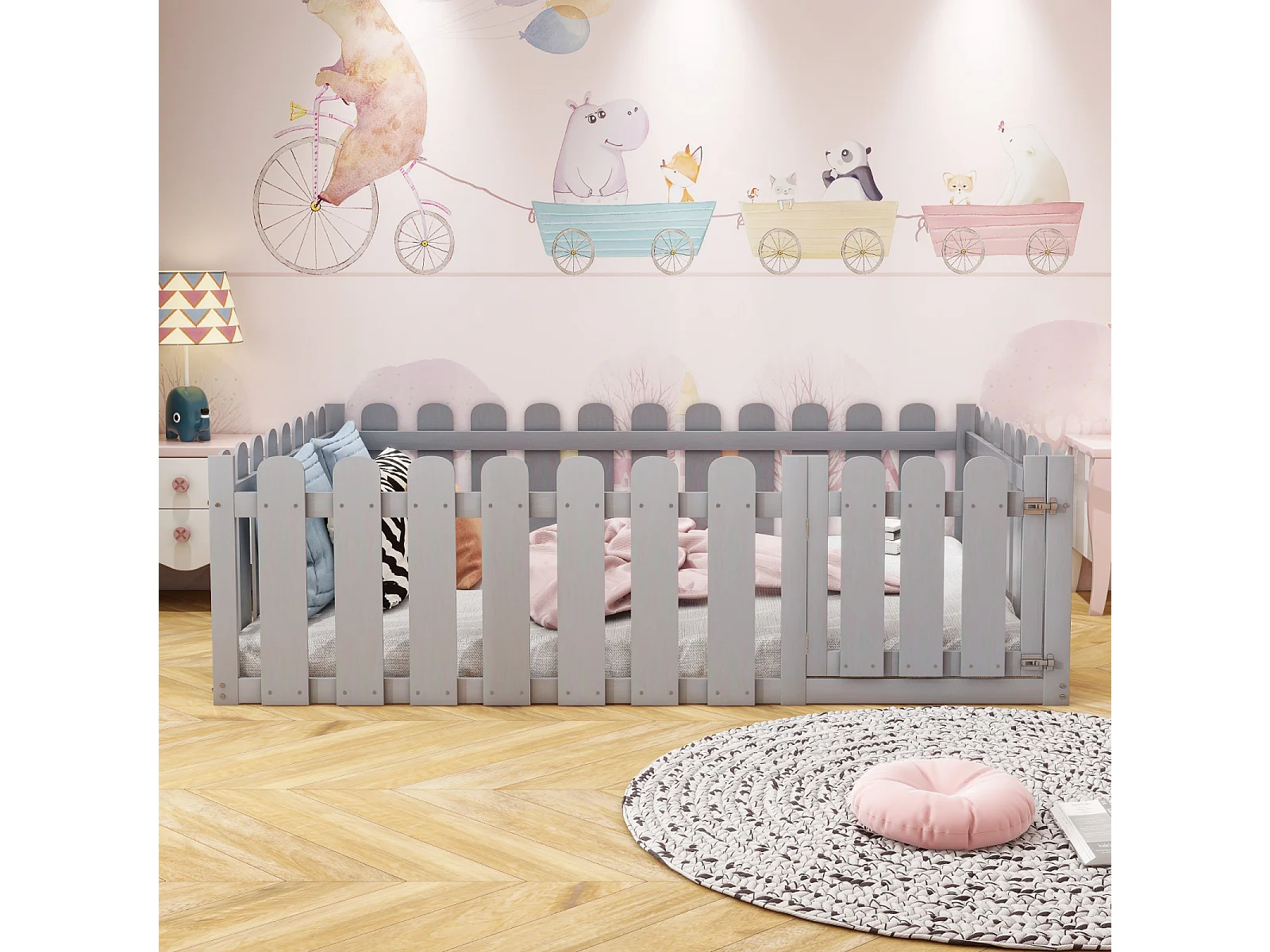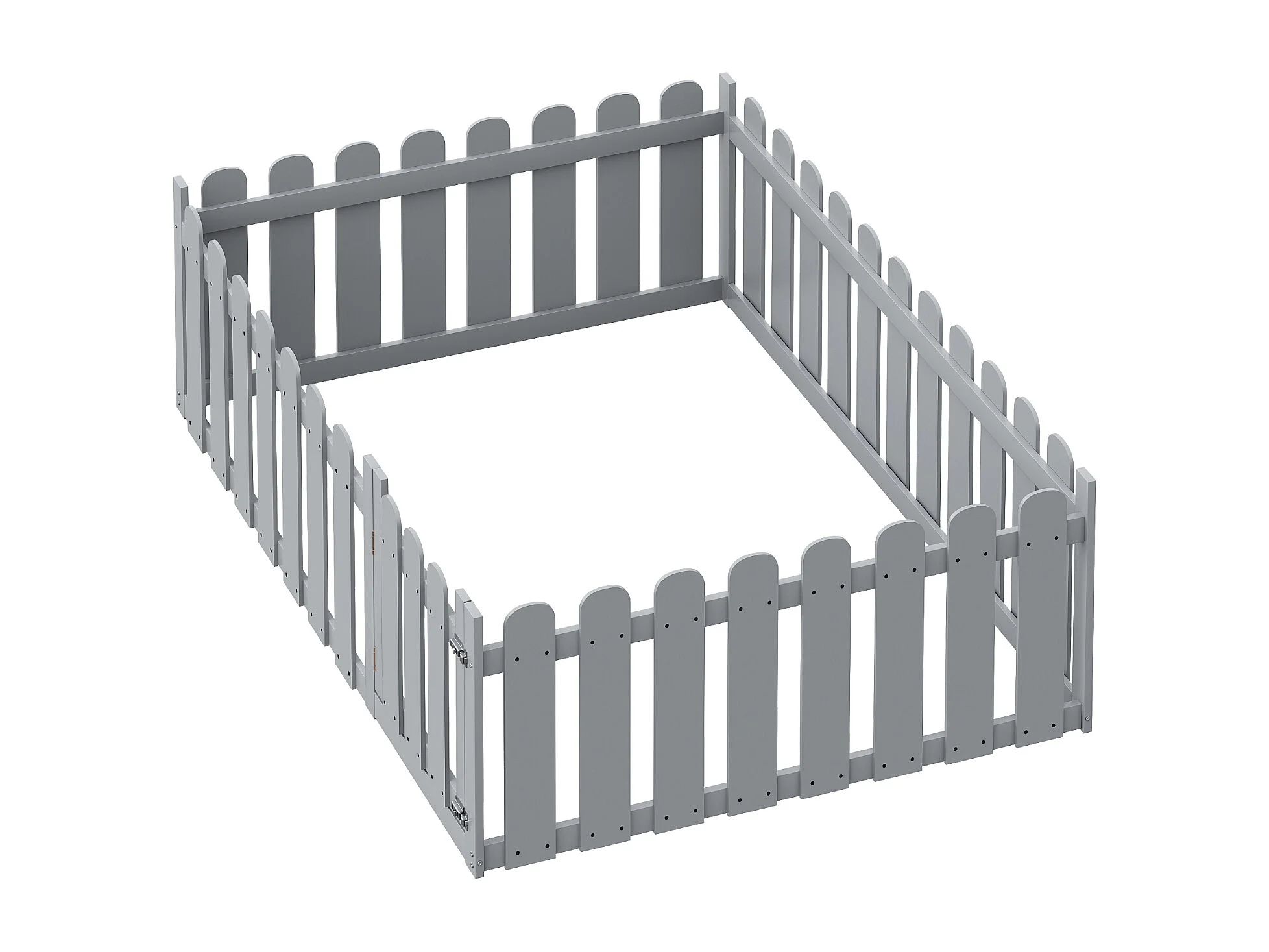 Cama infantil de madeira, 140x200 cm, com grades de proteção e porta pequena, estrutura robusta e segura, cor cinza.