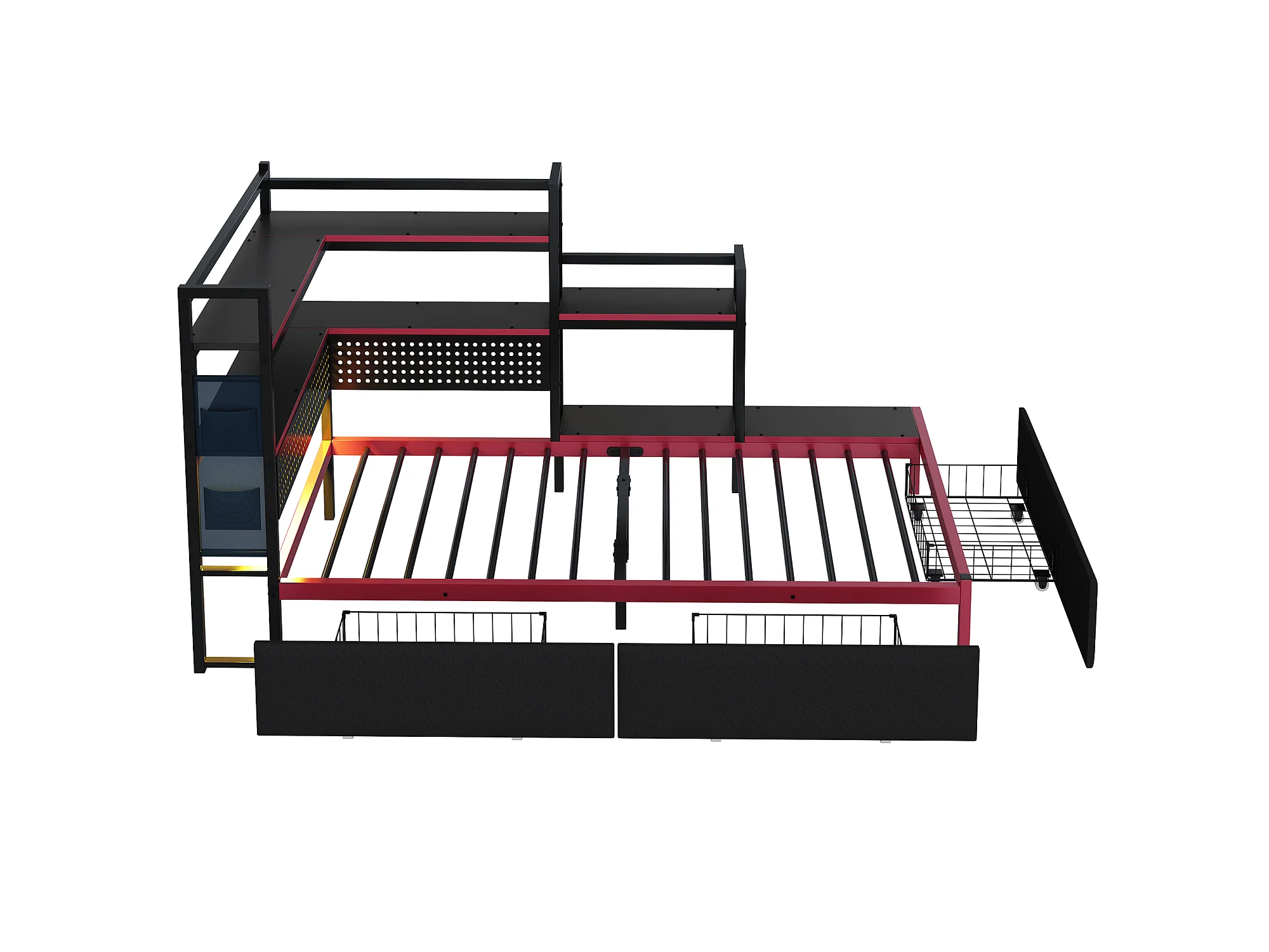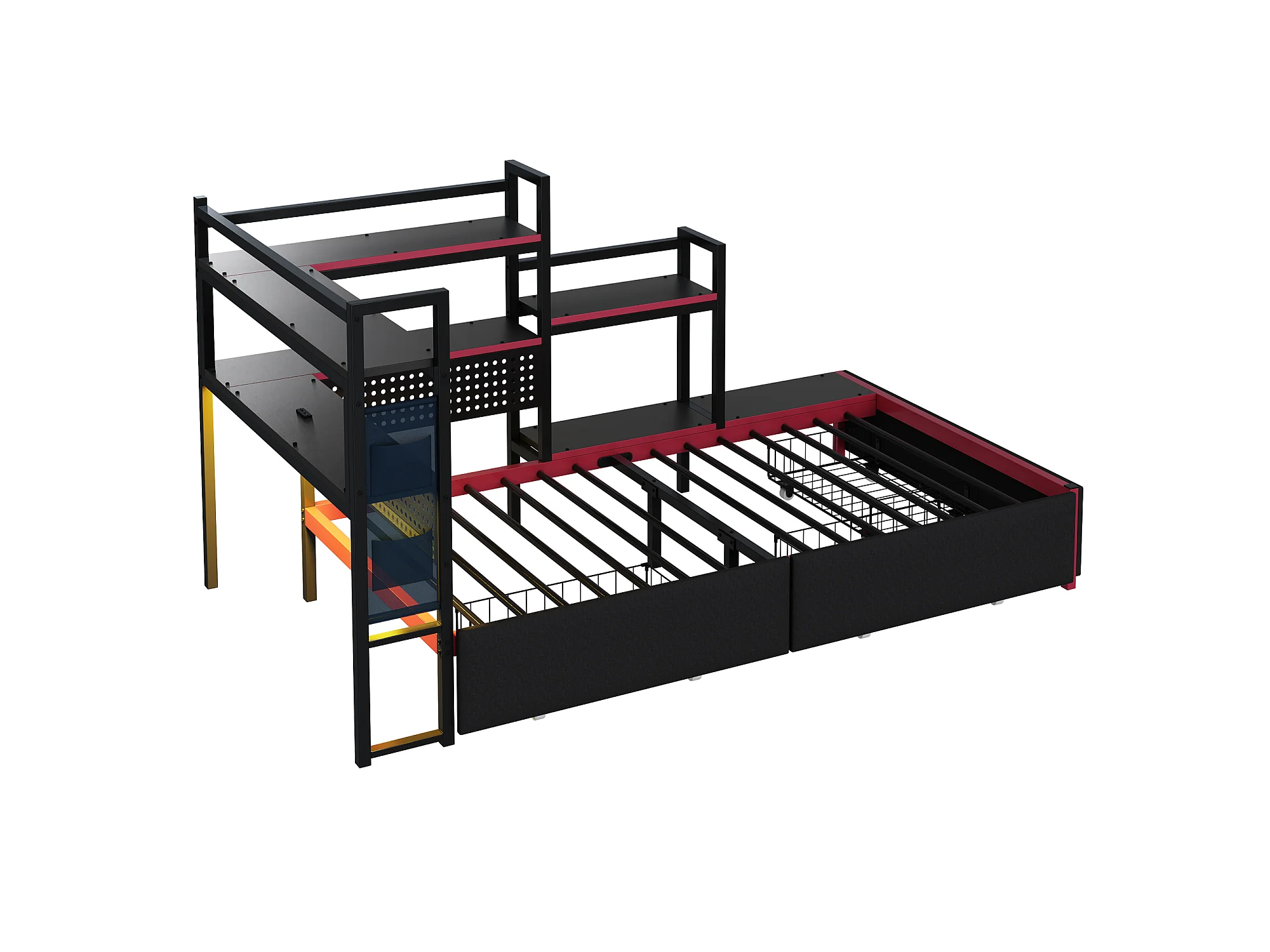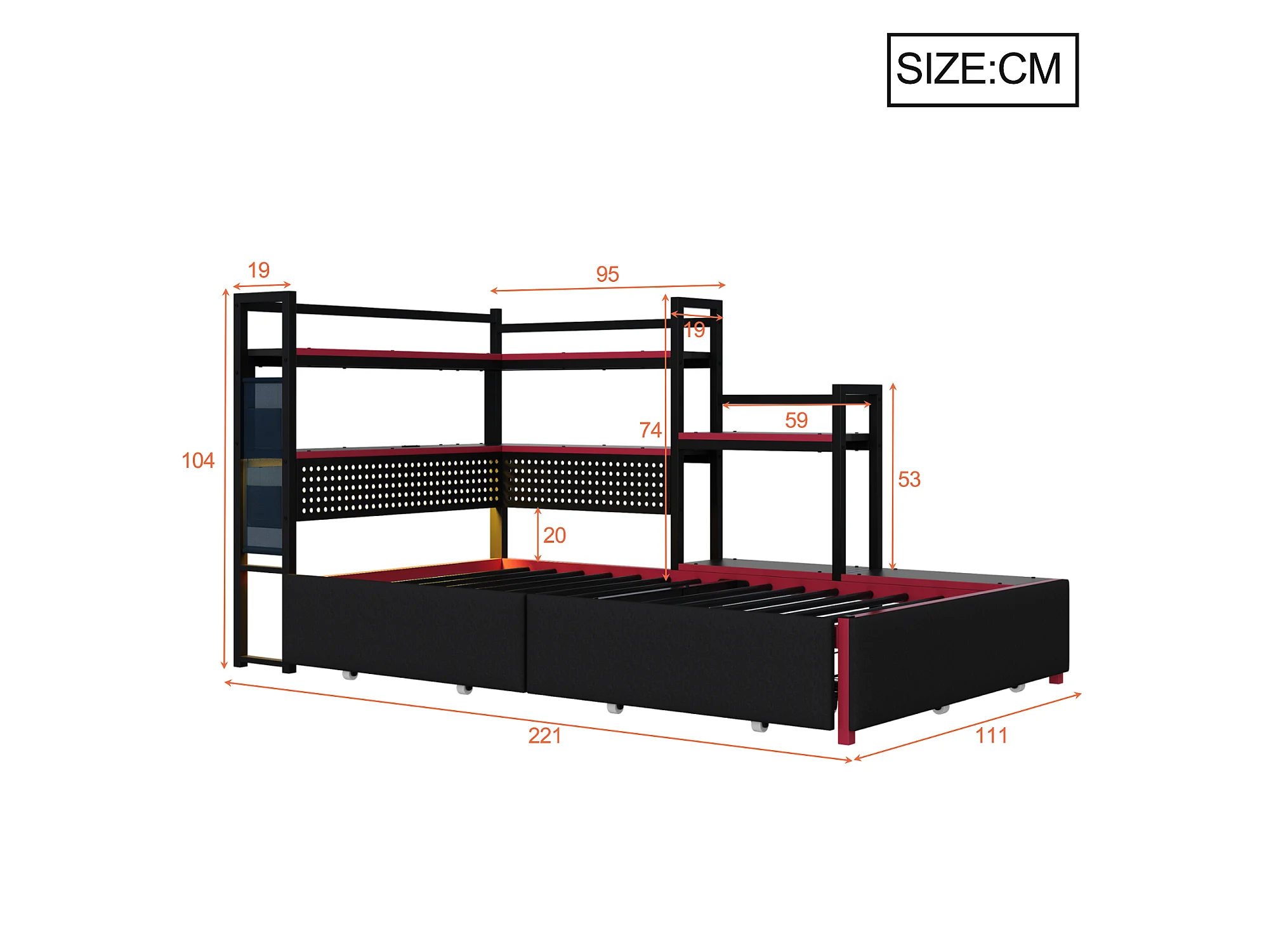 Cama infantil de metal 90x200 cm - com 3 gavetas - com luz LED - com porta USB - com prateleira de armazenamento - preta (colchão não incluído)