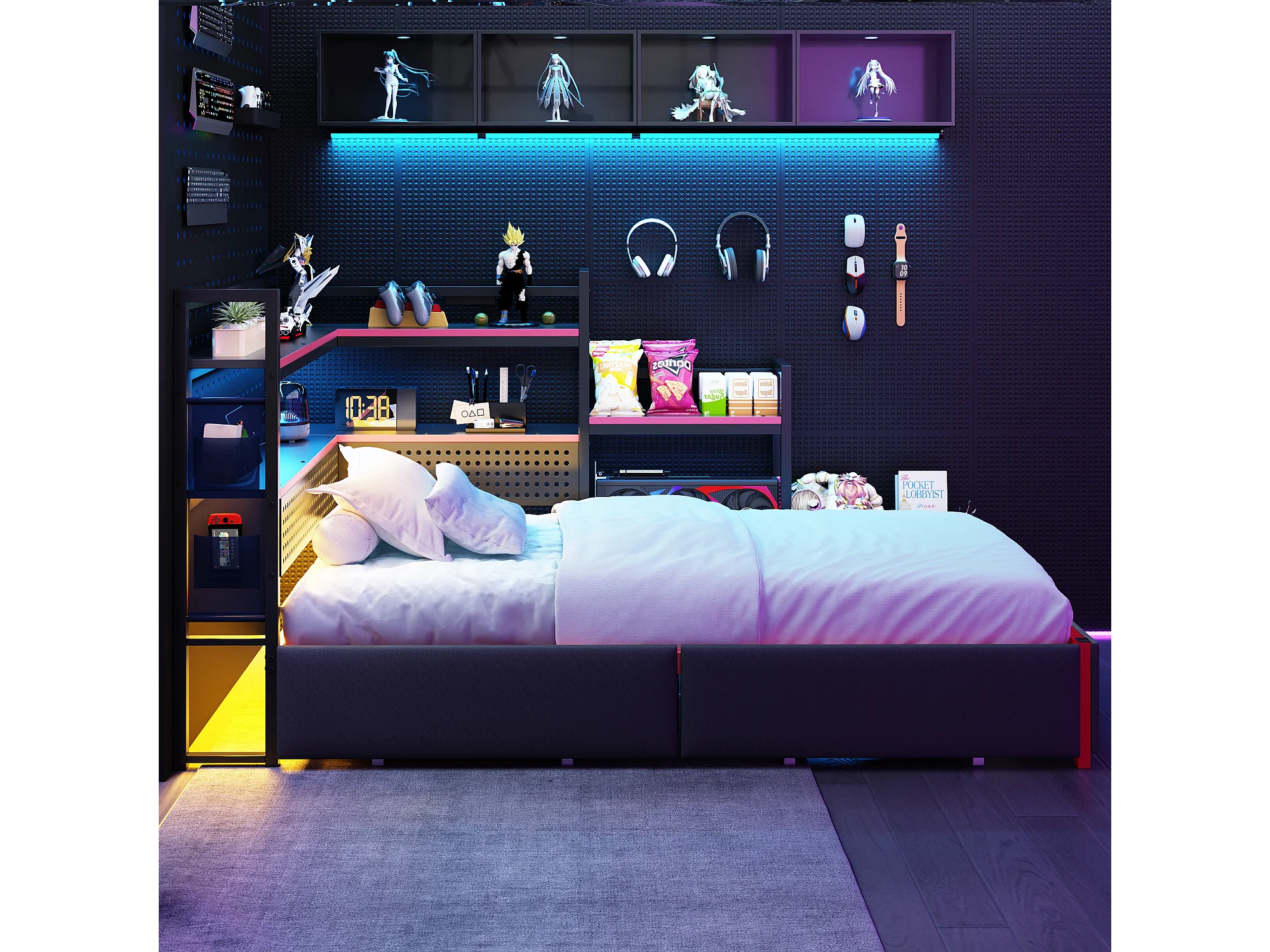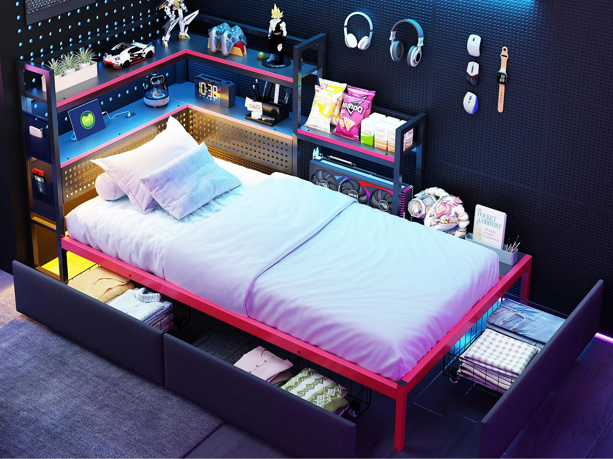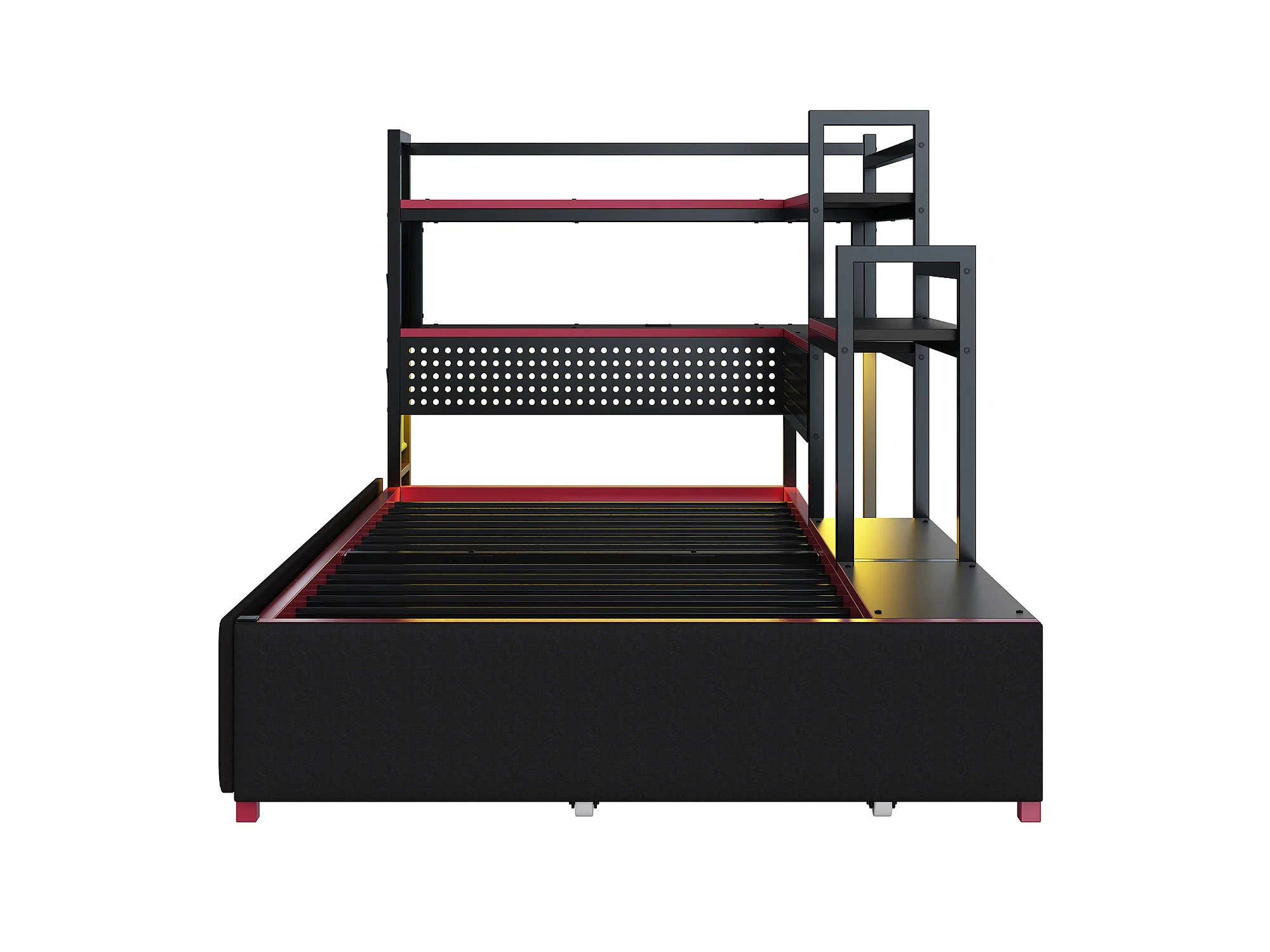 Cama infantil de metal 90x200 cm - com 3 gavetas - com luz LED - com porta USB - com prateleira de armazenamento - preta (colchão não incluído)