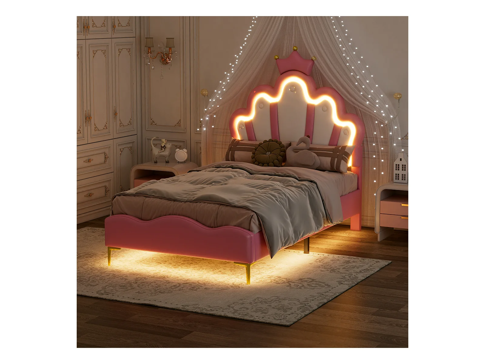 Cama infantil estofada 90 x 200 cm com LED, cama princesa, poliuretano, rosa