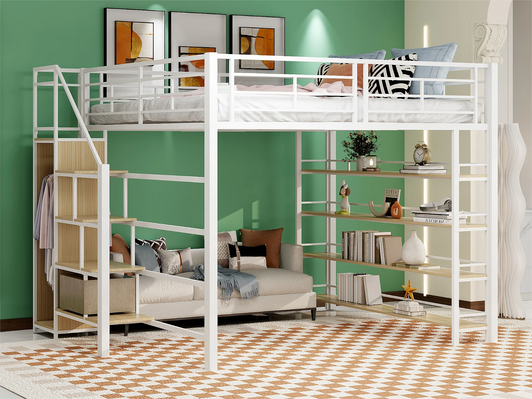 Cama mezanino 140x200 cm - com pequeno guarda-roupa e prateleiras de arrumação - Branco