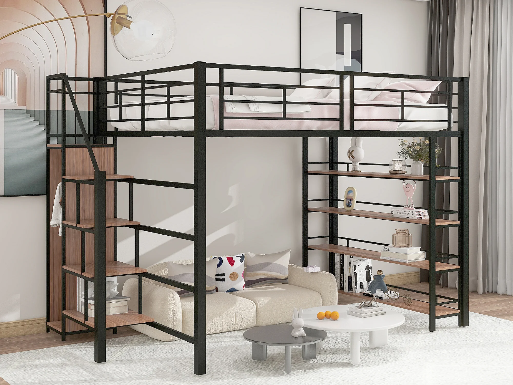 Cama mezanino 140x200 cm - com pequeno guarda-roupa e prateleiras de arrumação - Preto
