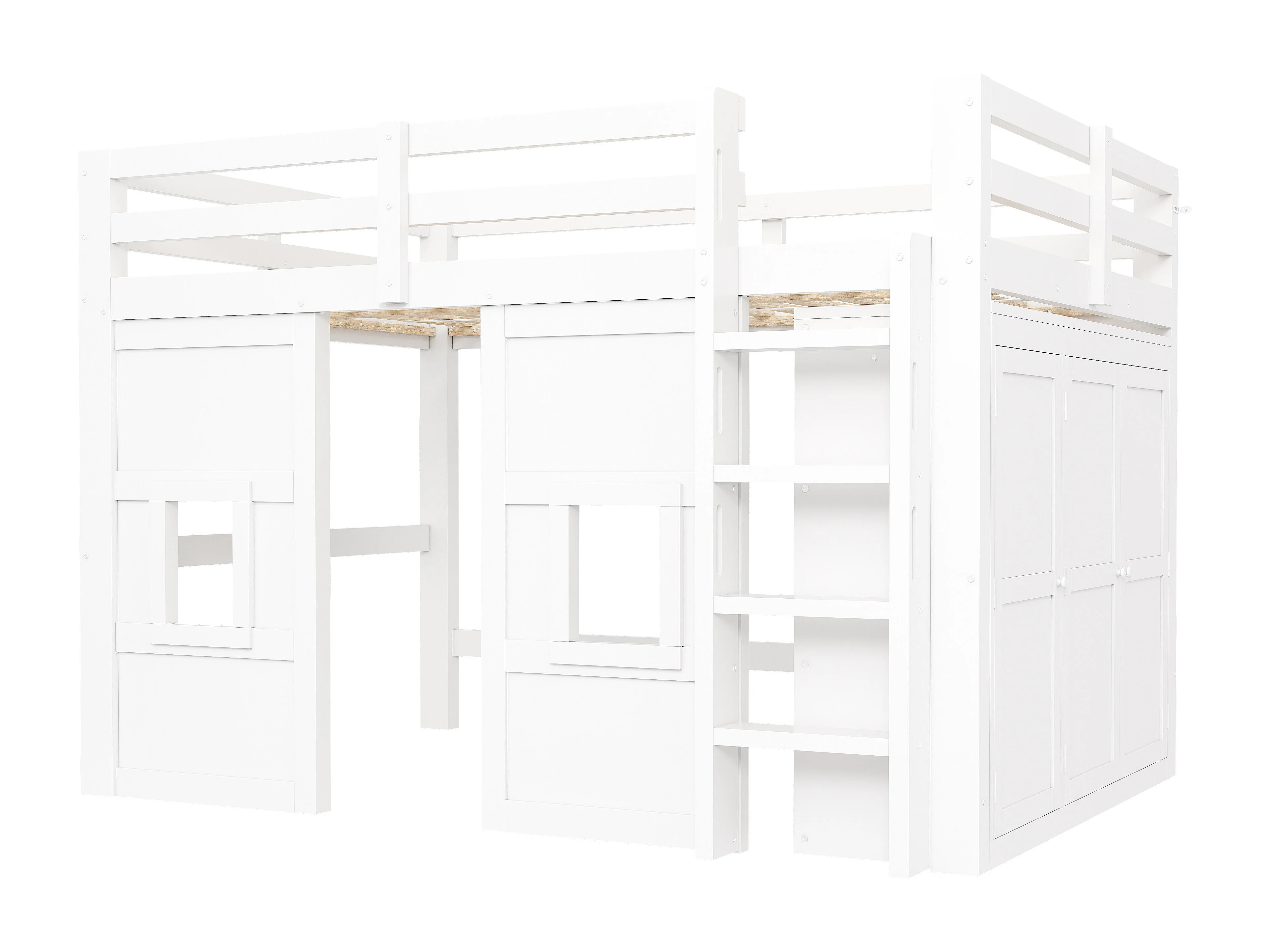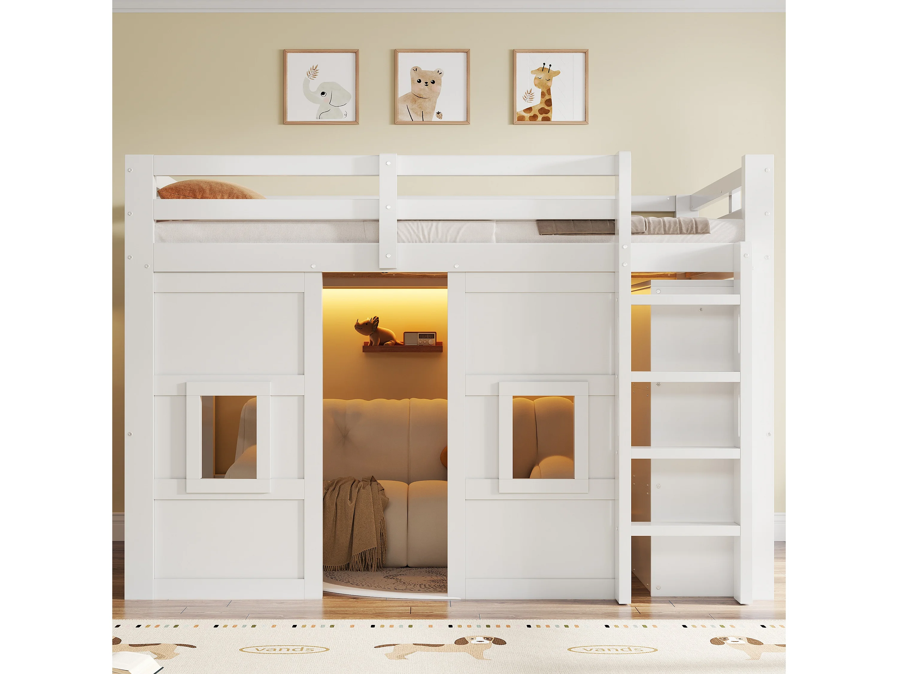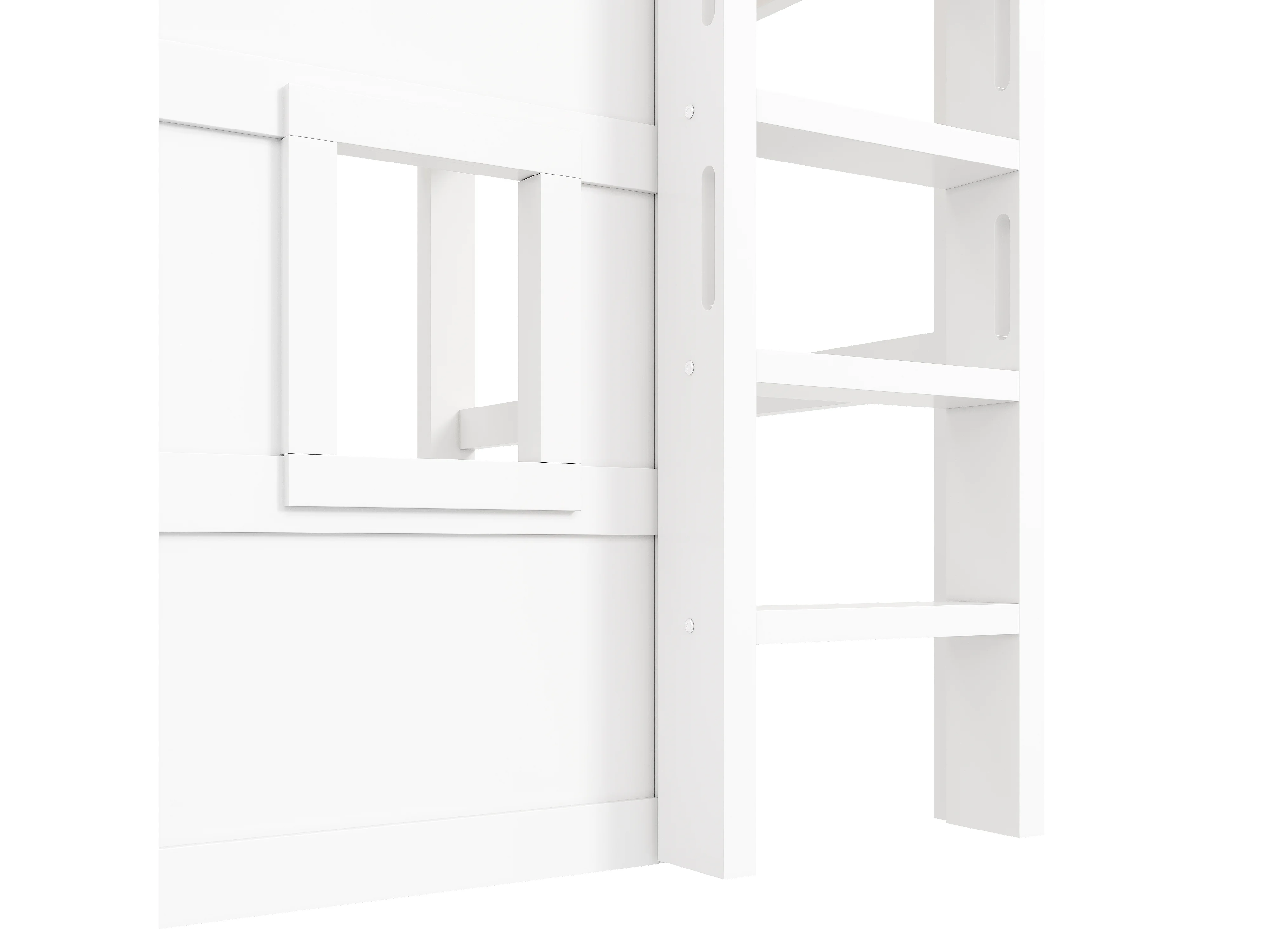 Cama mezanino de madeira 140x200 cm con iluminação LED - Armário integrado - Barreira de segurança e escada - MDF - Branco​ (sem colchão)