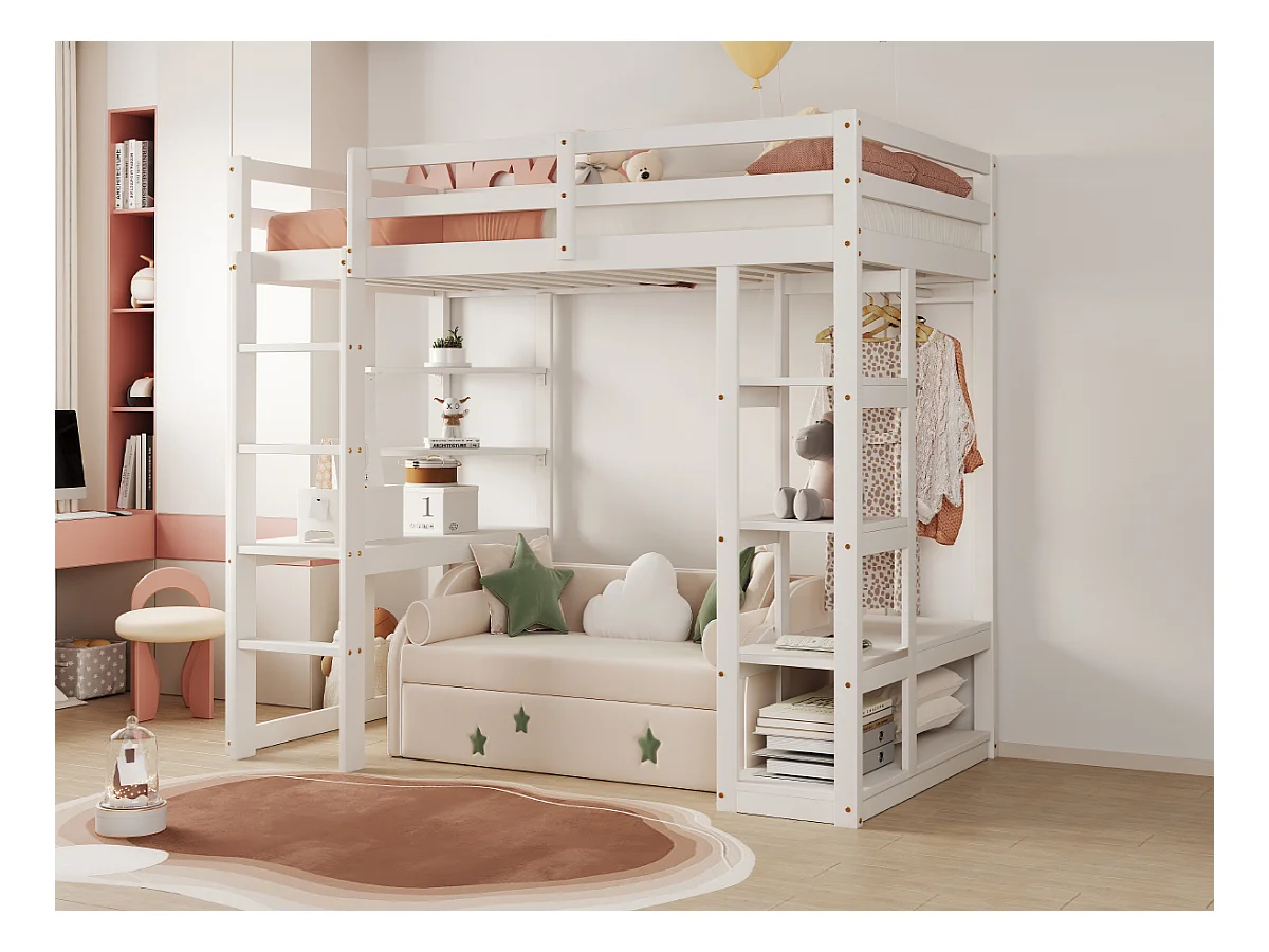 Cama mezanino de madeira maciça 90x200cm com escrivaninha, prateleiras, cabideiro, branco