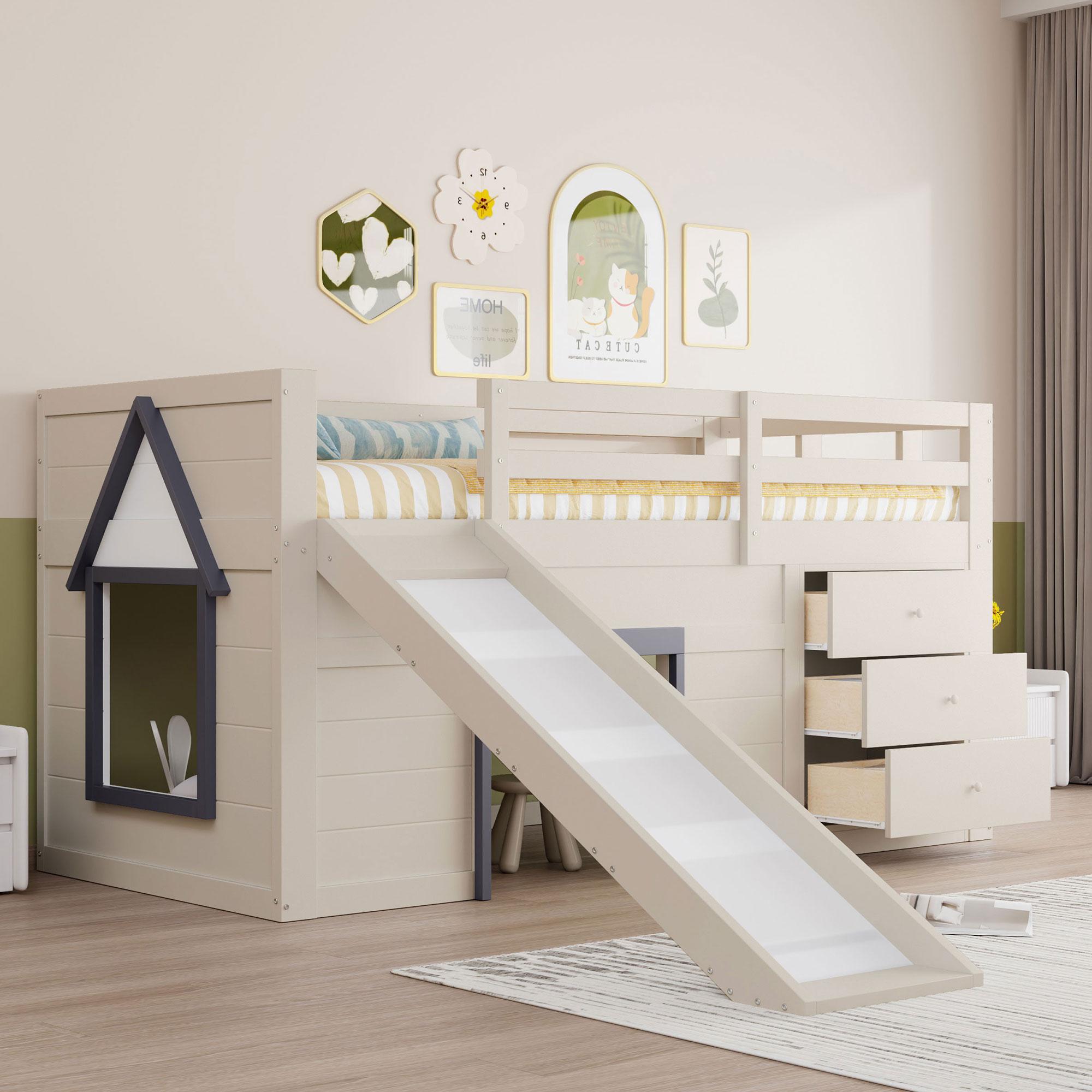 Cama mezanino de madeira maciça de 90x200 cm com corrediça, arrumação e portas creme