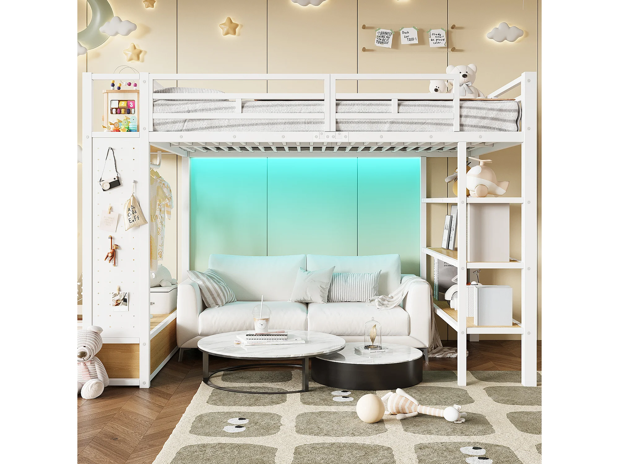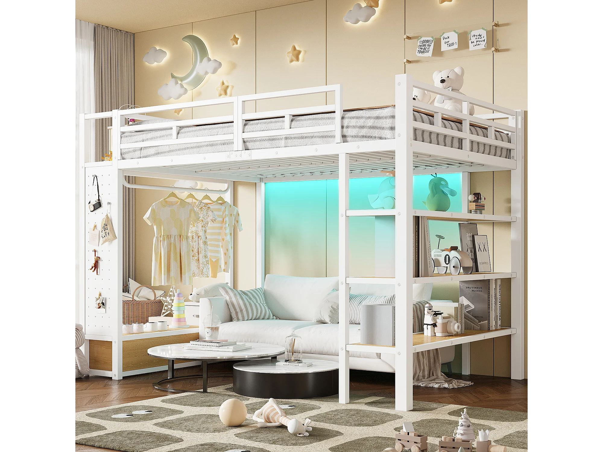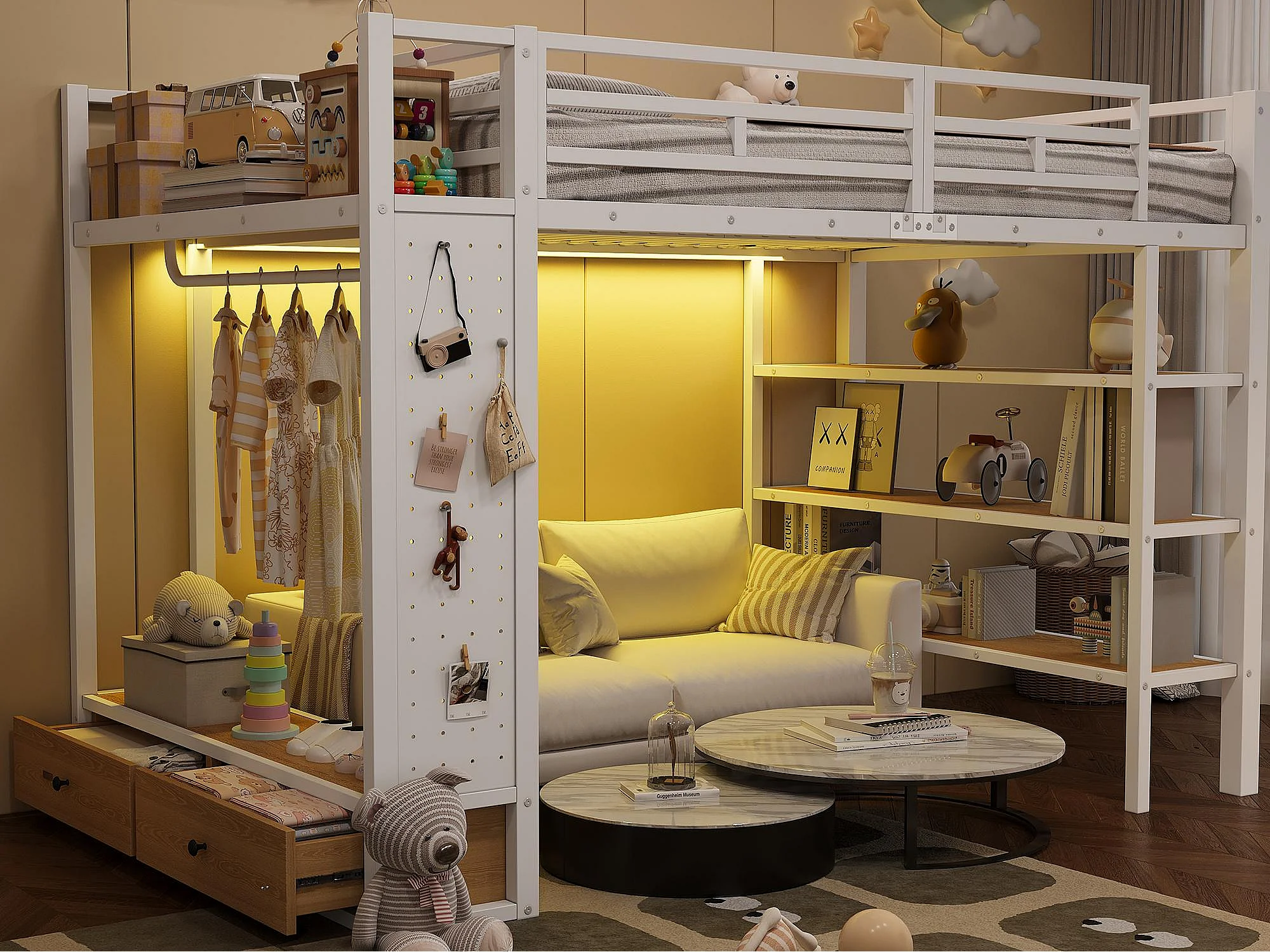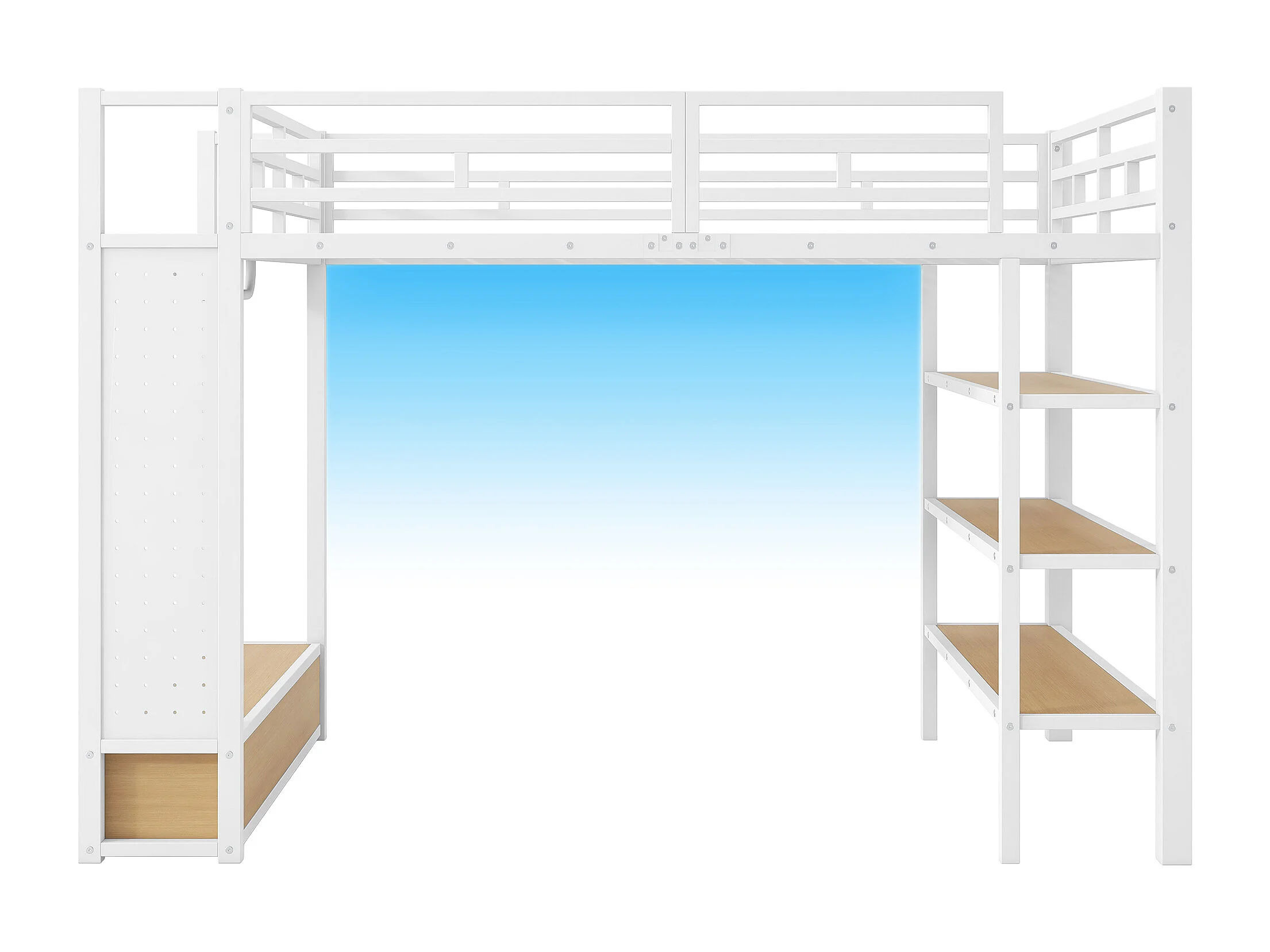 Cama mezanino de metal 140x200cm con LED - armário aberto e 2 gavetas - Prateleiras + painéis de armazenamento - Branco​ (sem colchão)