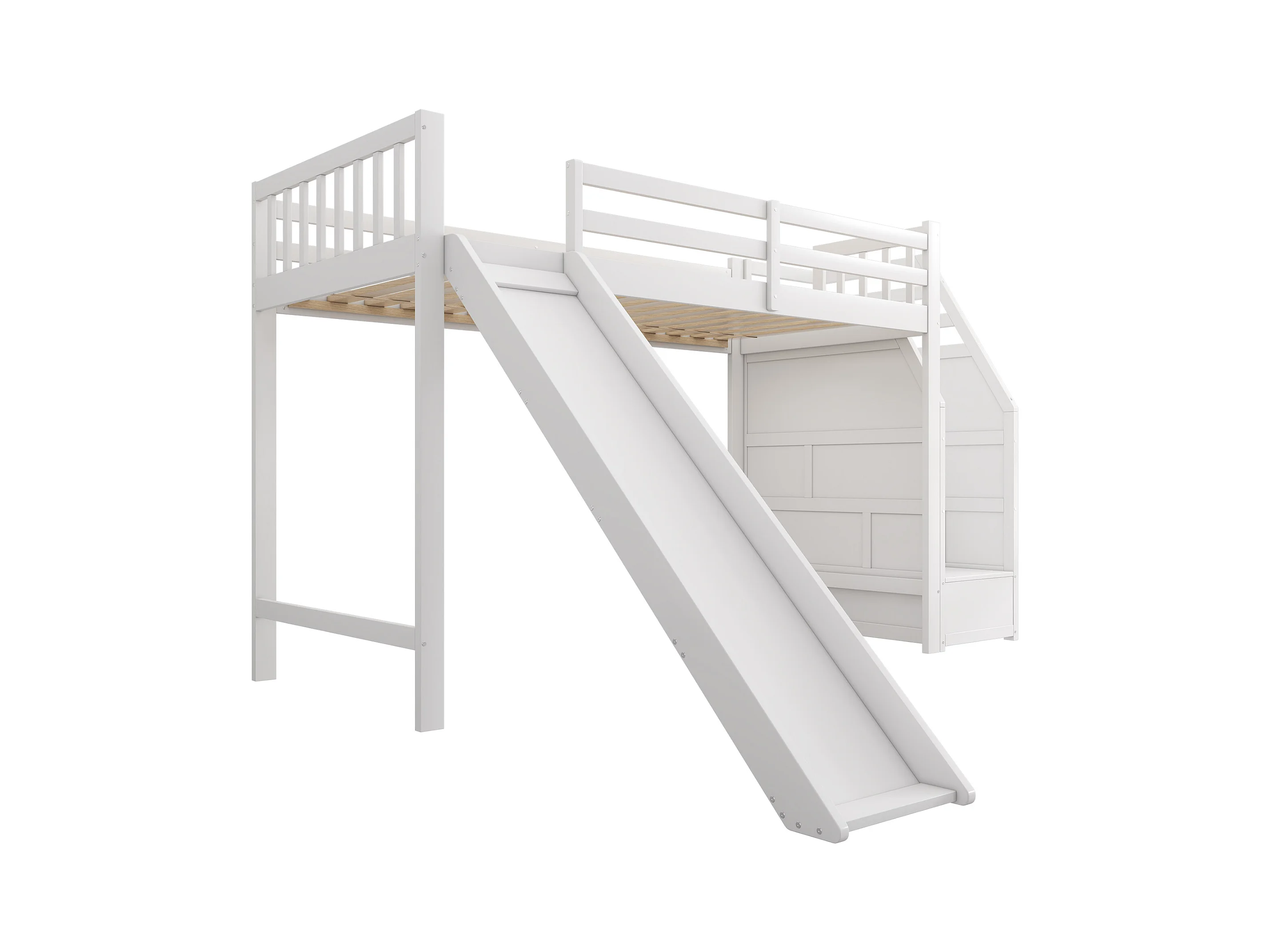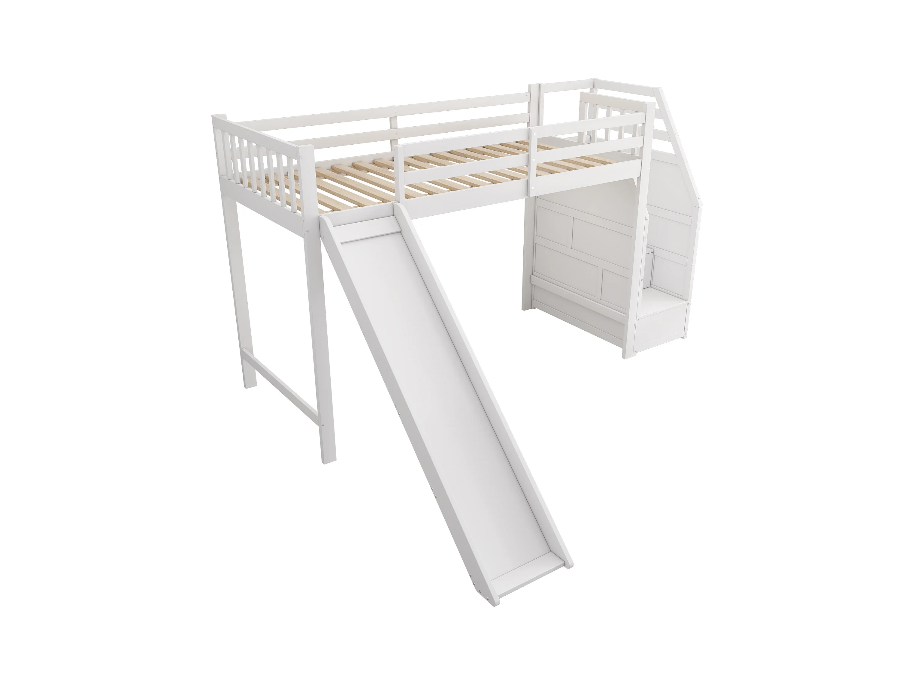 Cama mezanino infantil 90x200 madeira maciça com escorregador e escada de armazenamento branca