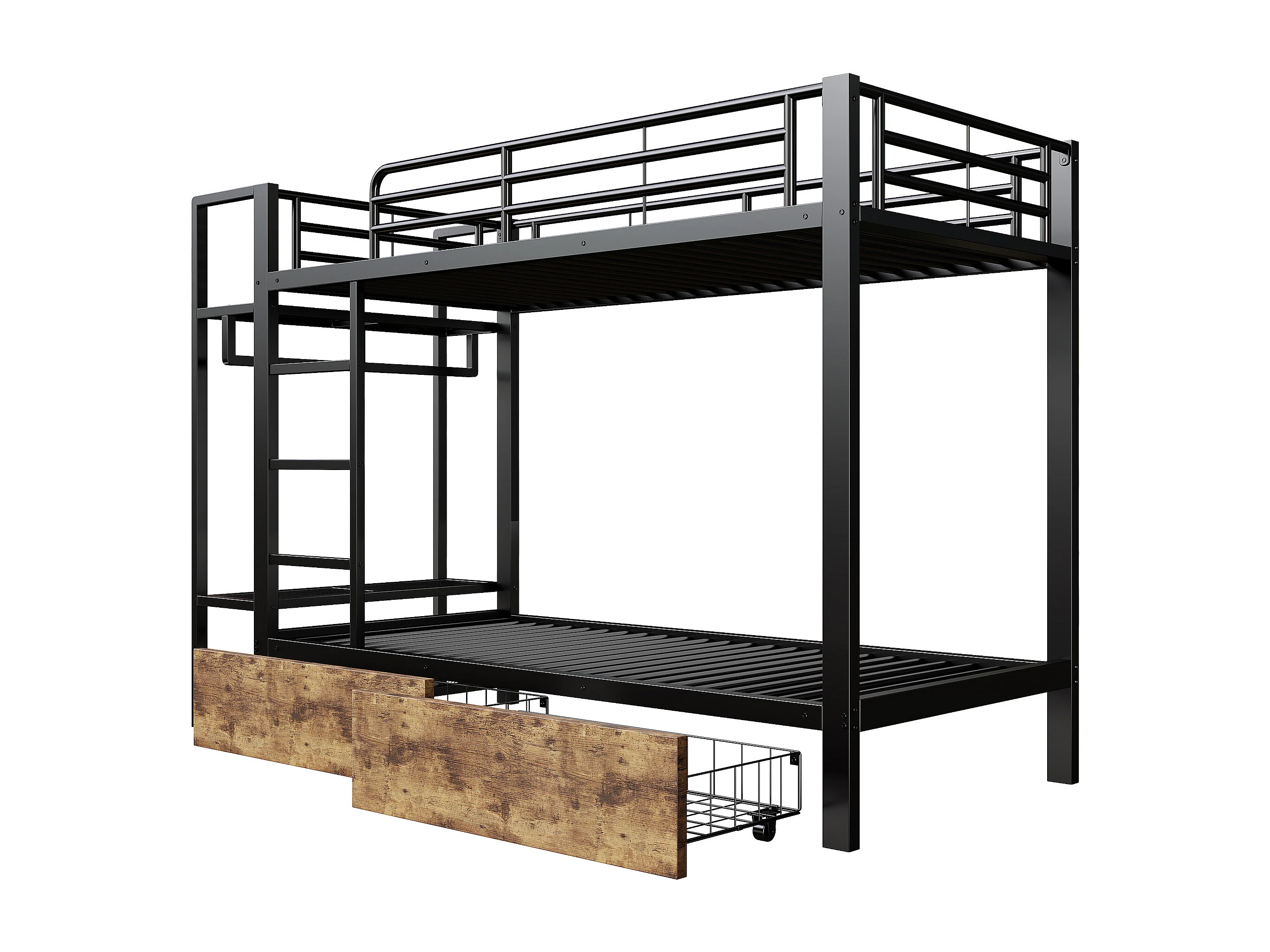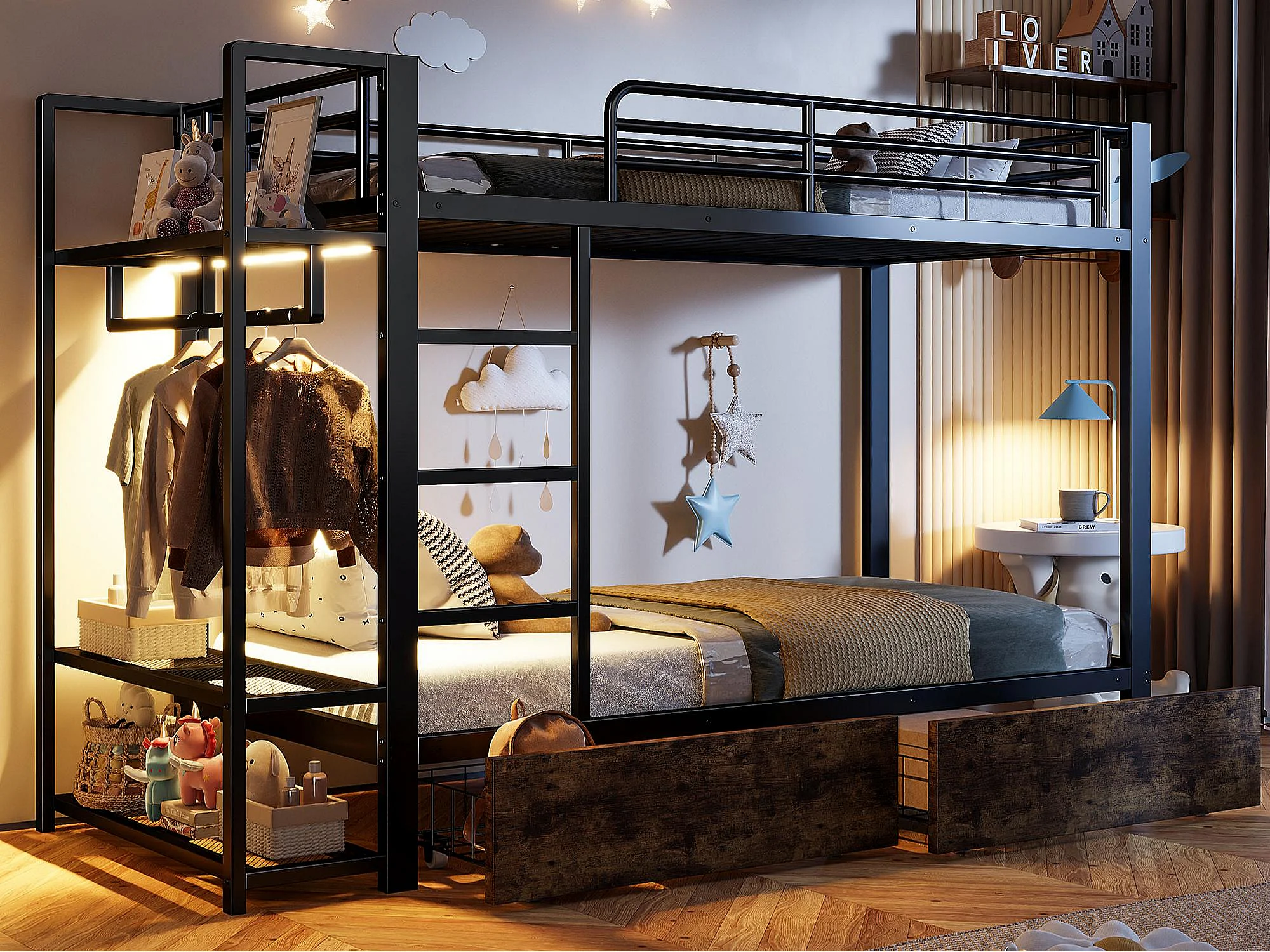 Cama sobreposta 90 x 200 cm - Estrutura de metal - 2 gavetas - Várias prateleiras - Iluminação LED - Cabideiro - preto​ (colchão não incluído)