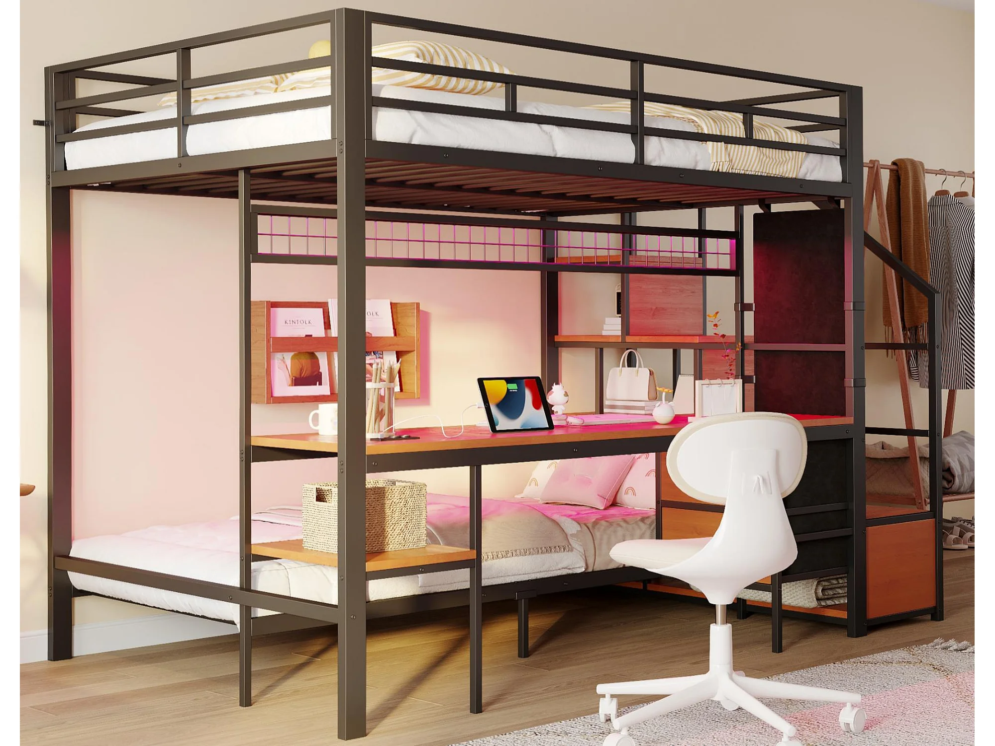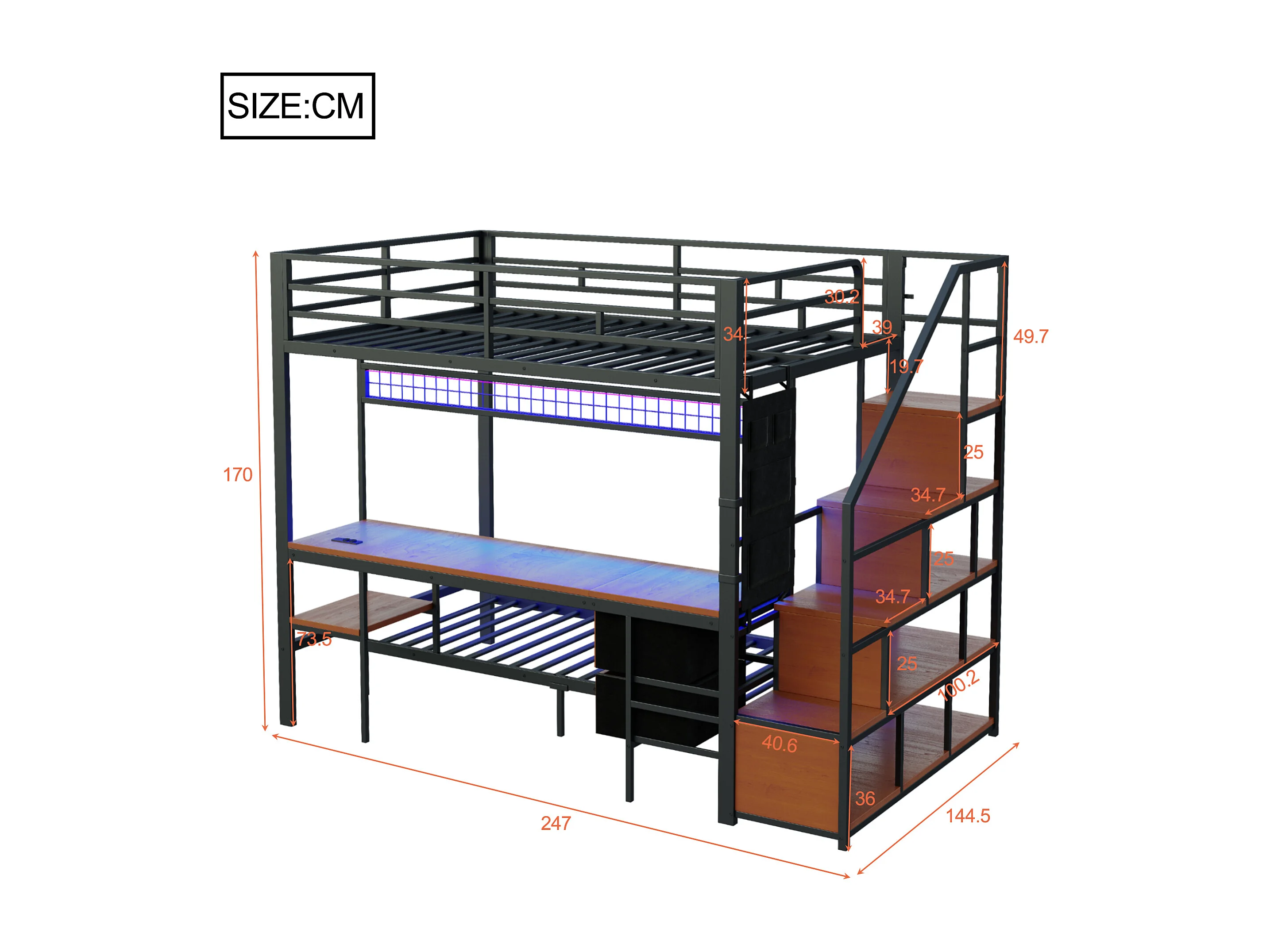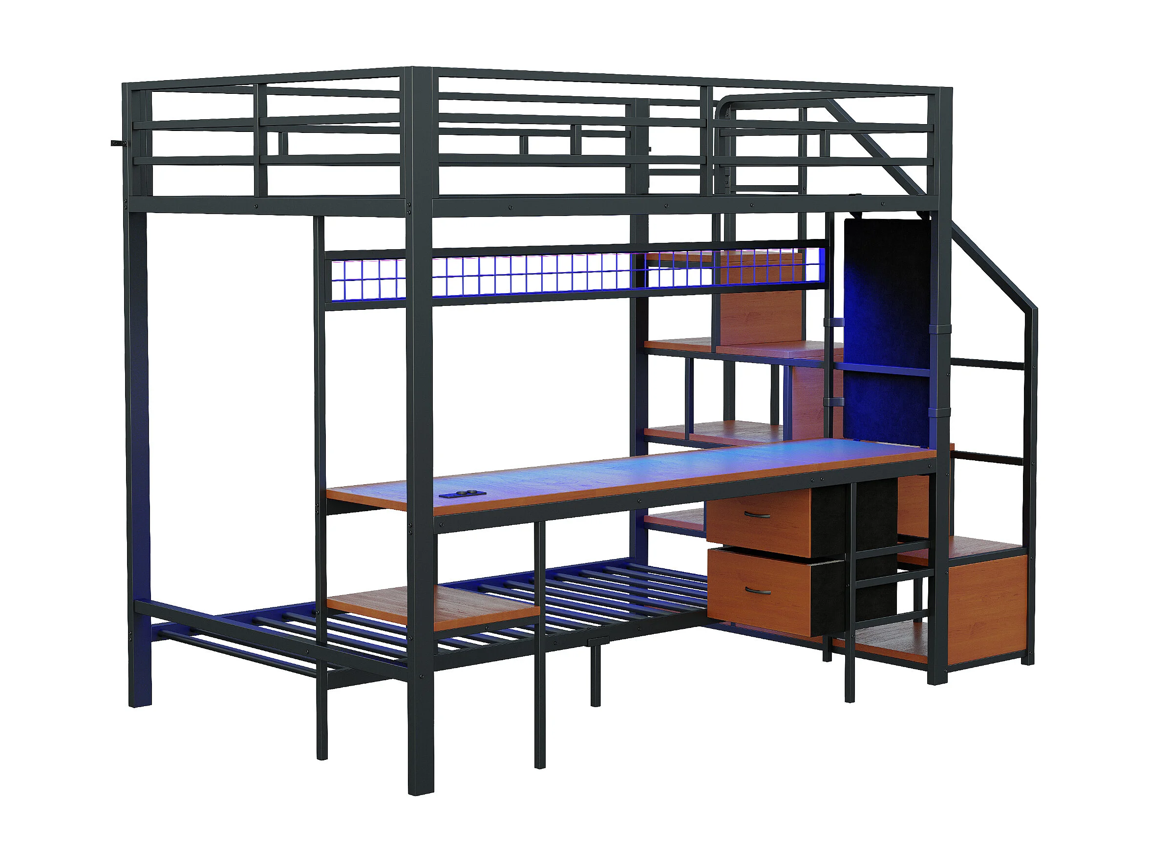 Cama sobreposta de metal 90x200cm + 140x200cm - con escrivaninha - iluminação LED - con tomada - con 2 gavetas - preto​ (colchão não incluído)